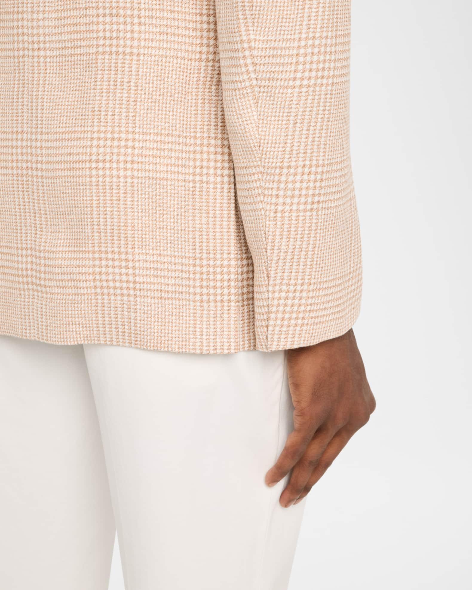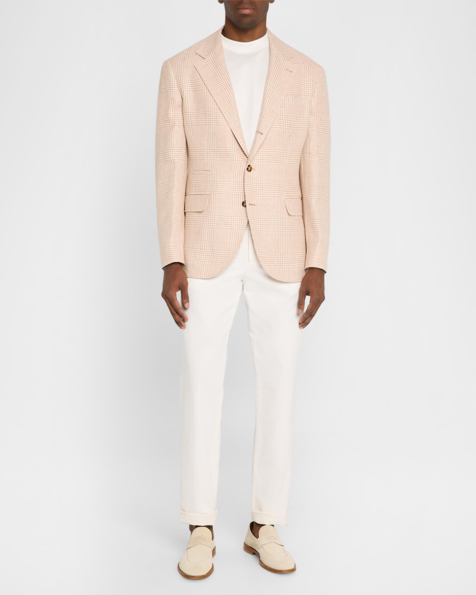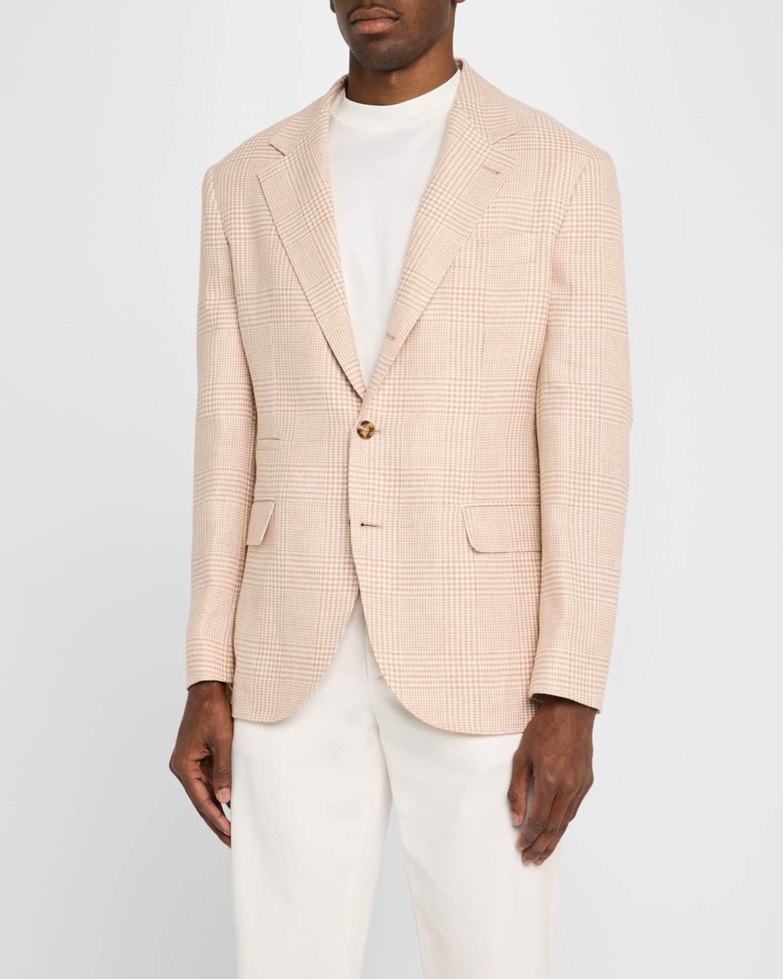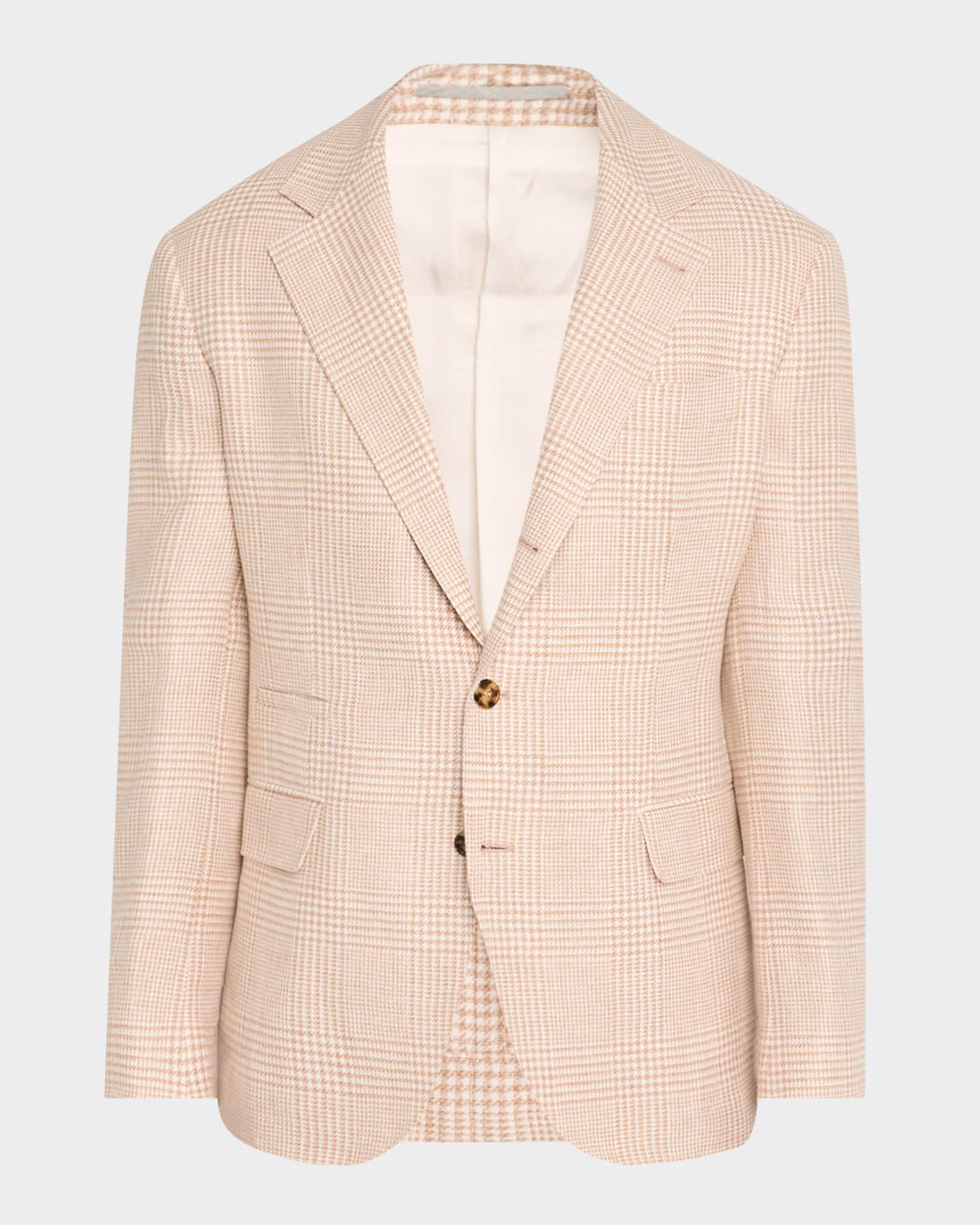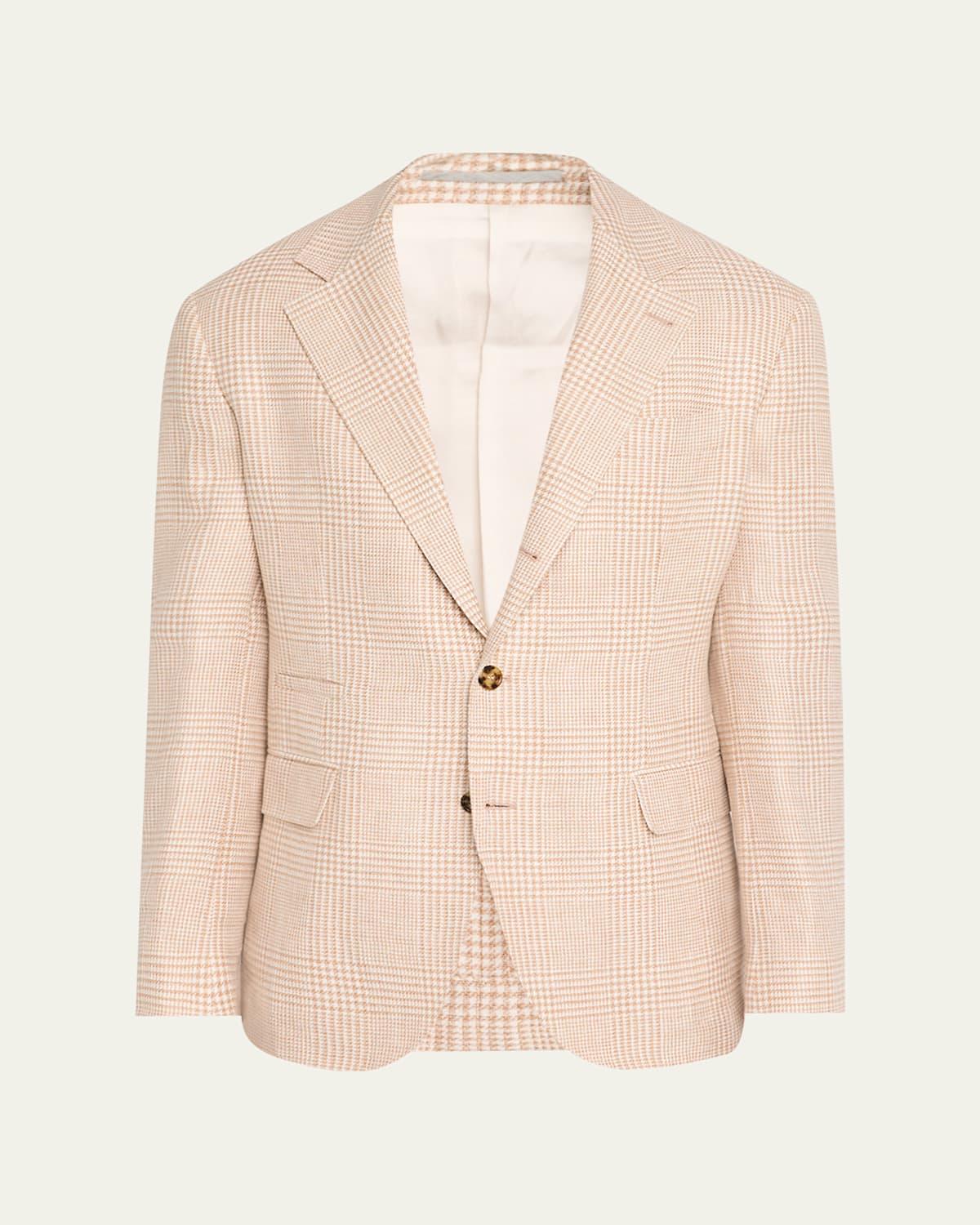 Brunello Cucinelli sport coat in macro Prince of Wales fabric with natural horn buttons Notched lapels; single-breasted front Long sleeves Front welt and flap pockets Double-vented back Mid-length Classic fit Linen/wool/silk Lining: Cupro Dry clean, machine wash cold Made in Italy