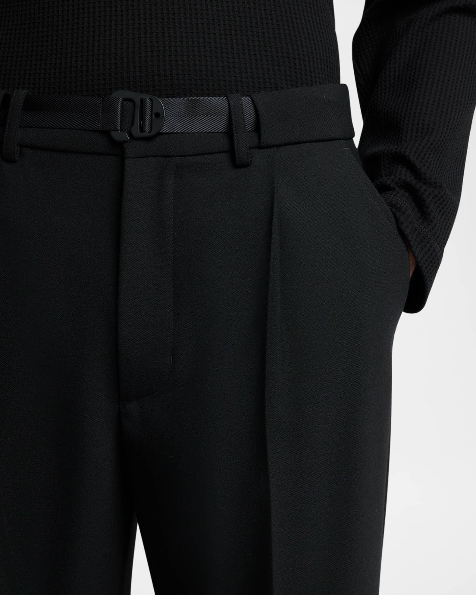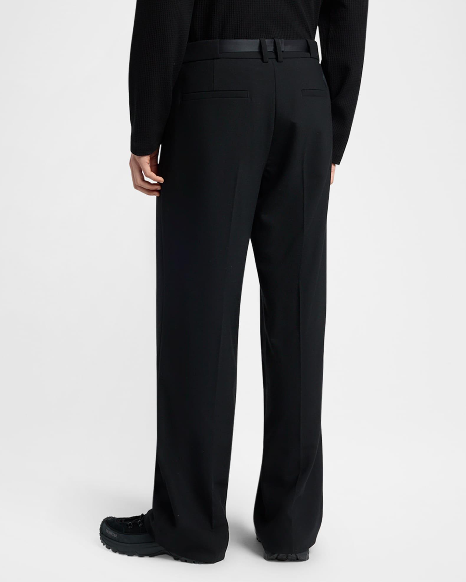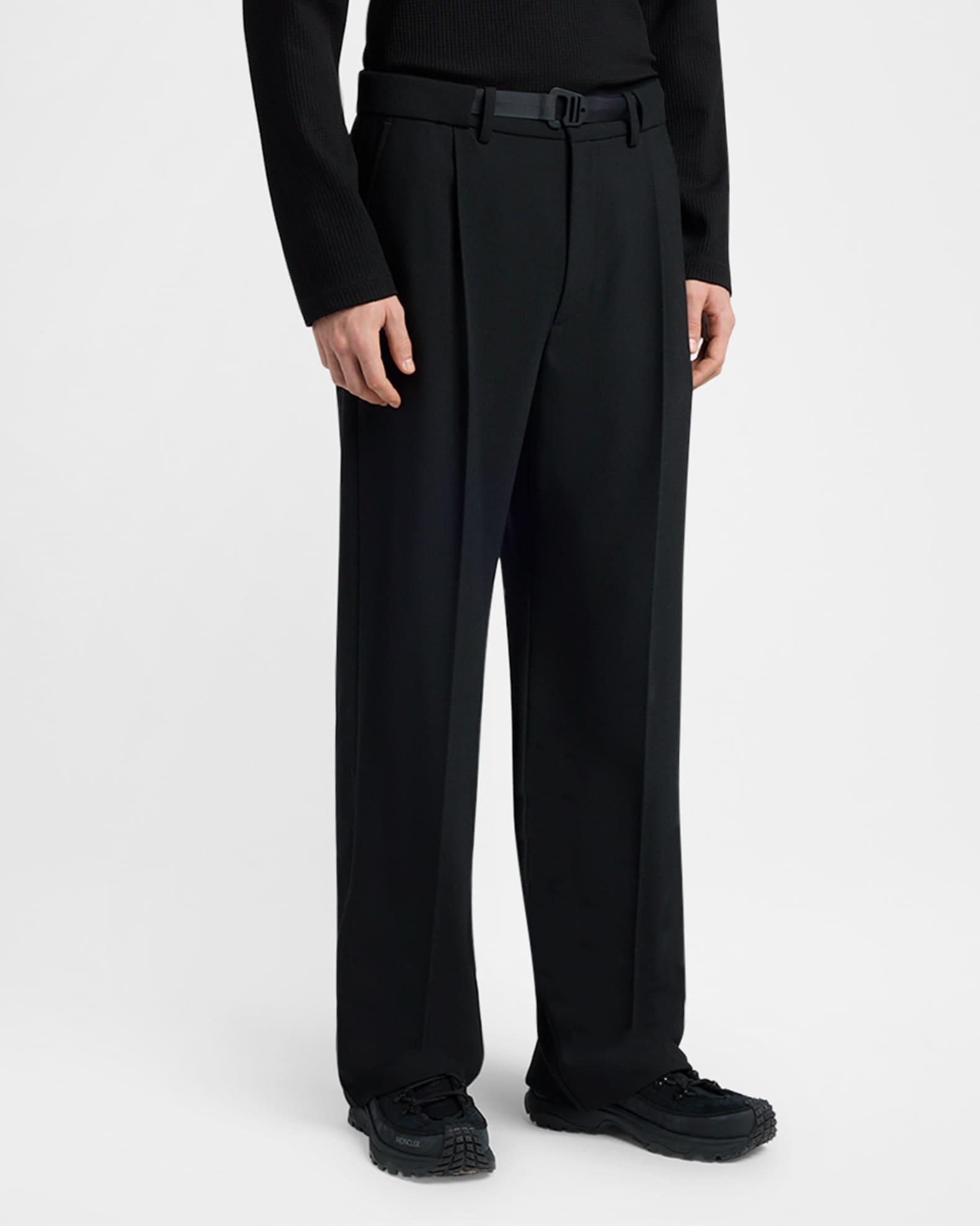 A polyester and virgin wool blend is woven and pleated for these Moncler trousers. Belted waist Concealed zip closure; belt loops Side slip pockets Back welt pockets Straight legs Full length Polyester/virgin wool Lining: Polyester/virgin wool Professional cleaning recommended Made in Hungary