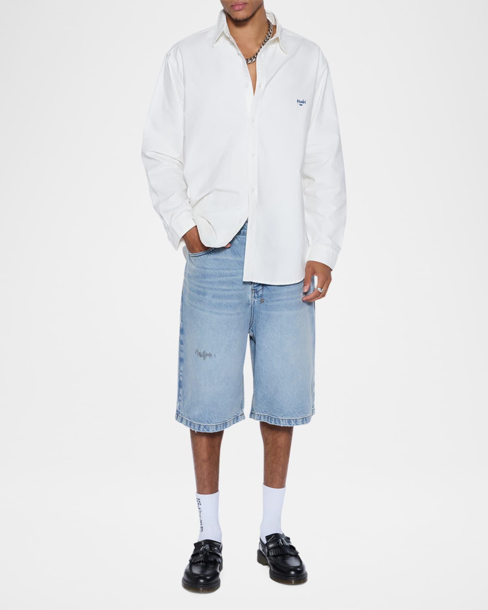 Ksubi jean shorts made from premium rigid indigo denim with a medium stone wash Accented with paint splattering and scraping Regular rise Five-pocket style Signature woven pocket tag Back 4x4 cross embroidery Relaxed fit through straight legs Button-zip fly Belt loops Branded hardware Cotton Machine wash cold Imported