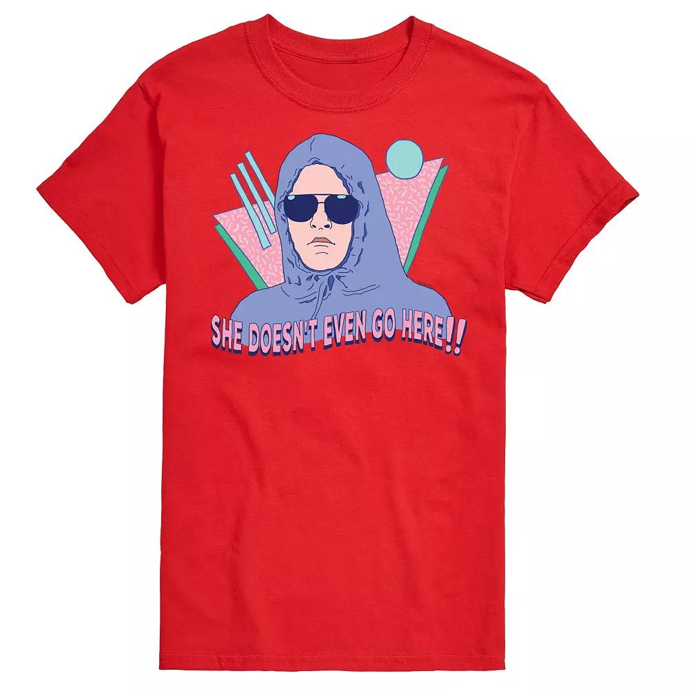 Keep an eye on style with this mens Mean Girls She Doesnt Even Go Here Graphic Tee. Keep an eye on style with this mens Mean Girls She Doesnt Even Go Here Graphic Tee. FEATURES Crewneck Short sleeveFABRIC & CARE Solid colors: cotton; Heather colors: cotton, polyester Machine wash Imported Size: XL. Color: Red. Gender: male. Age Group: adult.