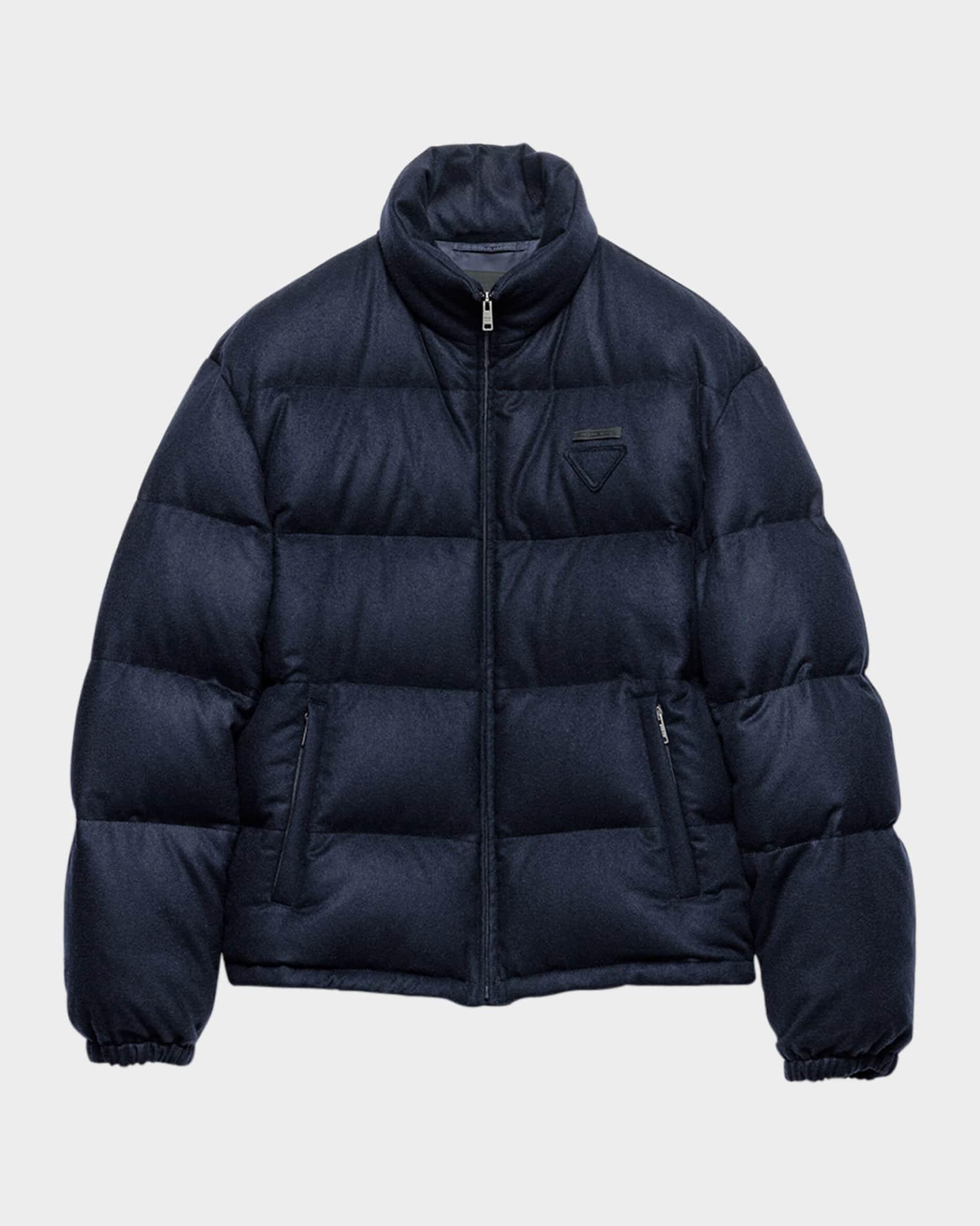 Prada brushed cashmere down jacket featuring a fabric triangle and sartorial logo label on the chest Approx. 26"L from shoulder to hem Stand collar; zip front Long sleeves; elasticized cuffs Hip zip pockets Loose fit Straight hem Zip closure Cashmere Fill: Goose down Made in Italy