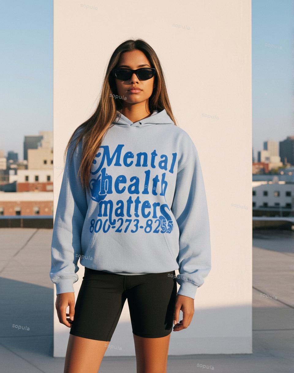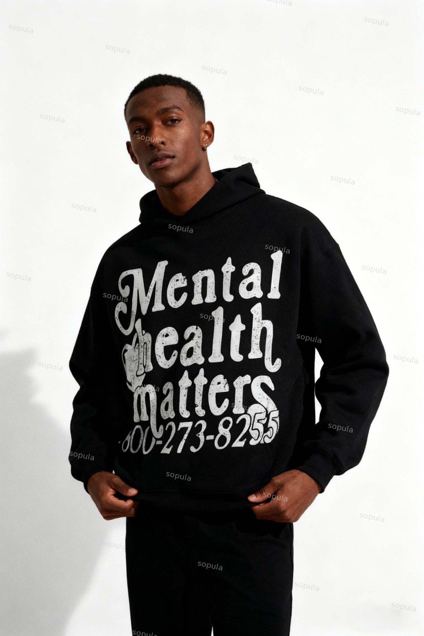 Men's Mental Health Matters Graphic Hoodie. SPU: CP-237130-HWE Fabric: 100% Cotton Fabric Weight: 380g Pattern: Mental Health Process: Printed Gender: Women,Men Season: Spring, Fall, Winter Size Range: S-2XL Color: Black,Grey, White , Blue,Navy Blue Print Position: Front