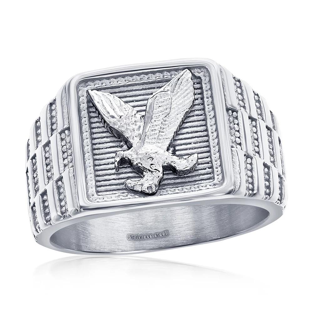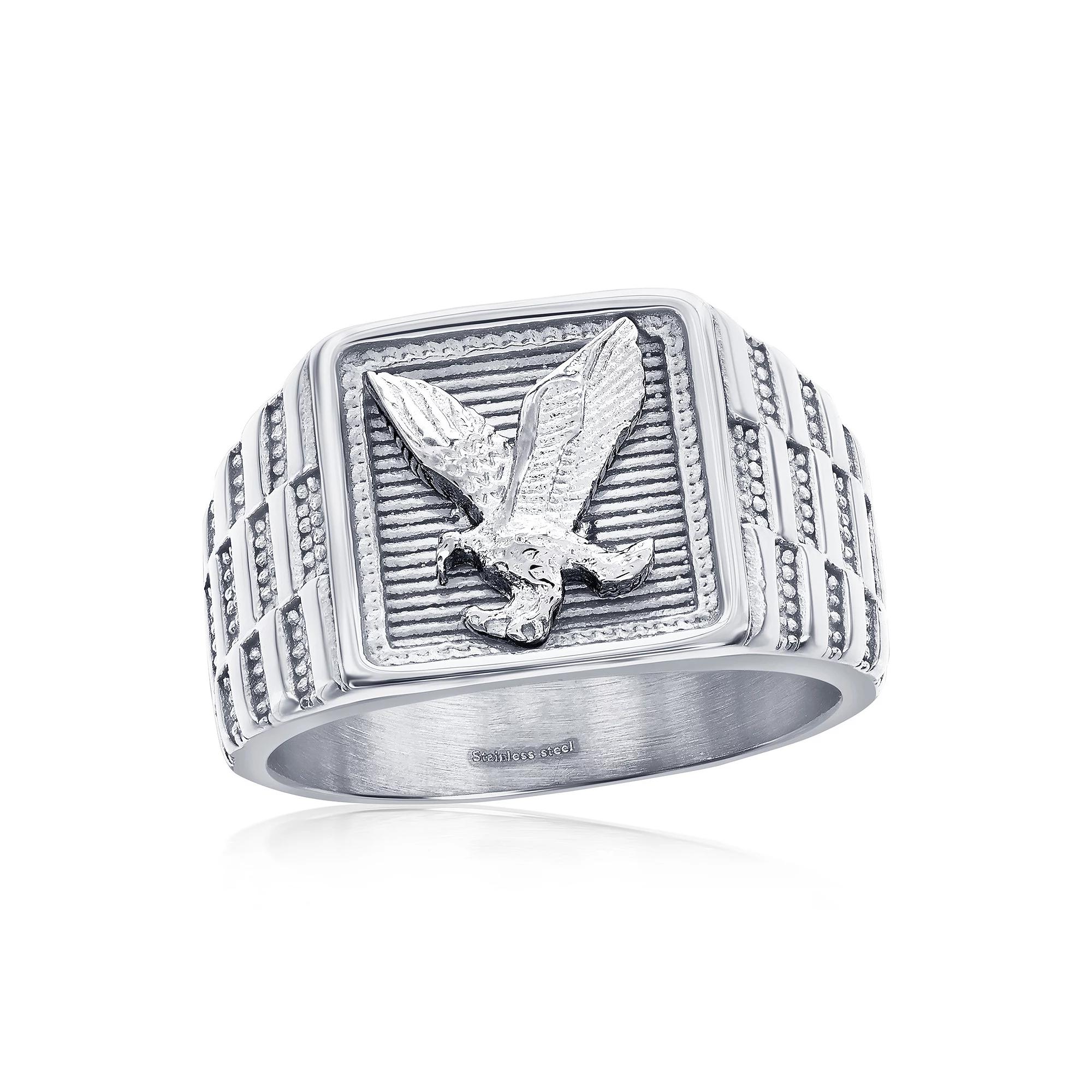 Accessorize with style with this Men's Metallo Stainless Steel Square Eagle Ring. Click on this JEWELRY & WATCHES GUIDE to learn about fit, styles, materials and more! Accessorize with style with this Men's Metallo Stainless Steel Square Eagle Ring. Click on this JEWELRY & WATCHES GUIDE to learn about fit, styles, materials and more! FEATURES Width: 8 mm Shank style: band Band fit: rounded Metal: stainless steel Finish: polished Packaging: boxed Nickel free Imported Size: 10. Gender: male. Age Group: adult.