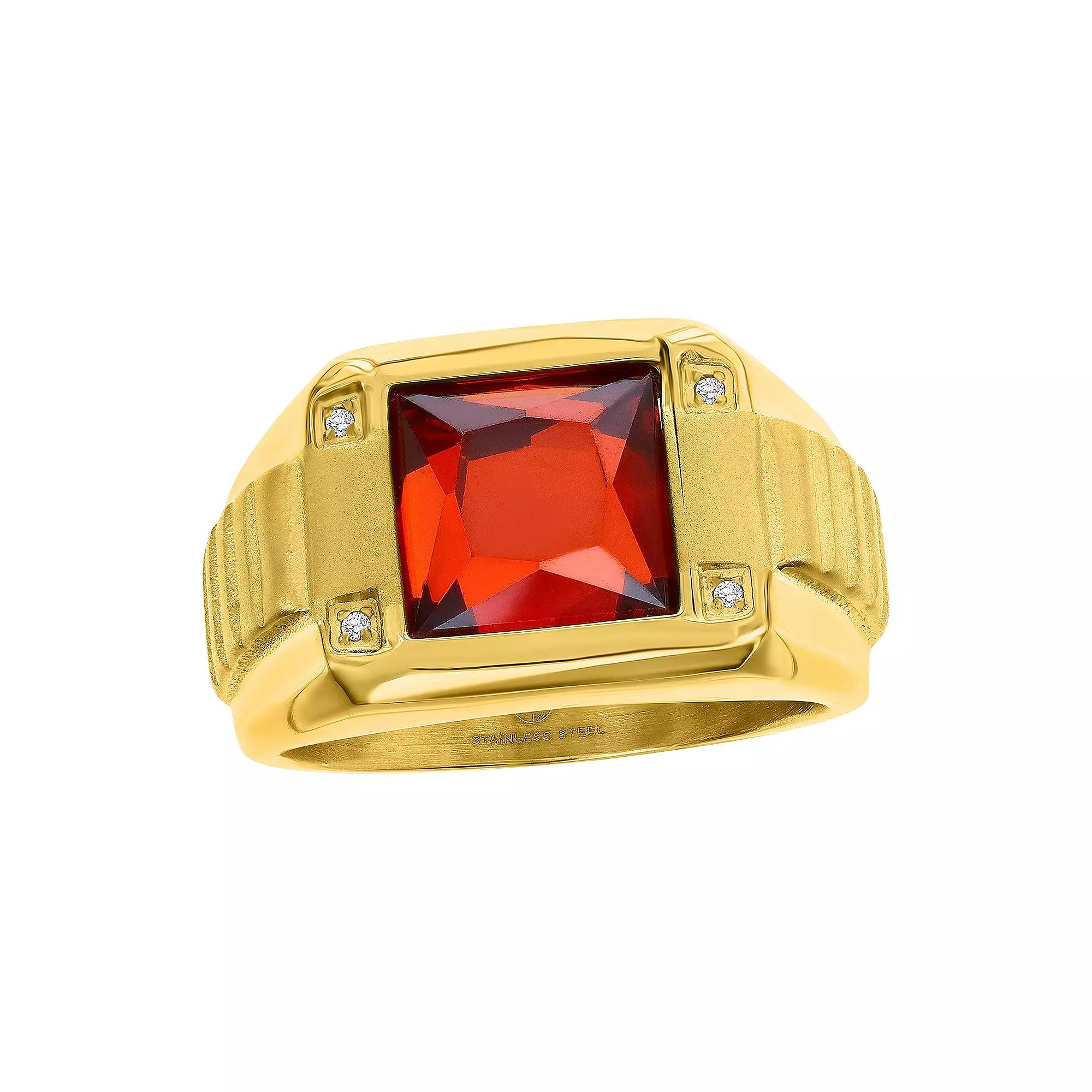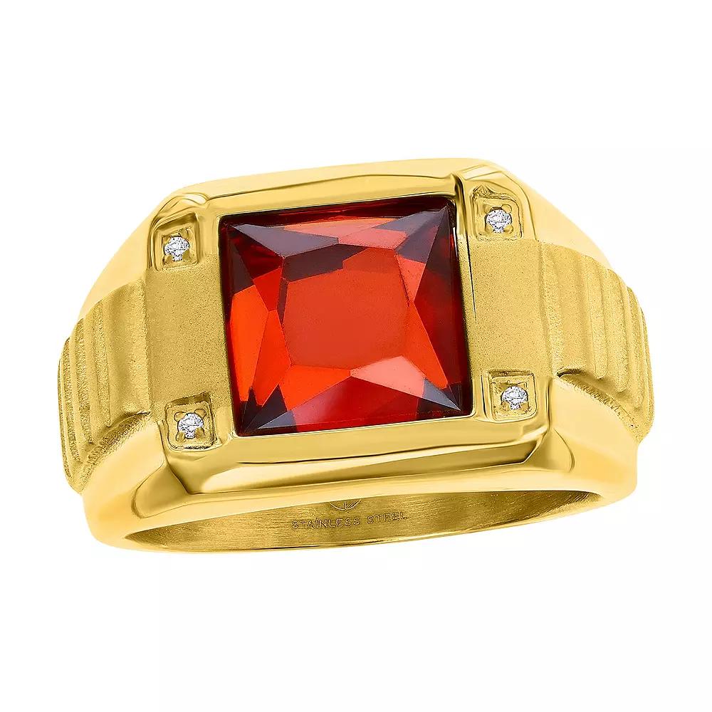 Youll love the bold style of this Mens Metallo Steel Gold-Plated Genuine Red Spinel Cubic Zirconia Ring. Click on this JEWELRY & WATCHES GUIDE to learn about fit, styles, materials and more! Youll love the bold style of this Mens Metallo Steel Gold-Plated Genuine Red Spinel Cubic Zirconia Ring. Click on this JEWELRY & WATCHES GUIDE to learn about fit, styles, materials and more! FEATURES 14mm ring width Shank style: reverse tapered Band fit: comfort fit Nickel free Metal: stainless steel Plating: gold tone,Plating: ion plated Finish: polished Packaging: boxed ImportedSTONE DETAILS Stone type: spinel 6x6mm Shape: rose cut,Shape: round brilliant,Shape: square Setting: bezel Size: 13. Gender: male. Age Group: adult.