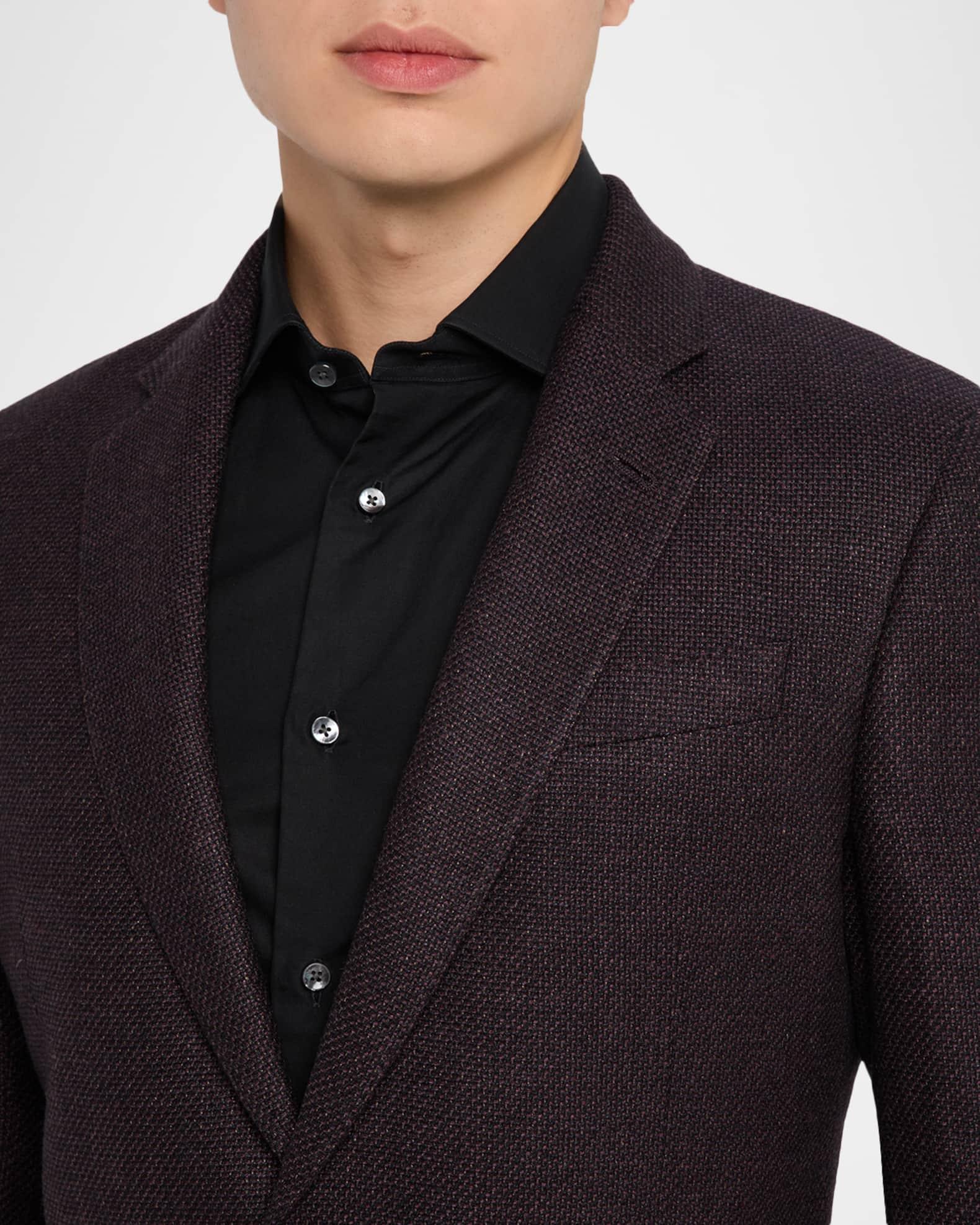 A blend of wool, silk, and linen creates a microgrid texture for this Giorgio Armani sport coat. Peak lapels Two-button front Chest welt pocket Interior logo tag and pocket Side flap pockets Double-vented back Virgin wool/silk/linen Dry clean Made in Italy