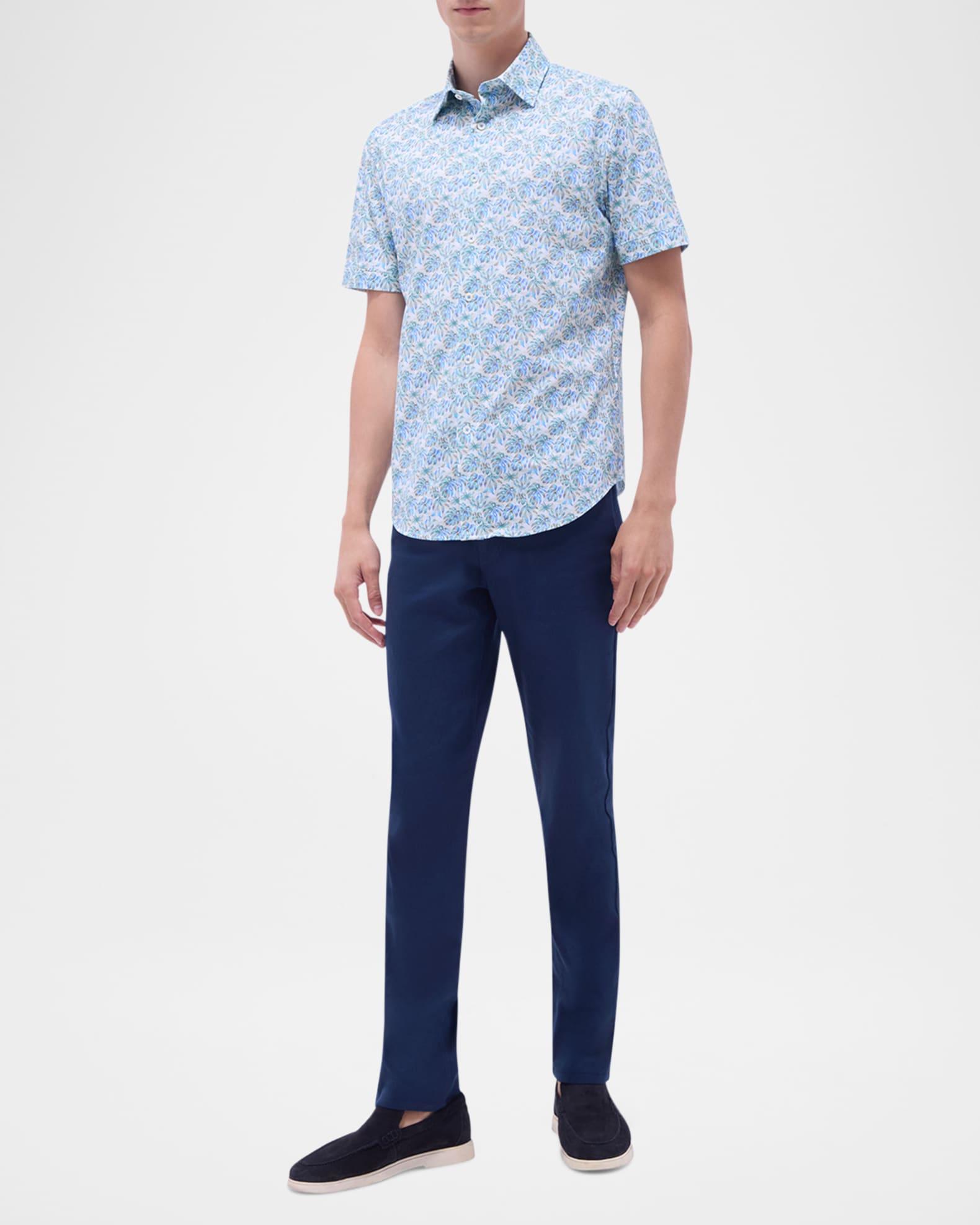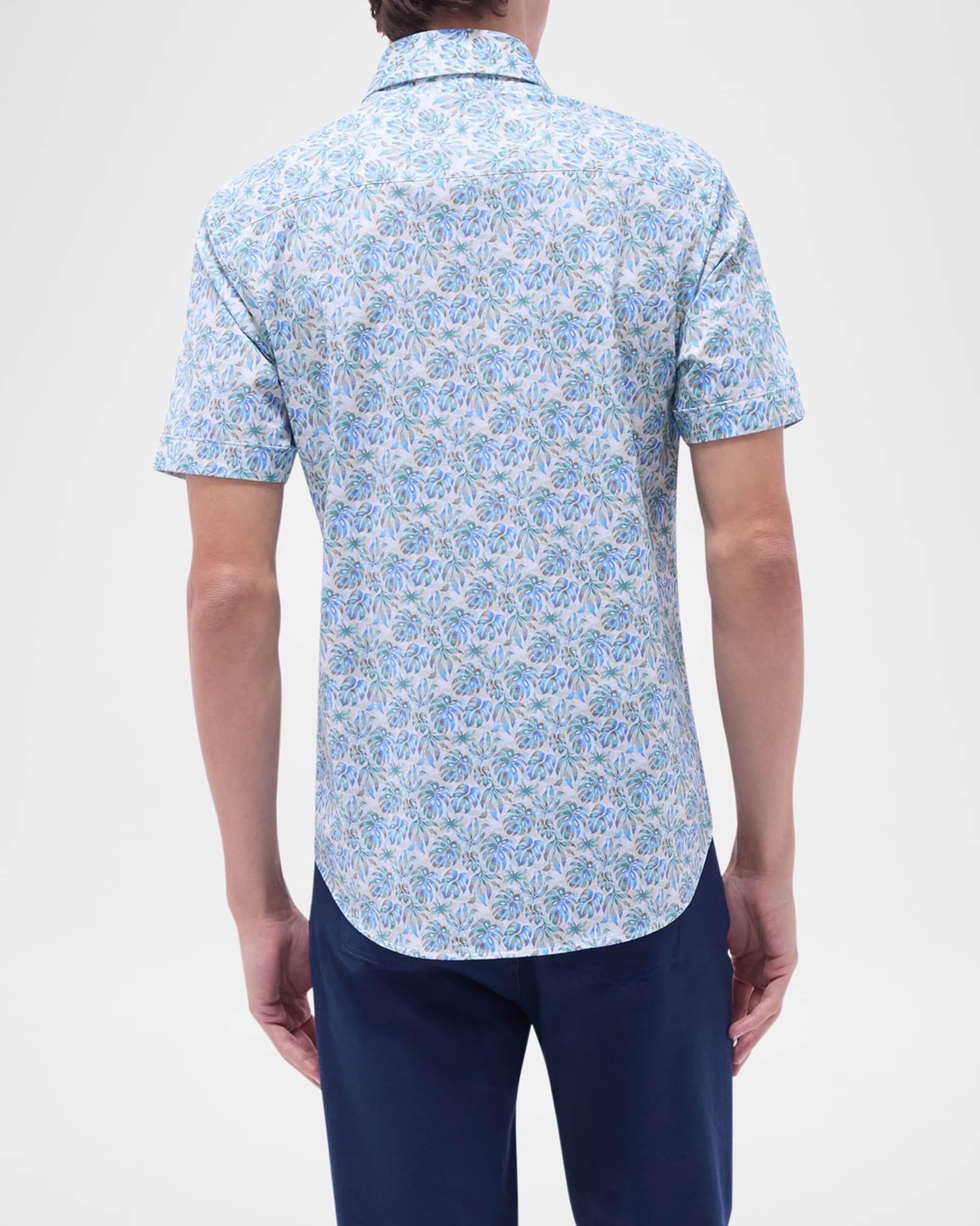 Bugatchi "Miles" casual button-down shirt in OoohCotton accented with an allover palm tree print OoohCotton is a double mercerized, wrinkle-resistant, antimicrobial cotton with 8-way stretch, breathability, easy-care, quick dry, and thermal comfort Spread collar Button placket Short sleeves Back yoke Curved hem Slim fit Cotton/spandex Machine wash cold Imported