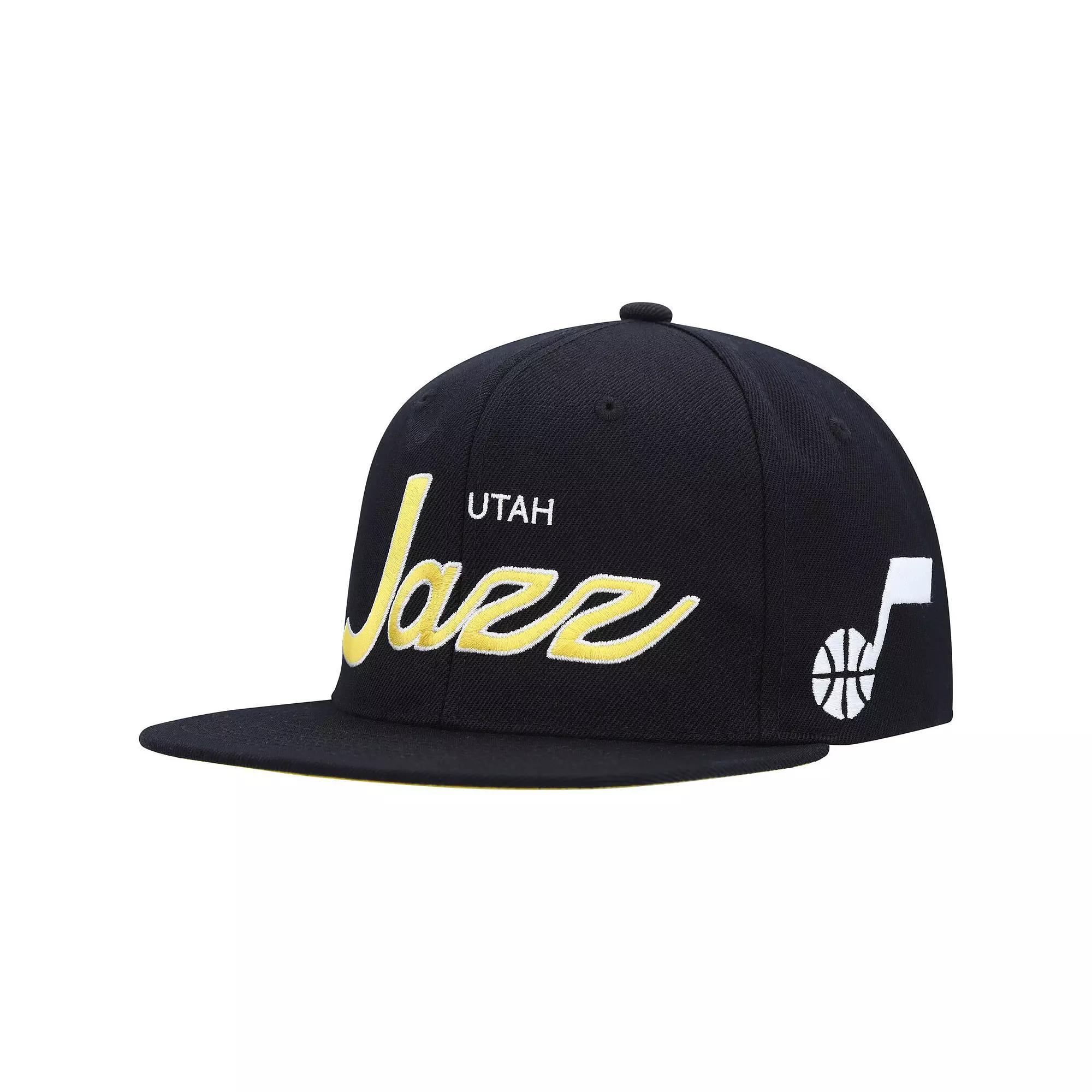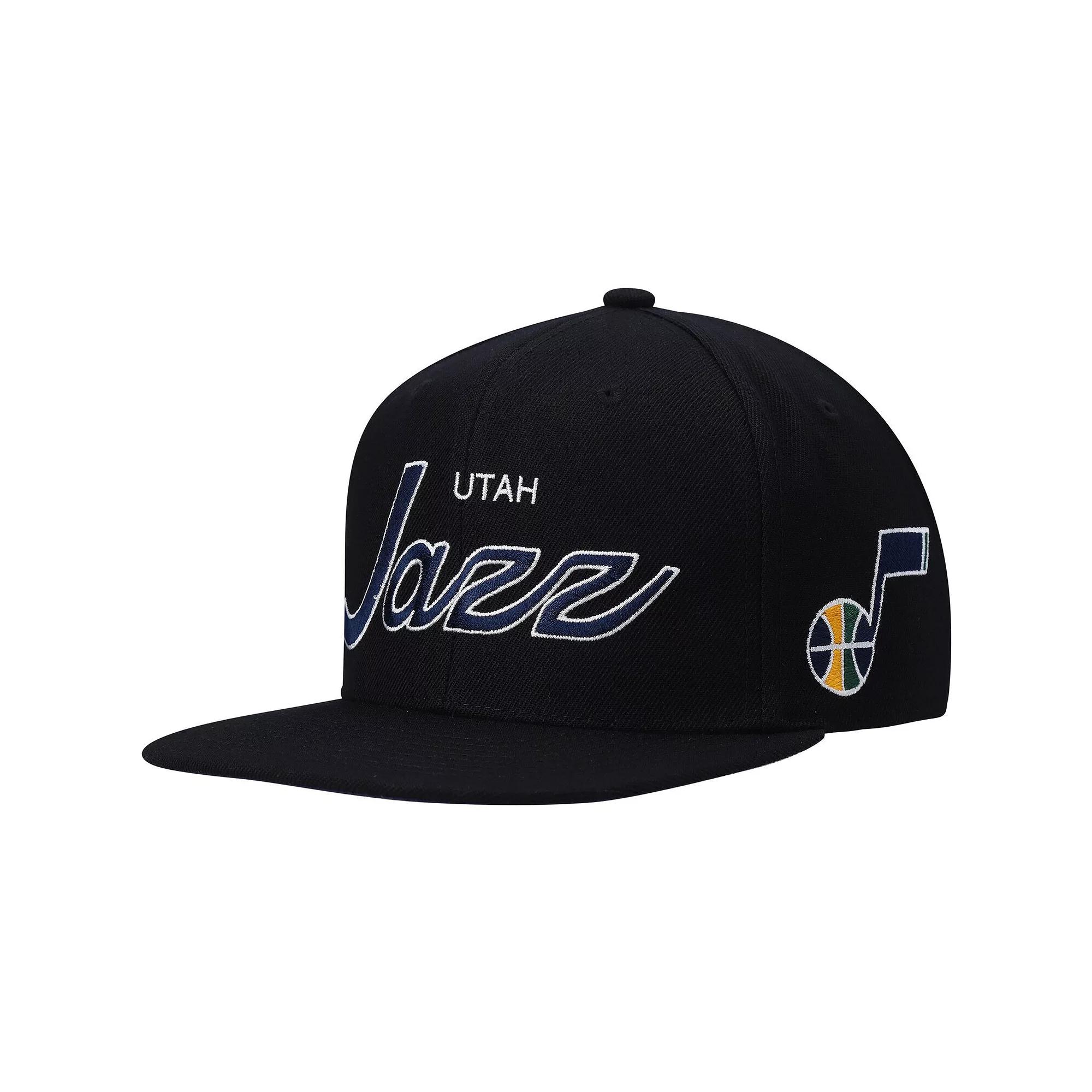 Put your Utah Jazz fandom on full display with this Hardwood Classics Script 2.0 Snapback Hat from Mitchell & Ness. The adjustable snap closure and structured design provide a reliable fit every time. Vintage Utah Jazz script embroidered across the front of the hat emphasizes your unwavering loyalty.Put your Utah Jazz fandom on full display with this Hardwood Classics Script 2.0 Snapback Hat from Mitchell & Ness. The adjustable snap closure and structured design provide a reliable fit every time. Vintage Utah Jazz script embroidered across the front of the hat emphasizes your unwavering loyalty.Brand: Mitchell & NessContrast-color undervisorDry clean onlyEmbroidered graphicsFlat billHigh CrownImportedMaterial: 85% Acrylic/15% WoolOfficially licensedOne size fits mostSix solid panels with eyeletsSnapbackStructured fit Color: Black. Gender: male. Age Group: adult. Material: COTTON.