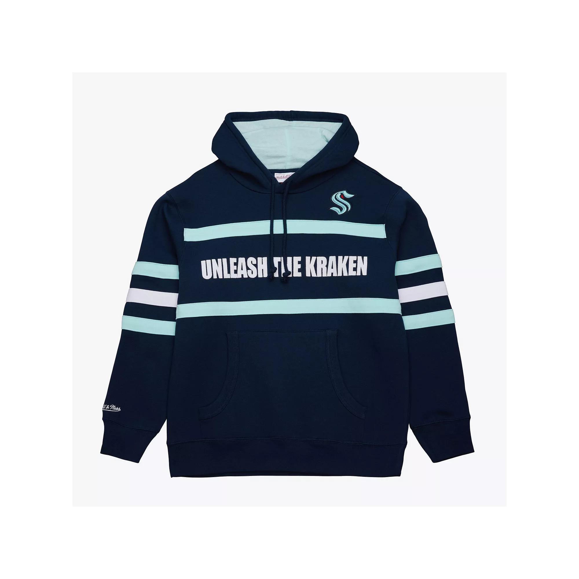 Show your Seattle Kraken pride with this Mitchell & Ness Head Coach Slogan Hoodie. This pullover is perfect for moderate temperatures, keeping you warm and comfortable whether you're at the game or out and about. Its embroidered Seattle Kraken graphics and sewn-on stripes add a touch of style, while the fleece lining provides an extra layer of warmth.Show your Seattle Kraken pride with this Mitchell & Ness Head Coach Slogan Hoodie. This pullover is perfect for moderate temperatures, keeping you warm and comfortable whether you're at the game or out and about. Its embroidered Seattle Kraken graphics and sewn-on stripes add a touch of style, while the fleece lining provides an extra layer of warmth.PRODUCT FEATURESLong sleeveHoodedOfficially licensedMachine wash, tumble dry lowFront pouch pocketMaterial: 80% Cotton/20% Polyester - Body; 100% Cotton - Hood Lining; 95% Cotton/5% Spandex - RibSewn-on stripesPulloverBrand: Mitchell & NessFleece liningMidweight hoodie suitable for moderate temperaturesImportedEmbroidered fabric applique team graphics Size: XL. Color: Krk Navy. Gender: male. Age Group: adult.