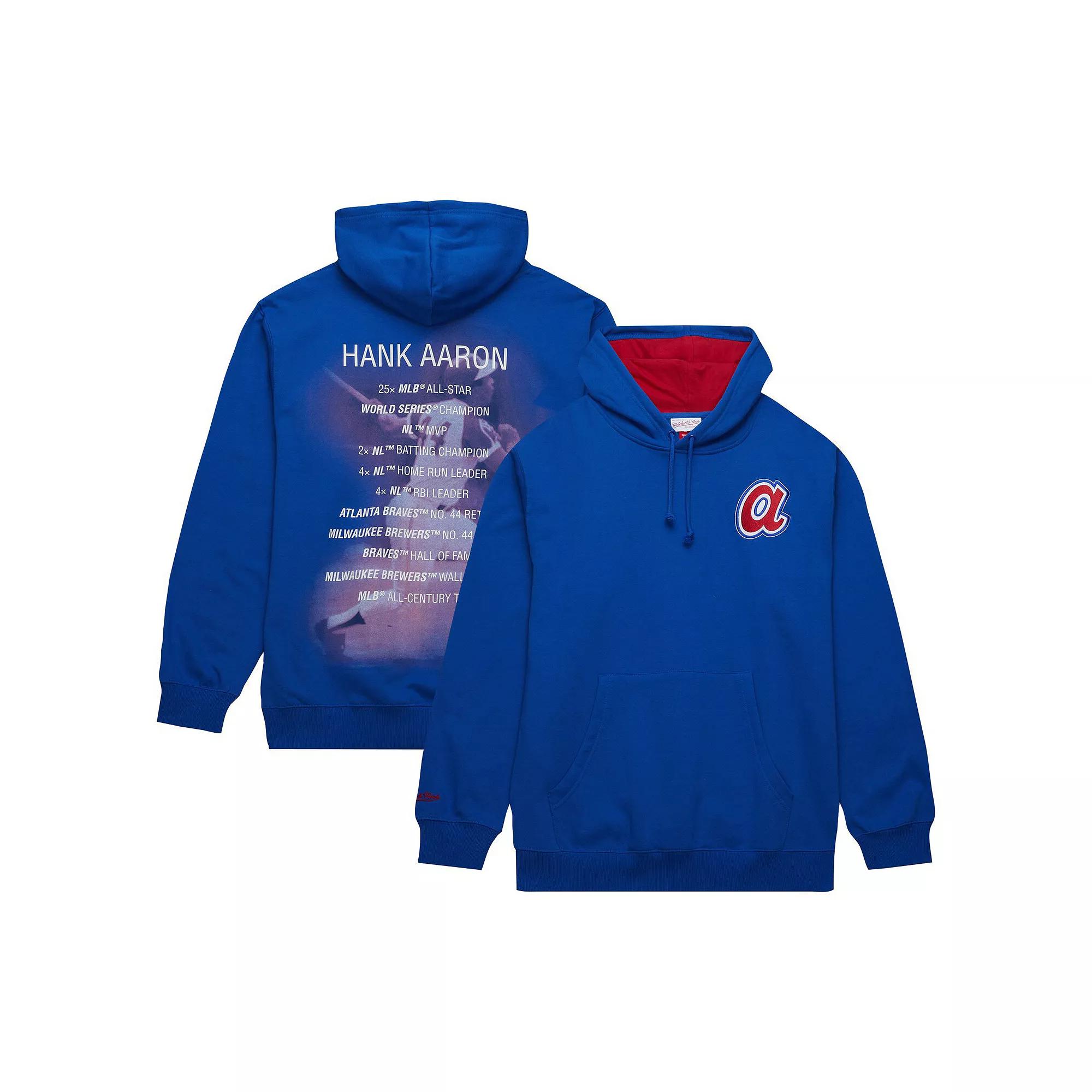 Put one of the all-time greatest Atlanta Braves back in the spotlight with this Hank Aaron pullover hoodie. Designed by Mitchell & Ness, it features a vintage Atlanta Braves logo embroidered on the front and lists The Hammers remarkable accomplishments down the back. An adjustable hood and pouch pocket provide added warmth as you pay tribute to Hank Aaron, a legendary player and extraordinary humanitarian.Put one of the all-time greatest Atlanta Braves back in the spotlight with this Hank Aaron pullover hoodie. Designed by Mitchell & Ness, it features a vintage Atlanta Braves logo embroidered on the front and lists The Hammers remarkable accomplishments down the back. An adjustable hood and pouch pocket provide added warmth as you pay tribute to Hank Aaron, a legendary player and extraordinary humanitarian.PRODUCT FEATURESOfficially licensedMachine wash, tumble dry lowFleece liningPulloverFront pouch pocketImportedMaterial: 80% Cotton/20% PolyesterLong sleeveMidweight hoodie suitable for moderate temperaturesEmbroidered fabric appliqueScreen print graphicsHoodedBrand: Mitchell & Ness Color: Blue. Gender: male. Age Group: adult.