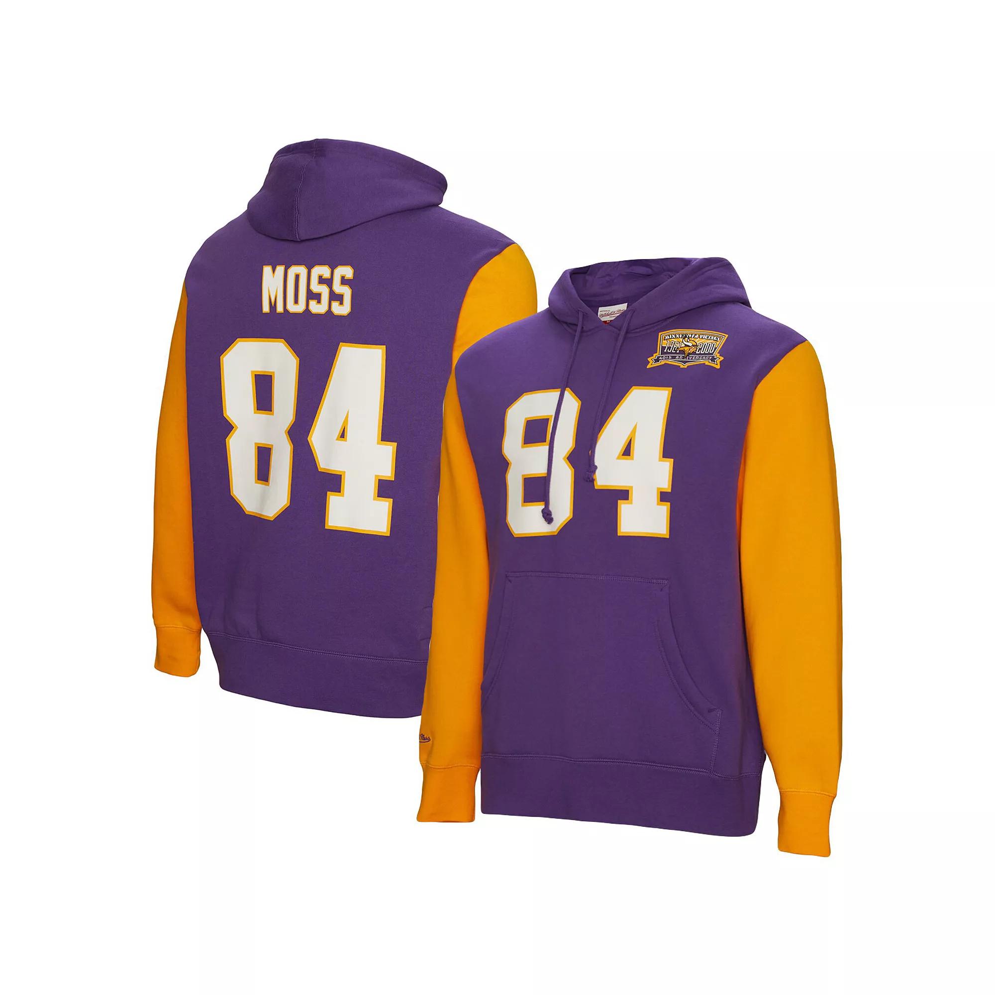 Bring back the days of watching your favorite player with this Minnesota Vikings Randy Moss Name and Number hoodie from Mitchell & Ness. Featuring graphics dedicated to the all-time great, this pullover is perfect for fans who appreciate their franchises past. Its comfortable design is also perfect for the chilly weather of football season.Bring back the days of watching your favorite player with this Minnesota Vikings Randy Moss Name and Number hoodie from Mitchell & Ness. Featuring graphics dedicated to the all-time great, this pullover is perfect for fans who appreciate their franchises past. Its comfortable design is also perfect for the chilly weather of football season.PRODUCT FEATURESOfficially licensedHoodedLong sleeveImportedMachine wash, tumble dry lowRibbed sleeve cuffs and waist at hemFleece liningFront pouch pocketMidweight hoodie suitable for moderate temperaturesScreen-print graphicsFlatlock stitchingBrand: Mitchell & NessMaterial: 80% Cotton/20% Polyester Color: Purple. Gender: male. Age Group: adult.