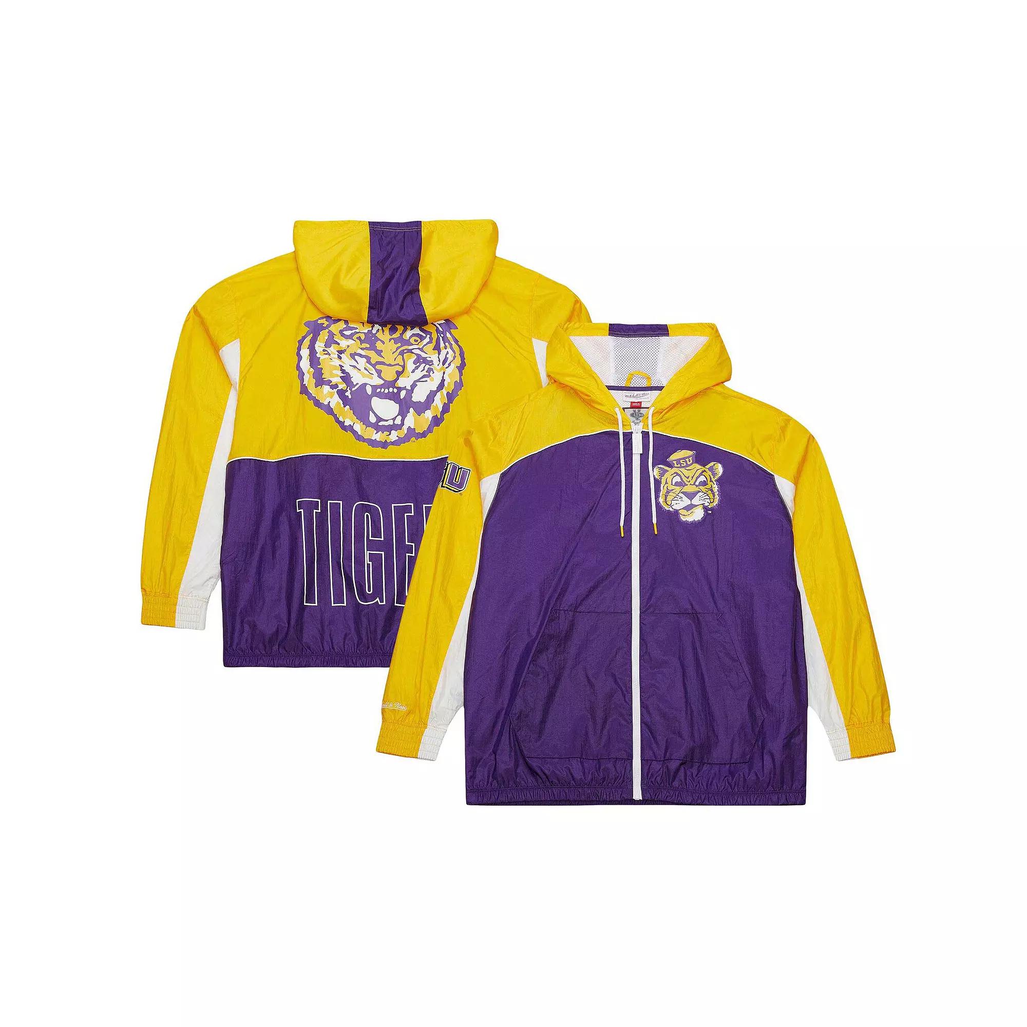 Channel those game-day vibes with this LSU Tigers Big Shot Premium Full-Zip Windbreaker from Mitchell & Ness. This lightweight windbreaker is perfect for mild temperatures, keeping you comfortable while repping the LSU Tigers. Sublimated team graphics on the right sleeve and back, along with the team logo at the left chest, make this jacket a stylish way to show your fandom.Channel those game-day vibes with this LSU Tigers Big Shot Premium Full-Zip Windbreaker from Mitchell & Ness. This lightweight windbreaker is perfect for mild temperatures, keeping you comfortable while repping the LSU Tigers. Sublimated team graphics on the right sleeve and back, along with the team logo at the left chest, make this jacket a stylish way to show your fandom.PRODUCT FEATURESElastic in cuffs and waistband to for a snug fitOfficially licensedMachine wash, line dryFull ZipHoodedLocker loop inside collarMaterial: 100% Nylon - Body; 100% Polyester - LiningLong sleeveMesh lined interiorTwo front pockets for warming hands or holding small itemsImportedSublimated team graphics on right sleeve and backBrand: Mitchell & NessLightweight jacket suitable for mild temperaturesSublimated team logo at left chest Color: White. Gender: male. Age Group: adult.