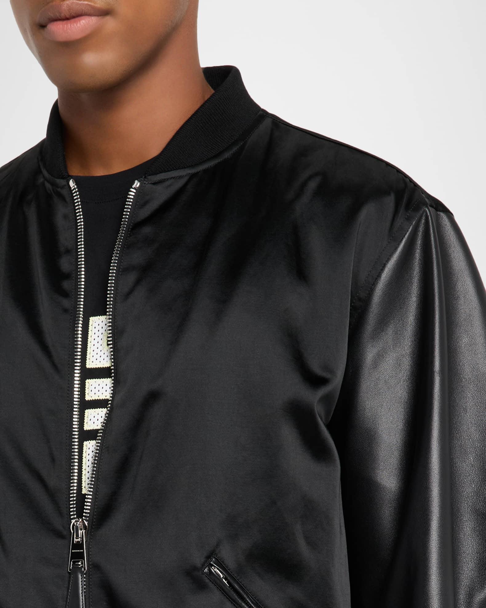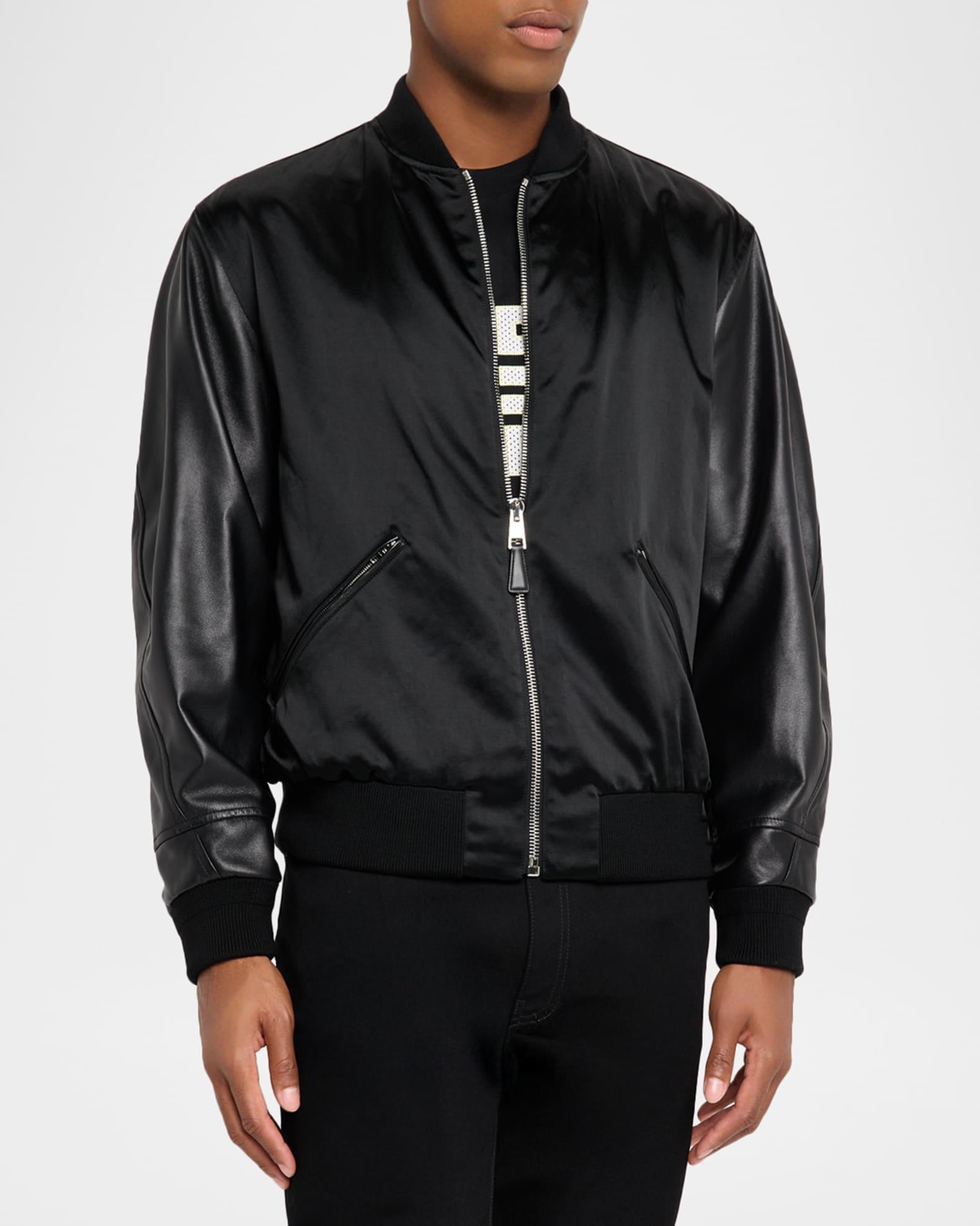 Givenchy satin bomber jacket with premium textured leather arms Defined by tonal logo lettering on the back Baseball collar Full-zip front Side zip pockets Long sleeves Ribbed cuffs and hem Cotton/acetate/leather Lining: Cotton/polyester Made in Italy