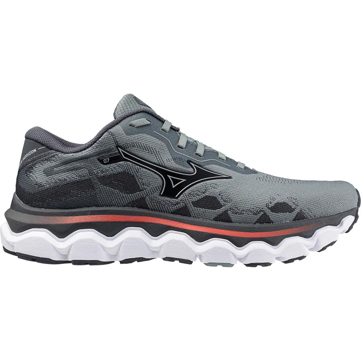 Youll feel like youre floating over the pavement in the Mizuno Wave Horizon 7. Whether youre out for an easy jog around the block or pushing through those long tempo runs, the Wave Horizon 7 brings a combo of comfort and excitement to your run. An additional 2 mm of Mizuno ENERZY Foam gives you an easy ride on the road, while the asymmetrical foam wave and rubber wall keep your stride smooth and stable. Details: Upper: A smooth stretch woven upper adapts to your foot for all day comfort. Plus, the stretchy gusseted tongue hugs your midfoot for a secure fit on the run. Midsole: A dual-density midsole with ENERZY and ENERZY CORE foam forms the signature Mizuno Wave. This combination creates a soft and highly stable shoe that establishes a floating feeling with a kick of energy return. Outsole: The X10 carbon rubber outsole is durable and grippy for longer wear and better traction.