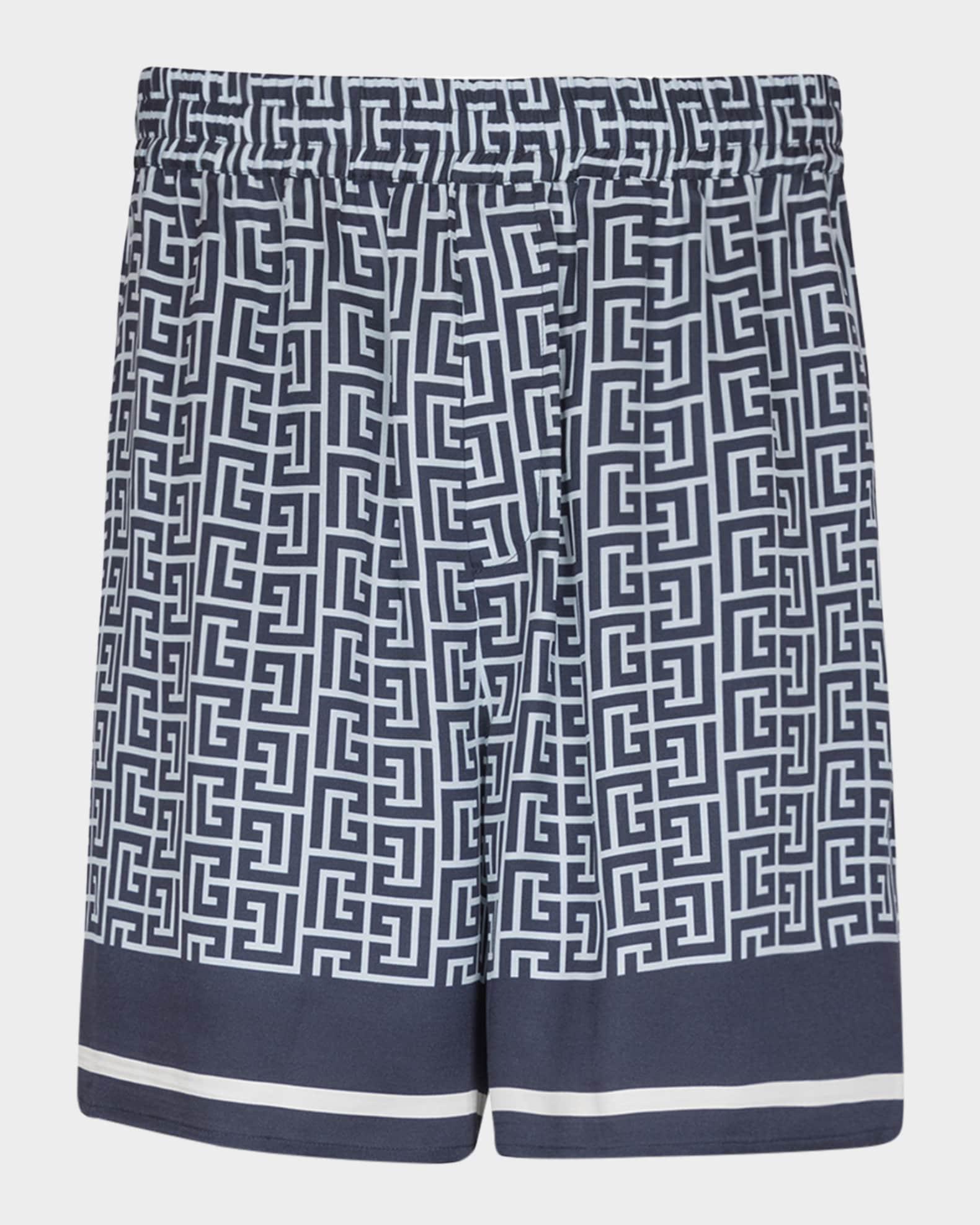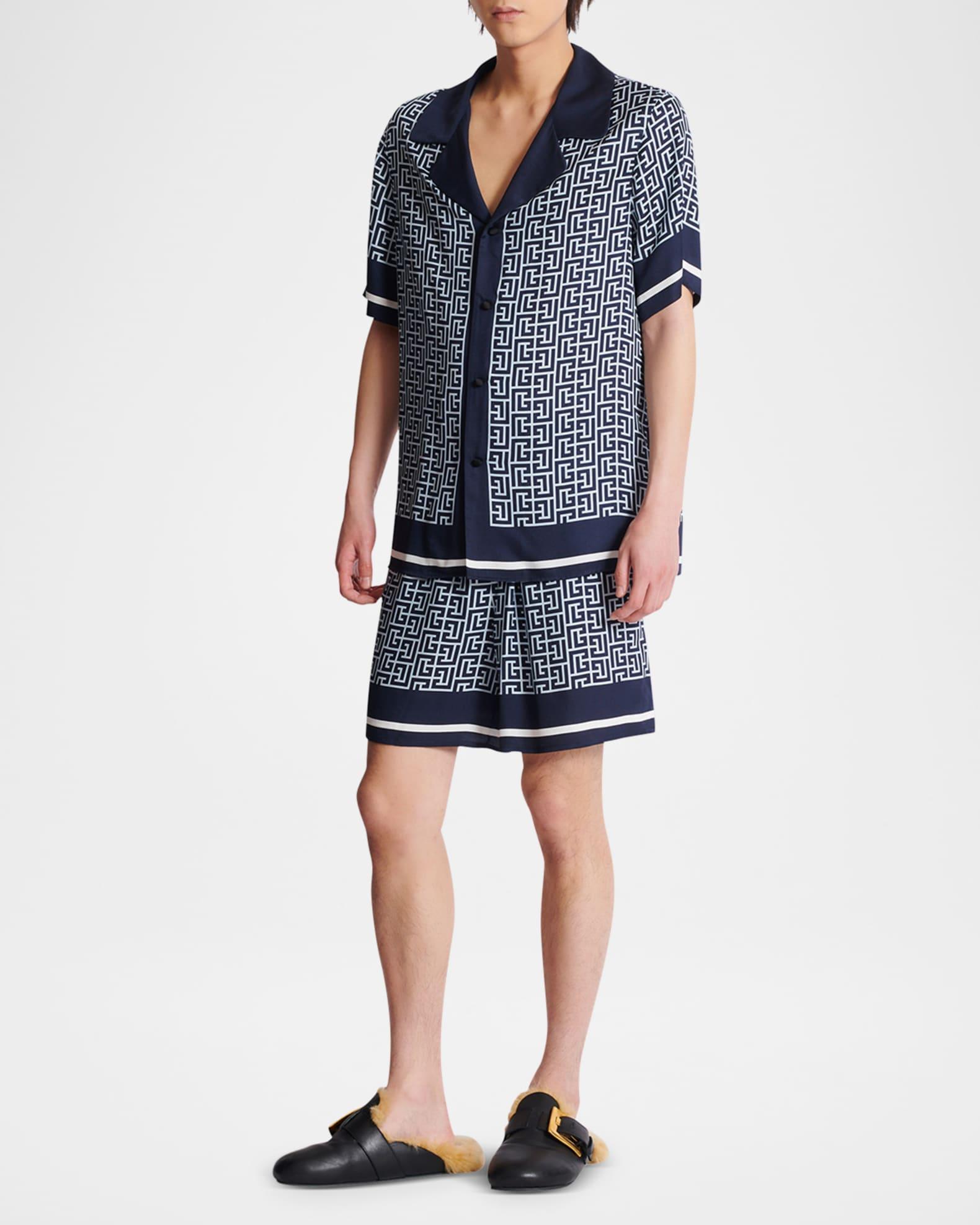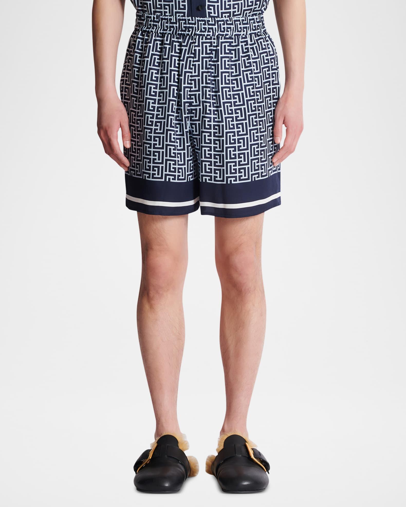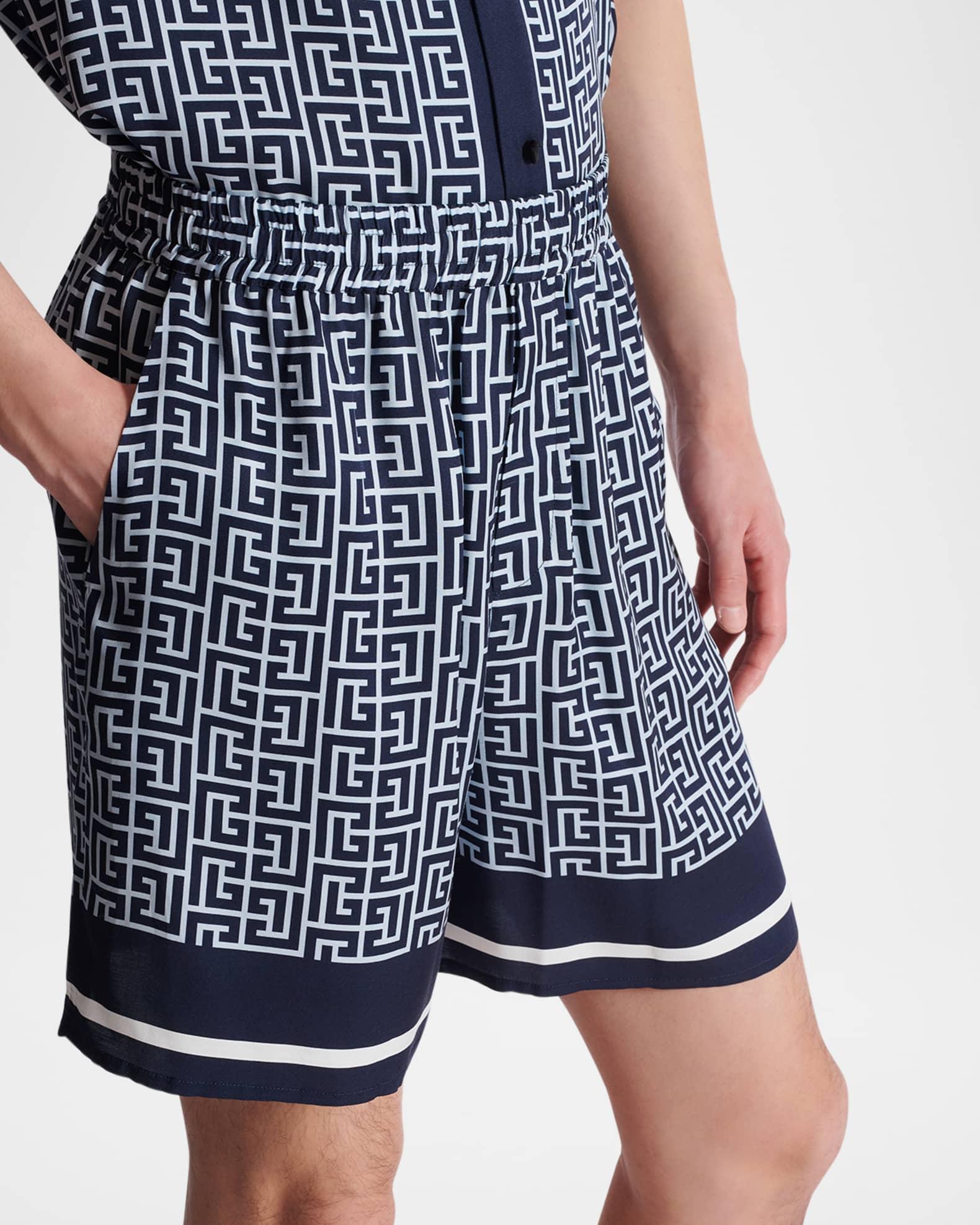 Balmain shorts in monogram print with striped hems Elasticized waist Flat front Side slip pockets Relaxed legs Pull-on style Viscose Made in Italy
