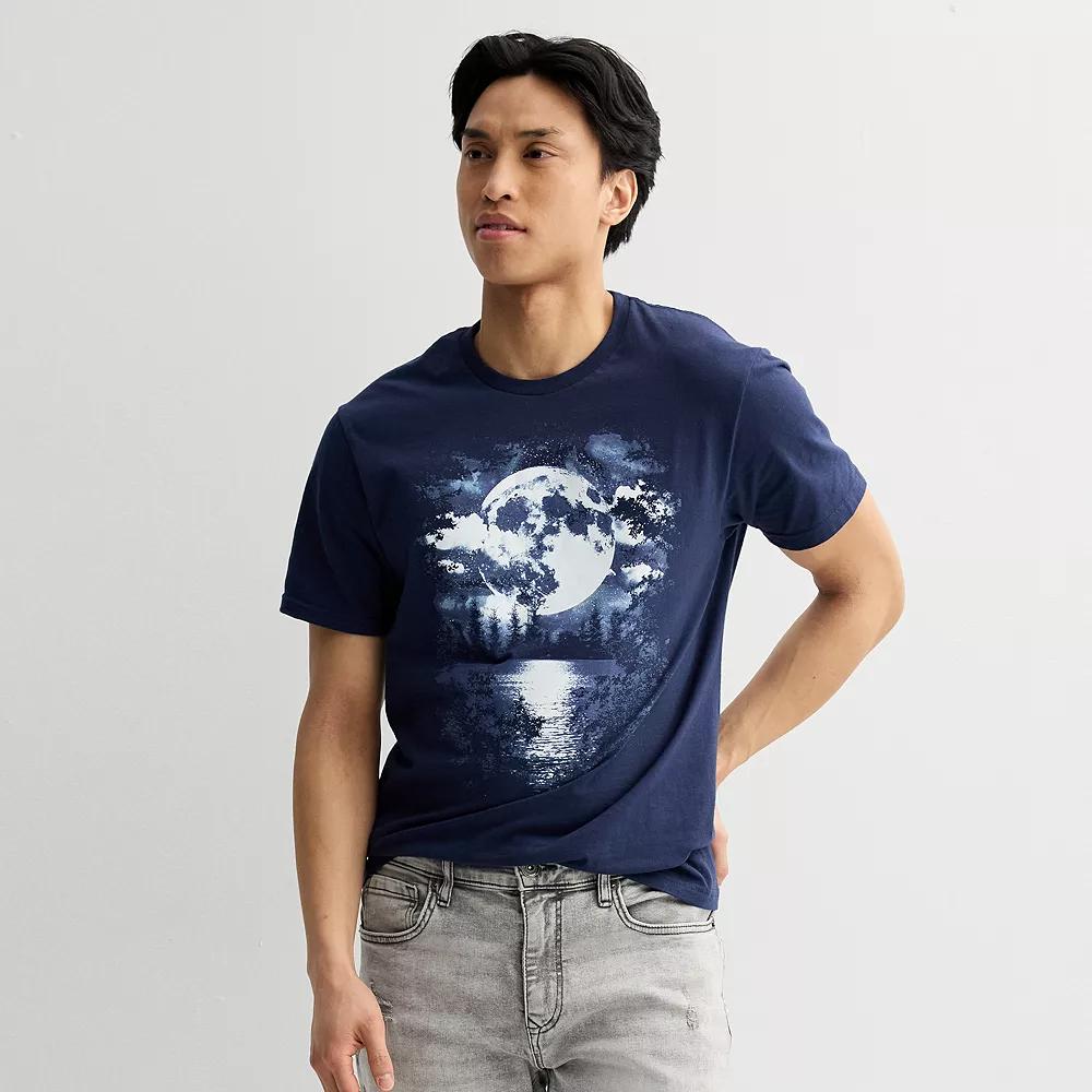 Give your wardrobe a refresh with this men's moon and forest graphic tee. Click on this MEN'S GUIDE to find the perfect fit and more!Give your wardrobe a refresh with this men's moon and forest graphic tee. Click on this MEN'S GUIDE to find the perfect fit and more!FEATURES Crewneck Short sleeve Graphic on chestFABRIC & CARE Cotton Machine wash Imported Color: Navy. Gender: male. Age Group: adult.