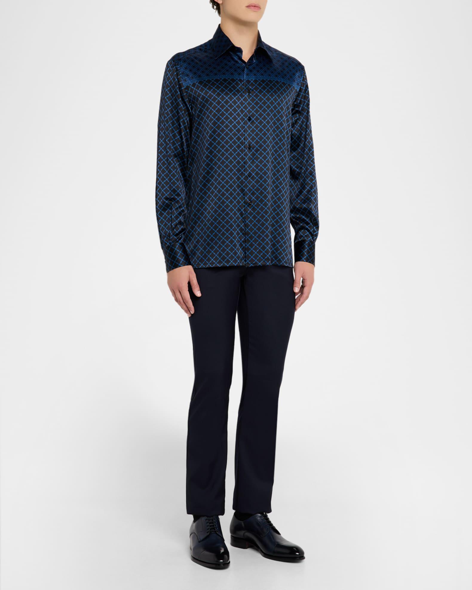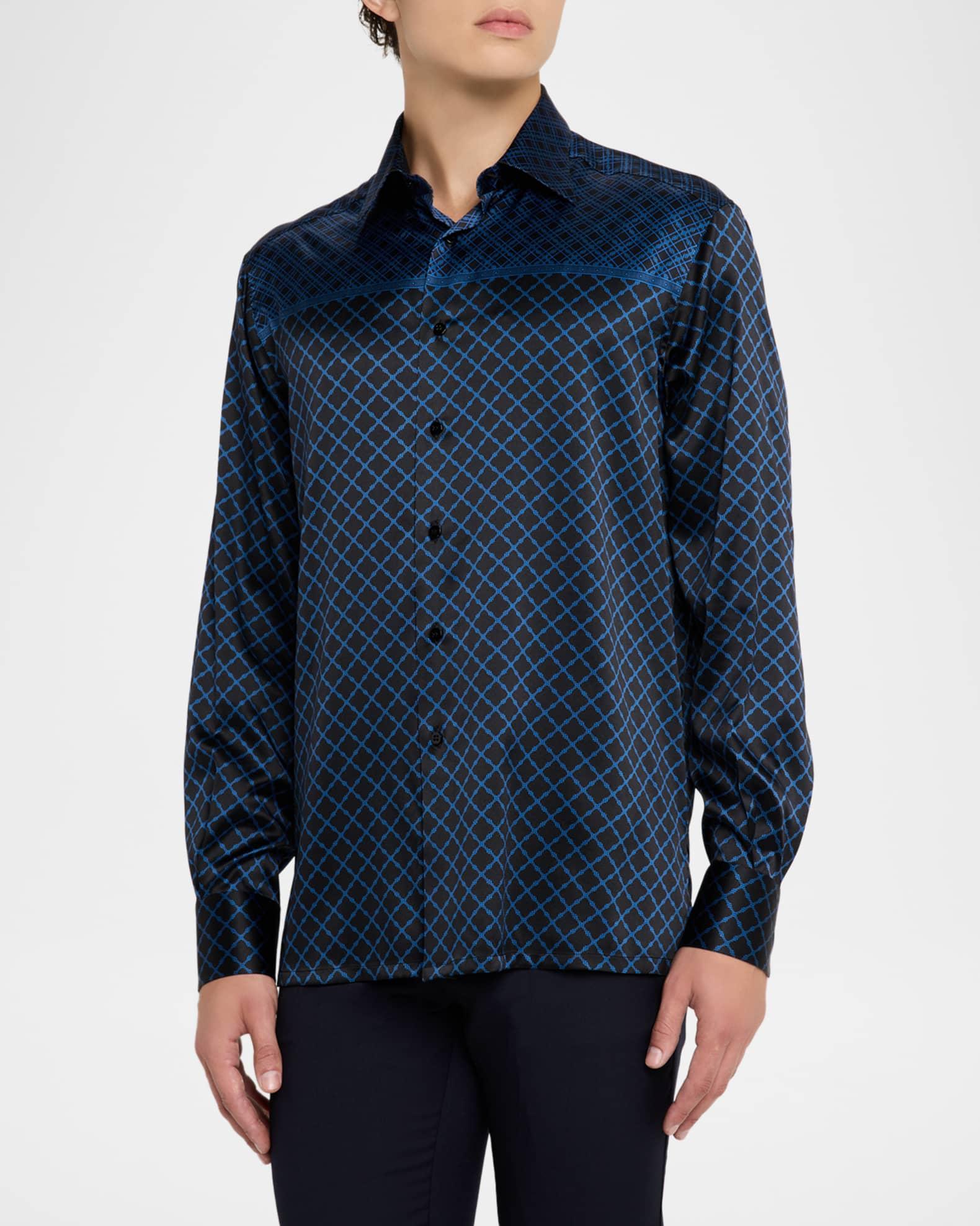 Stefano Ricci formal shirt in a lustrous silk blend, displaying a sharp geometric design Signature eagle motif on the back Point collar Button placket Long sleeves Mitered barrel cuffs Vented sides Straight hem Classic fit Silk/elastane Unlined Dry clean Made in Italy
