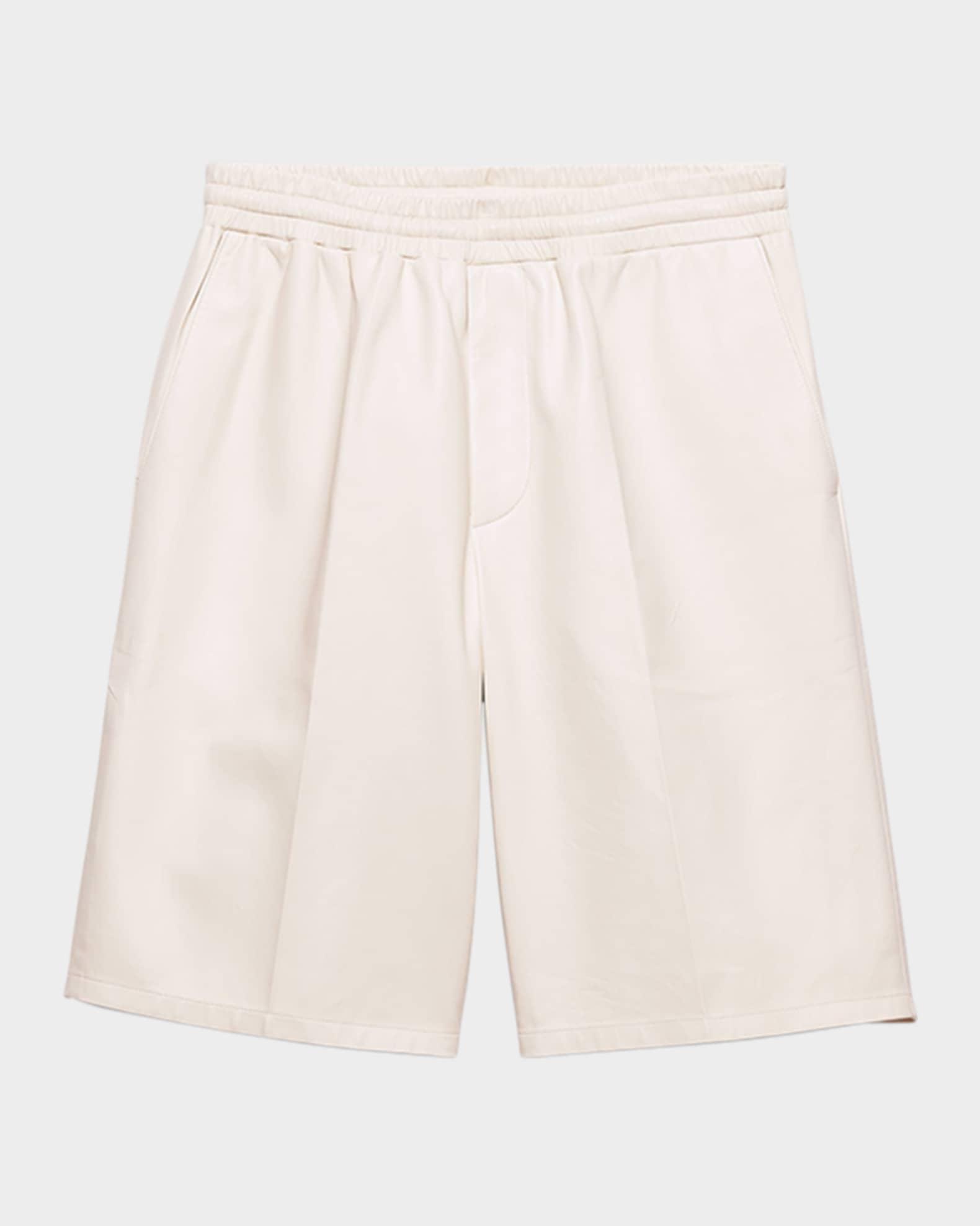 Prada lambskin leather shorts showcase a classic sporty style reimagined with a minimalist design Approx. 21.65"L Elasticized waistband Angled slash pockets Back patch pocket Enameled metal triangle logo Pressed finished garment Regular fit Front zip fly Imported