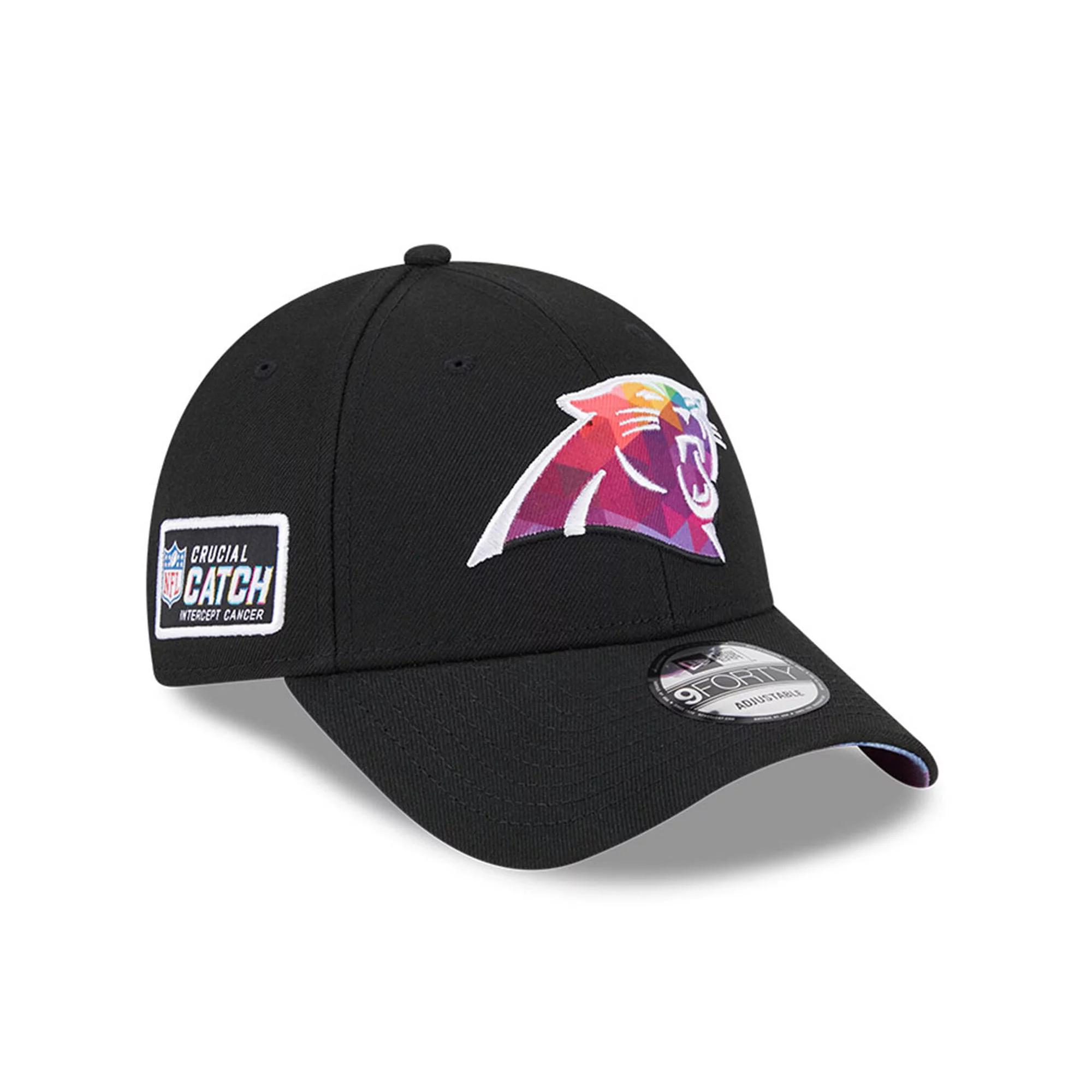 Intercept cancer with the 2023 Nfl Crucial Catch Collection from New Era. In the spirit of various cancer ribbon colors, this 9FORTY Adjustable Hat features an embroidered Carolina Panthers logo at the front panels and a patterned undervisor. It also consists of the leagues Crucial Catch logo at the right-wear side on a woven label and a snapback closure at the rear.
