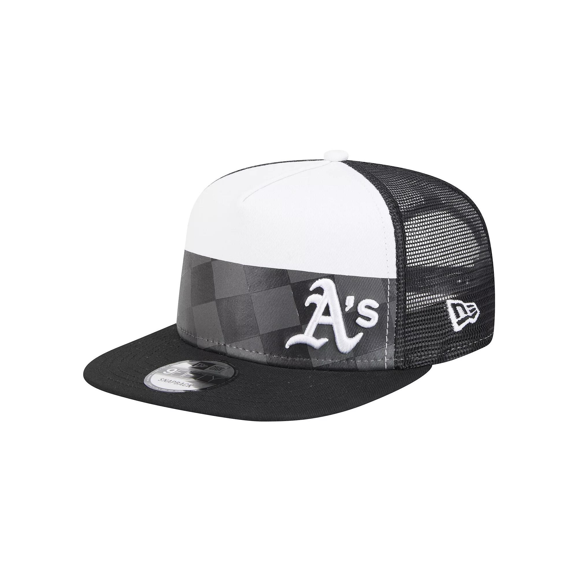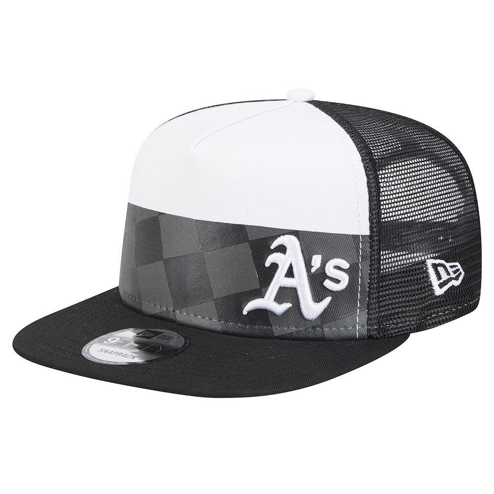 Stay shaded in Oakland Athletics style with this Checkmate Trucker 9FIFTY hat from New Era. It features a black-and-white team logo embroidered over a sleek checkmate pattern. The mesh panels and snapback closure add comfortable touches to this distinctive Oakland Athletics hat.Stay shaded in Oakland Athletics style with this Checkmate Trucker 9FIFTY hat from New Era. It features a black-and-white team logo embroidered over a sleek checkmate pattern. The mesh panels and snapback closure add comfortable touches to this distinctive Oakland Athletics hat.PRODUCT FEATURESImportedOne size fits mostSolid front panelEmbroidered graphicsBrand: New EraSnapbackStructured fitMesh mid and rear panelsFlat billHigh CrownWipe clean with a damp clothScreen print graphicsOfficially licensedMaterial: 100% Cotton Size: One Size. Gender: male. Age Group: adult.