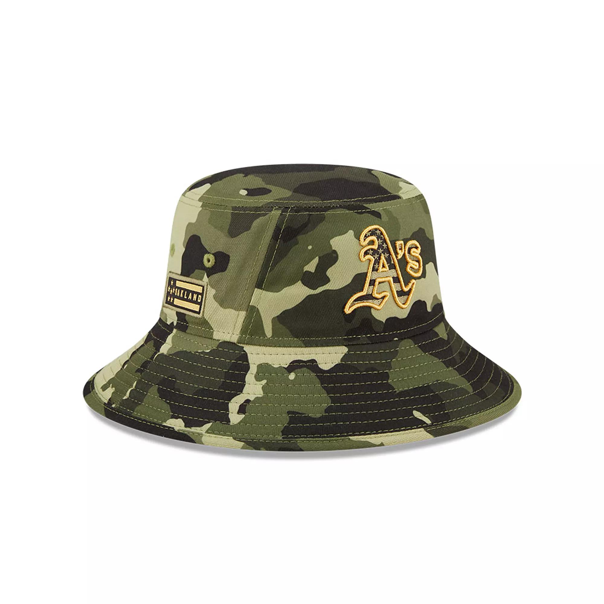 No one's a bigger Oakland Athletics fan than you, and that'll be clear when you rock this special 2022 Armed Forces Day Bucket Hat from New Era. The spirited camo design and six-star patch on the right side make this a unique addition to your collection and will help you stand out from fellow baseball fans. This special Armed Forces cap will let everyone know your allegiance lies with the Oakland Athletics.Major League Baseball is a proud supporter of charitable programs for service members, veterans and military families.