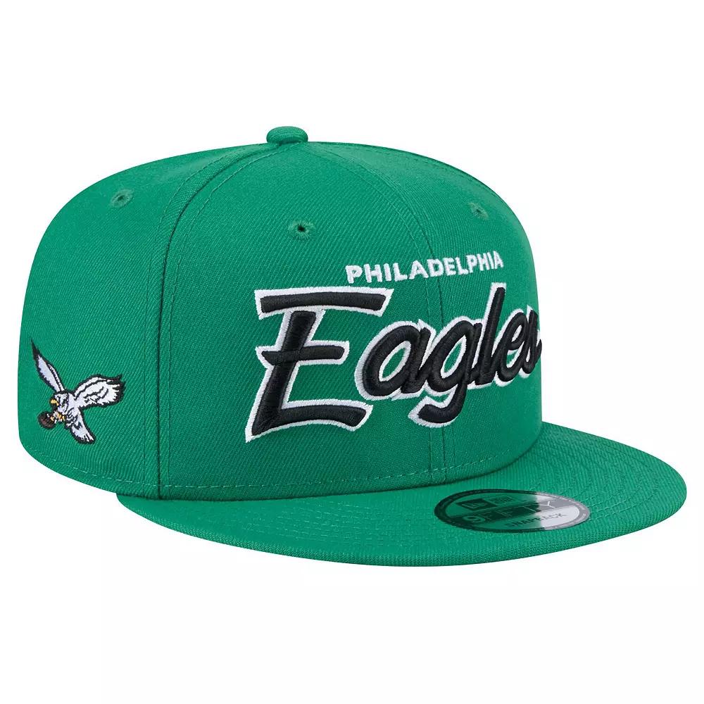 Complete your Philadelphia Eagles game day outfit with this New Era Main Script 9FIFTY Snapback Hat. This Philadelphia Eagles hat features a classic snapback design with a high crown and structured fit, making it a stylish and comfortable choice for any fan. The embroidered graphics with raised details add a touch of texture and dimension, showcasing your Philadelphia Eagles pride with a bold statement.Complete your Philadelphia Eagles game day outfit with this New Era Main Script 9FIFTY Snapback Hat. This Philadelphia Eagles hat features a classic snapback design with a high crown and structured fit, making it a stylish and comfortable choice for any fan. The embroidered graphics with raised details add a touch of texture and dimension, showcasing your Philadelphia Eagles pride with a bold statement.PRODUCT FEATURESOfficially licensedSnapbackHigh CrownFlat billStructured fitEmbroidered team logo on right sideImportedWipe clean with a damp clothOne size fits mostContrast-color undervisorSix panels with eyeletsMaterial: 100% Polyester - Crown; 100% Cotton - VisorBrand: New EraEmbroidered team wordmark with raised details on front Size: One Size. Color: Green. Gender: male. Age Group: adult.