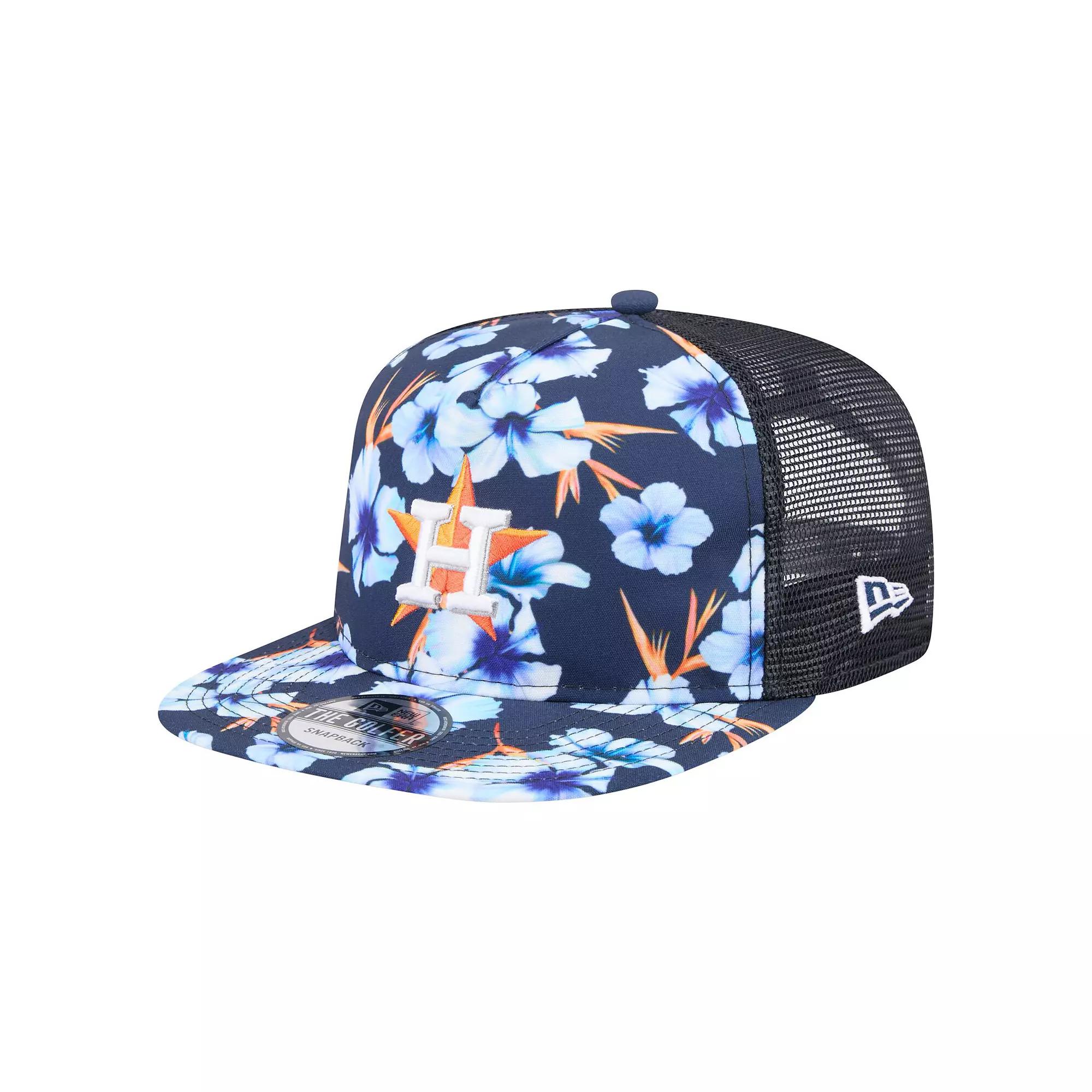 Take your Houston Astros fandom on an adventure with this New Era Adventure Pattern Golfer Trucker Snapback Hat. The Golfer silhouette gives this cap a retro look and feel thanks to its semi-structured build, pinched crown and flat visor. With an embroidered Houston Astros logo and sublimated floral print, this cap is as stylish as it is comfortable.Take your Houston Astros fandom on an adventure with this New Era Adventure Pattern Golfer Trucker Snapback Hat. The Golfer silhouette gives this cap a retro look and feel thanks to its semi-structured build, pinched crown and flat visor. With an embroidered Houston Astros logo and sublimated floral print, this cap is as stylish as it is comfortable.PRODUCT FEATURESSnapbackMaterial: 100% PolyesterMid CrownMesh mid and rear panelsFive-panel constructionSublimated floral print on front panel and visorImportedContrast-color undervisorSolid front panelWipe clean with a damp clothThe Golfer is a semi-structured cap, with a pinched crown and flat visor which gives a retro look and shape like snapbacks from the 80s and 90sFlat bill with ability to curveEmbroidered team logo with raised detailsOfficially licensedBrand: New EraUnstructured relaxed fit Size: One Size. Color: Navy. Gender: male. Age Group: adult.