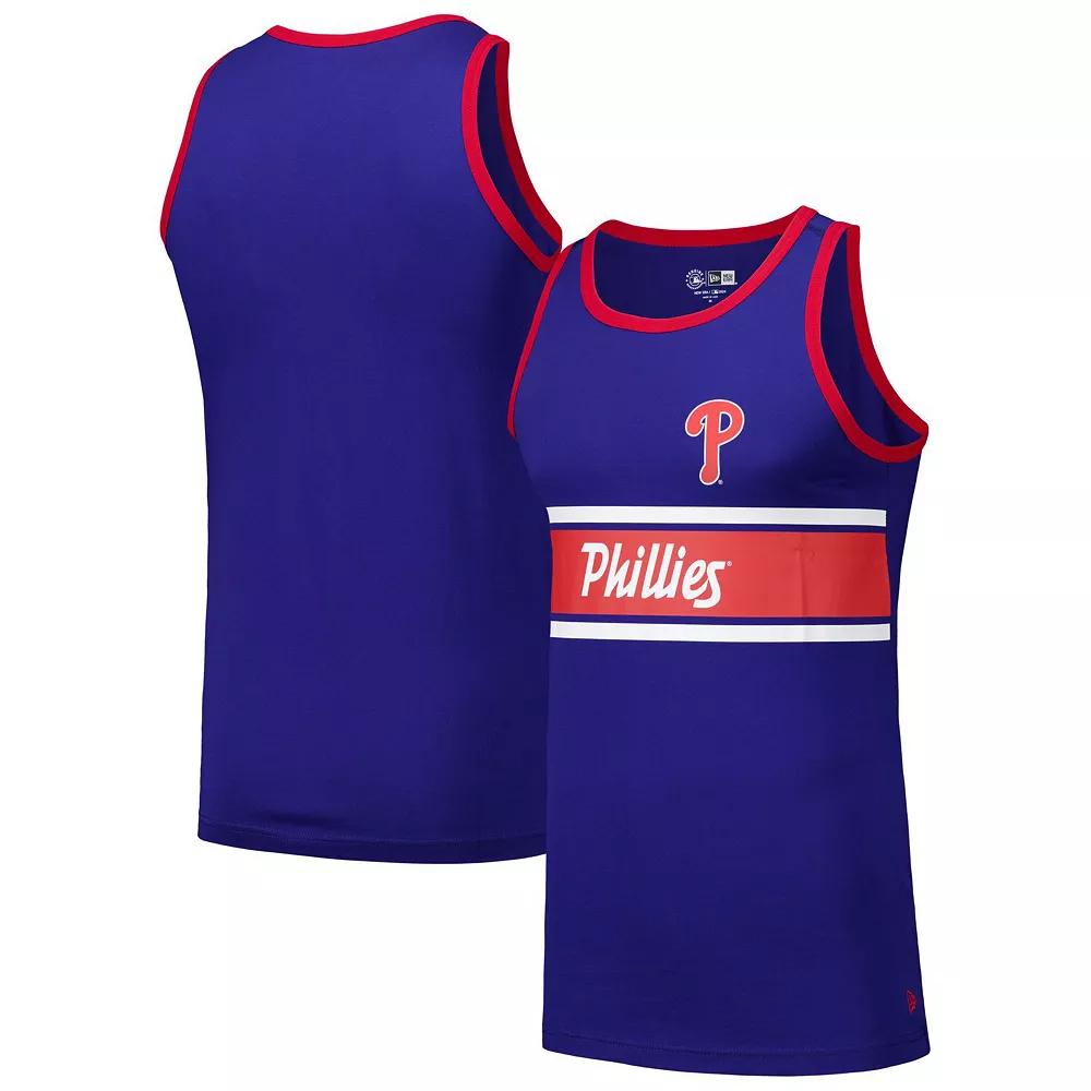 Rock a fresh take on Philadelphia Phillies pride with this New Era Jersey Ringer Tank Top. The contrasting trim highlights the team logo printed at the left chest, making it clear which team you support. This ringer tank is a must-have for any Philadelphia Phillies fan looking to rep their team in classic MLB style.Rock a fresh take on Philadelphia Phillies pride with this New Era Jersey Ringer Tank Top. The contrasting trim highlights the team logo printed at the left chest, making it clear which team you support. This ringer tank is a must-have for any Philadelphia Phillies fan looking to rep their team in classic MLB style.PRODUCT FEATURESMaterial: 100% CottonMachine wash with garment inside out, tumble dry lowOfficially licensedCrew neck for a classic look and more coverageTeam name accentuated by contrasting stripesBrand: New EraSleevelessContrasting trim highlights the team logo printed at left chest Color: Blue. Gender: male. Age Group: adult.