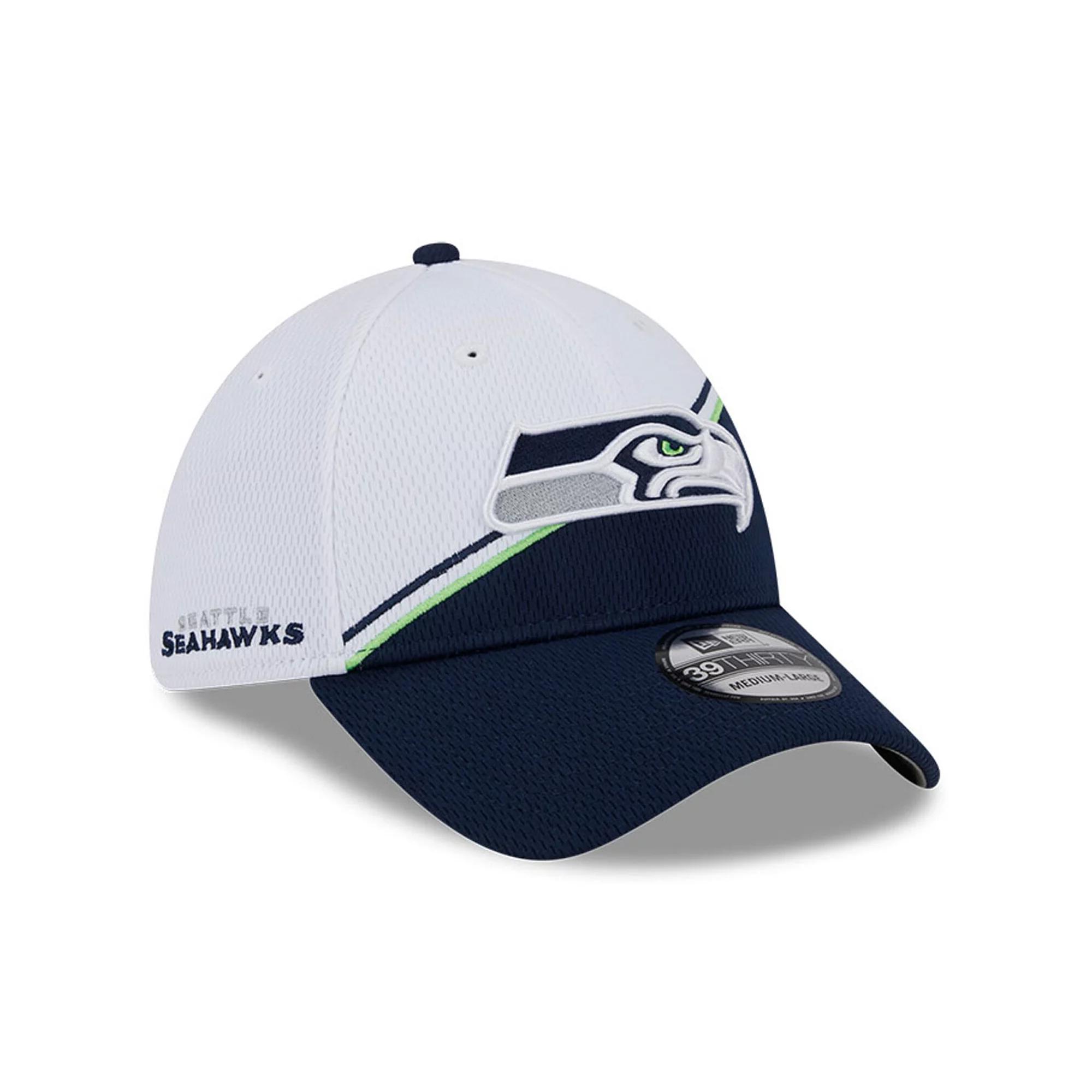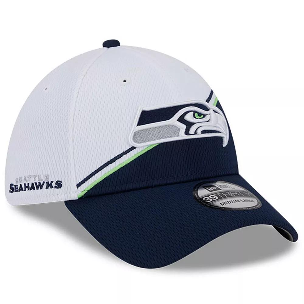 Gear up for the upcoming NFL season with this Seattle Seahawks 2023 Sideline 39THIRTY Flex Hat from New Era. This hat displays bold team colors and embroidered Seattle Seahawks graphics on the front panels. The official NFL shield is embroidered on the rear with the wordmark logo on the right side of the hat. Youll feel like an official member of the team when you match the players and coaches throughout the 2023 season.Gear up for the upcoming NFL season with this Seattle Seahawks 2023 Sideline 39THIRTY Flex Hat from New Era. This hat displays bold team colors and embroidered Seattle Seahawks graphics on the front panels. The official NFL shield is embroidered on the rear with the wordmark logo on the right side of the hat. Youll feel like an official member of the team when you match the players and coaches throughout the 2023 season.PRODUCT FEATURESStructured fitMid CrownMaterial: 100% PolyesterWipe clean with a damp clothImportedEmbroidered graphics with raised detailsSix solid panels with eyeletsCurved billBrand: New EraOfficially licensedStretch fit Size: L/XL. Color: White. Gender: male. Age Group: adult.