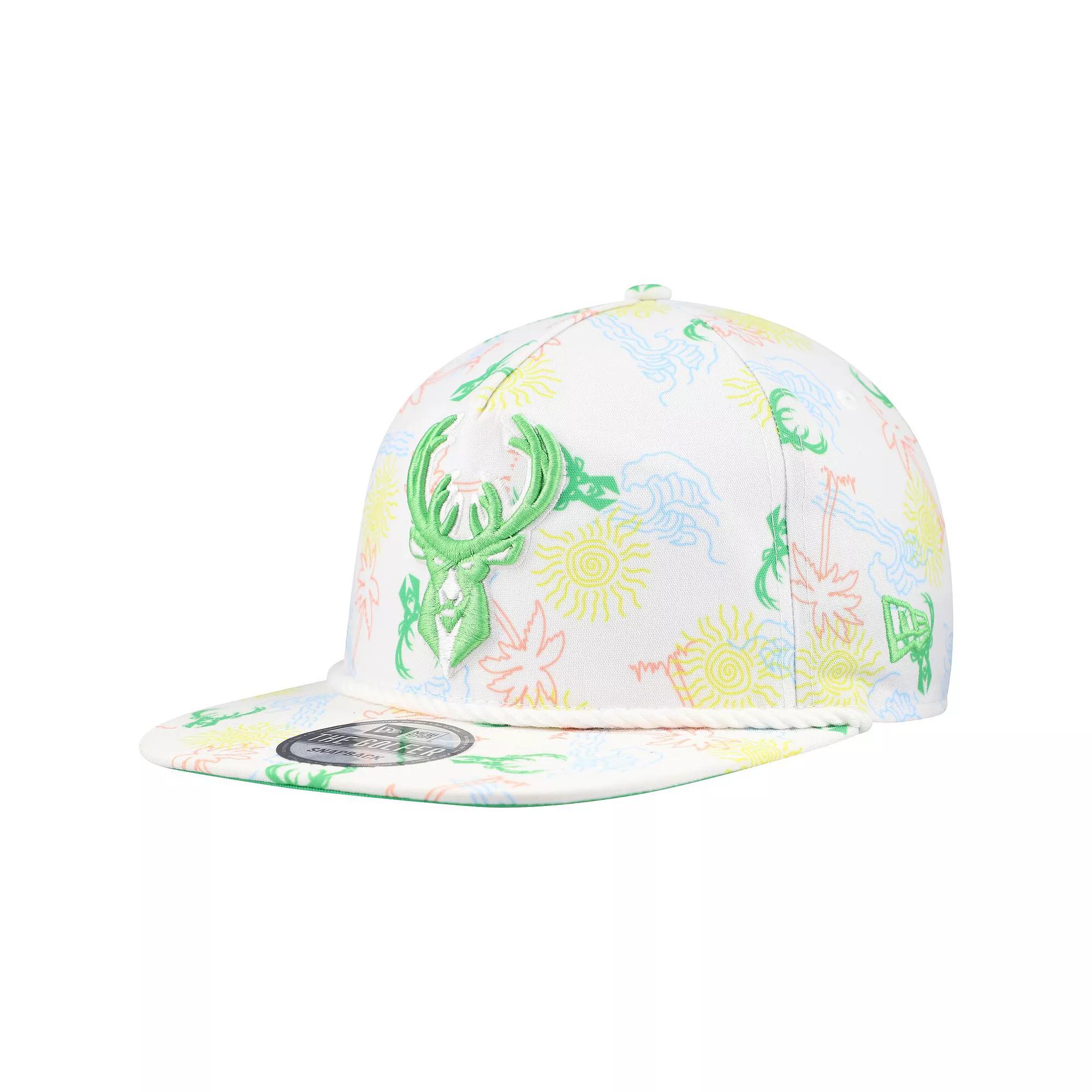 Showcase your unrelenting Milwaukee Bucks fandom by topping things off with this Golfer hat from New Era. It features a bold team logo embroidered across the front panels and a rope decoration resting below it on the bill. The sublimated palm trees and waves design add a striking touch, while the snap closure ensures your perfect fit is never more than a snap or two away.Showcase your unrelenting Milwaukee Bucks fandom by topping things off with this Golfer hat from New Era. It features a bold team logo embroidered across the front panels and a rope decoration resting below it on the bill. The sublimated palm trees and waves design add a striking touch, while the snap closure ensures your perfect fit is never more than a snap or two away.PRODUCT FEATURESMid CrownSnap ClosureWipe clean with a damp clothMaterial: 100% PolyesterRope decoration on visorSublimated graphicsContrast-color undervisorFive panels with mid and rear eyeletsEmbroidered graphics with raised detailsImportedOne size fits mostUnstructured relaxed fitBrand: New EraFlat billOfficially licensed Size: One Size. Color: White. Gender: male. Age Group: adult. Material: COTTON.