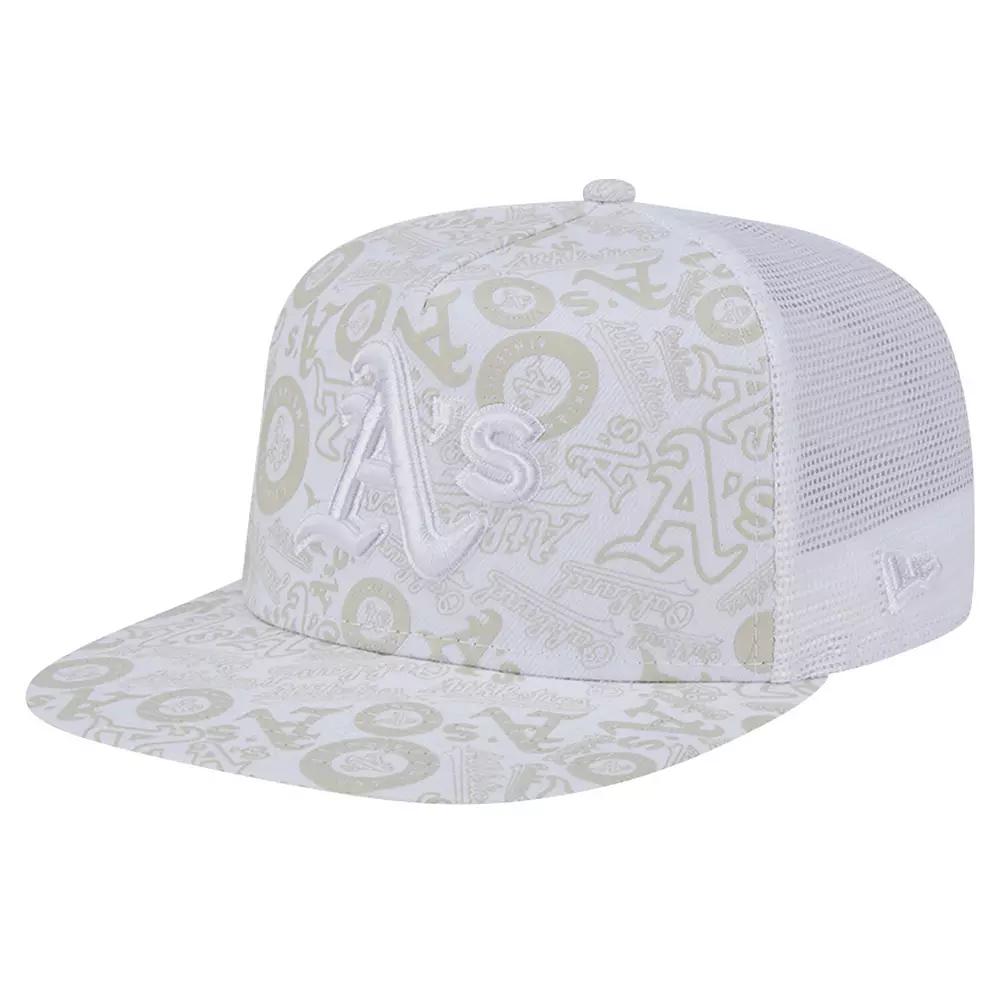 Leave no doubts about your loyalty to the Oakland Athletics with this Logo Dunes A-Frame Trucker 9FIFTY hat. Made by New Era, it features the Oakland Athletics logo in raised embroidery and an allover team pattern on the front. This snapback is quick and easy to adjust, and mesh panels provide a breezy feel.Leave no doubts about your loyalty to the Oakland Athletics with this Logo Dunes A-Frame Trucker 9FIFTY hat. Made by New Era, it features the Oakland Athletics logo in raised embroidery and an allover team pattern on the front. This snapback is quick and easy to adjust, and mesh panels provide a breezy feel.PRODUCT FEATURESHigh CrownImportedStructured fitOne size fits mostOne solid front panelWipe clean with a damp clothContrast-color undervisorOfficially licensedSublimated designFour mesh mid and rear panelsMaterial: 100% PolyesterSnapbackBrand: New EraFlat billEmbroidered graphics with raised details Size: One Size. Color: White. Gender: male. Age Group: adult. Material: COTTON.
