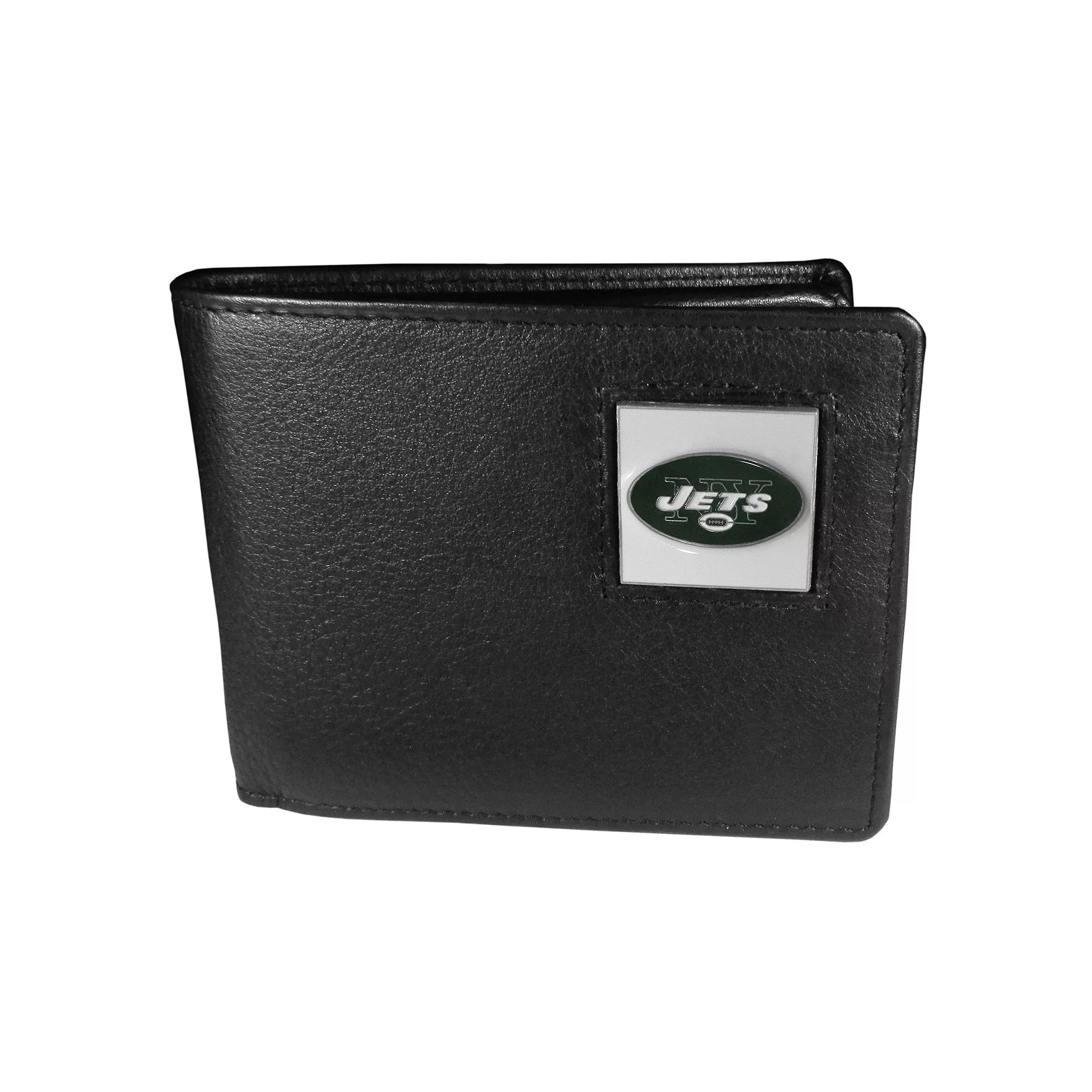 Add some value to your fan gear with this men's New York Jets bifold wallet. 8 card slots Billfold pocket Flip out windowed ID slot Boxed for gift giving 6" x 6" x 1.25" Genuine fine grain leather Spot clean Imported Shop our full assortment of New York Jets items here. When you’re a fan, you’re family! Size: One Size. Color: Black. Gender: male. Age Group: adult.
