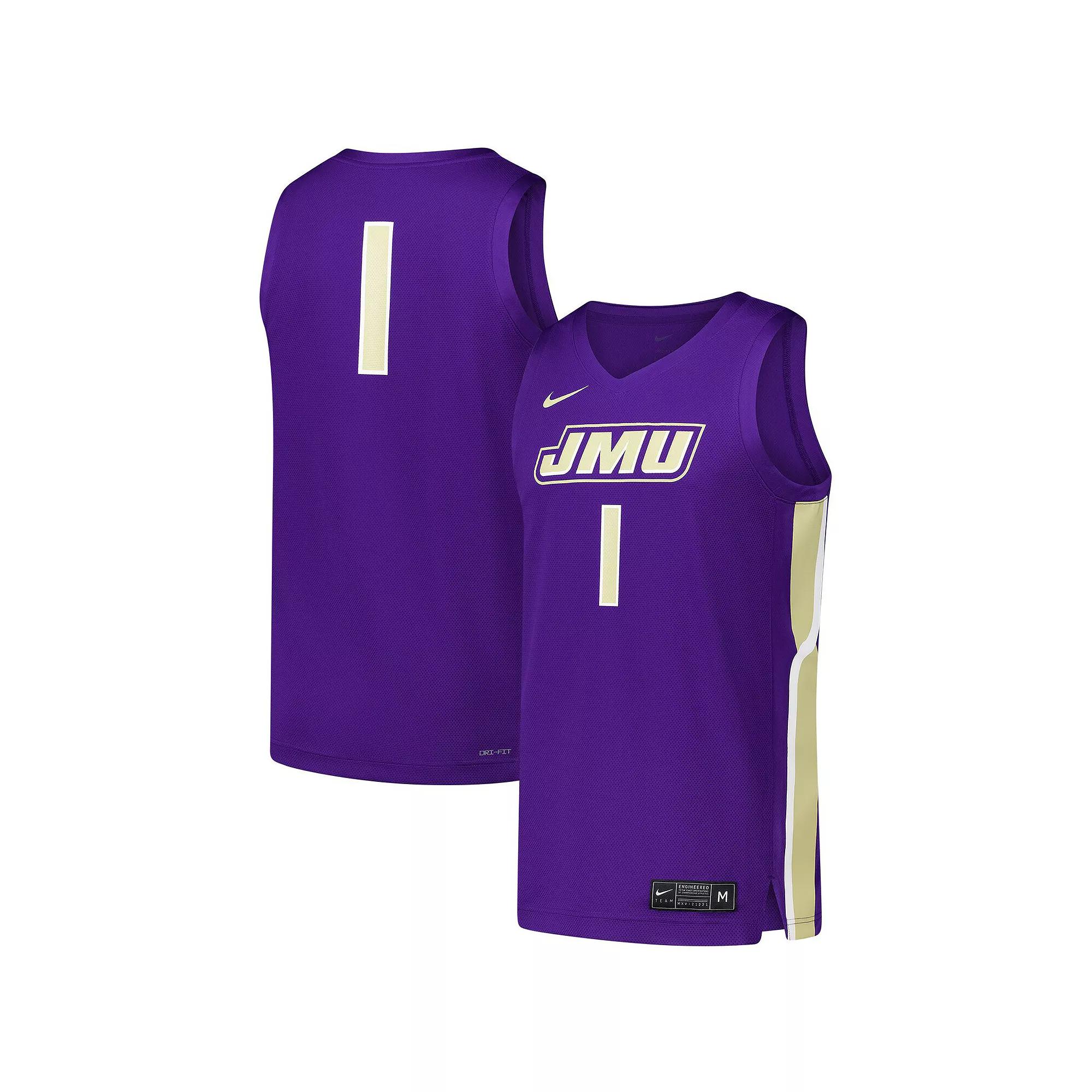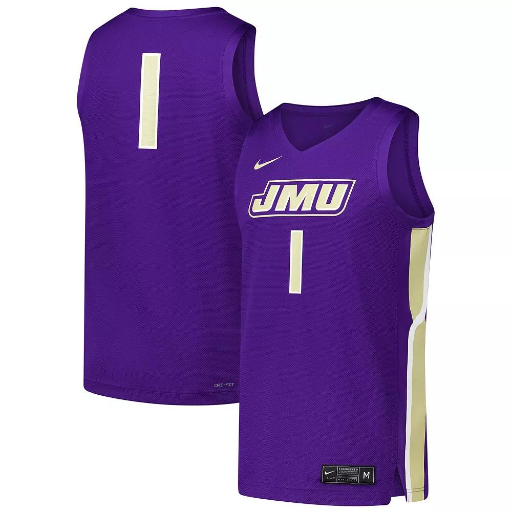 Look ready to hit the hardwood for your favorite college team in this James Madison Dukes Replica Basketball Jersey from Nike. Its lightweight, breathable mesh fabric is enhanced with sweat-wicking Dri-FIT technology to keep you cool and dry while playing or cheering from the stands. Screen print graphics on the front and back of this James Madison Dukes jersey provide a classic design.Look ready to hit the hardwood for your favorite college team in this James Madison Dukes Replica Basketball Jersey from Nike. Its lightweight, breathable mesh fabric is enhanced with sweat-wicking Dri-FIT technology to keep you cool and dry while playing or cheering from the stands. Screen print graphics on the front and back of this James Madison Dukes jersey provide a classic design.PRODUCT FEATURESReplicaOfficially licensedMaterial: 100% PolyesterDri-FIT technology wicks away moistureMachine wash, tumble dry lowScreen print graphics on the front and backBrand: NikeSleevelessSide insetsMove To Zero apparel labeled sustainable materials is made with at least 50% recycled content as part of Nikes journey toward a zero carbon and zero waste futureV-neckImportedMesh fabric delivers enhanced breathability Color: Jmd Purple. Gender: male. Age Group: adult.
