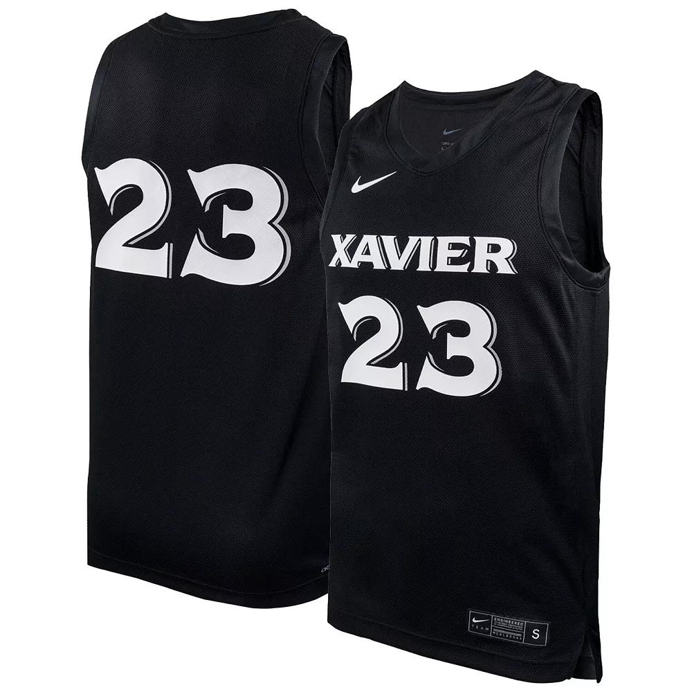 Rep the Xavier with confidence in this Replica Jersey. Along with its lightweight polyester, this jersey is designed with sweat-wicking technology to help keep you dry and comfortable for all 40 minutes of action. Benefits: Nike Dri-FIT technology moves sweat away from your skin for quicker evaporation, helping you stay dry and comfortable. Rounded drop-tail hem helps provide proper coverage. Product Details: 100% polyester. Machine wash. Imported. Style: FN5200459T4; Color: Black; Size: L; Gender: Male; Age Group: Adult | Xavier Replica Men's Nike College Basketball Jersey in Black, Size: Large | FN5200459T4-XAV