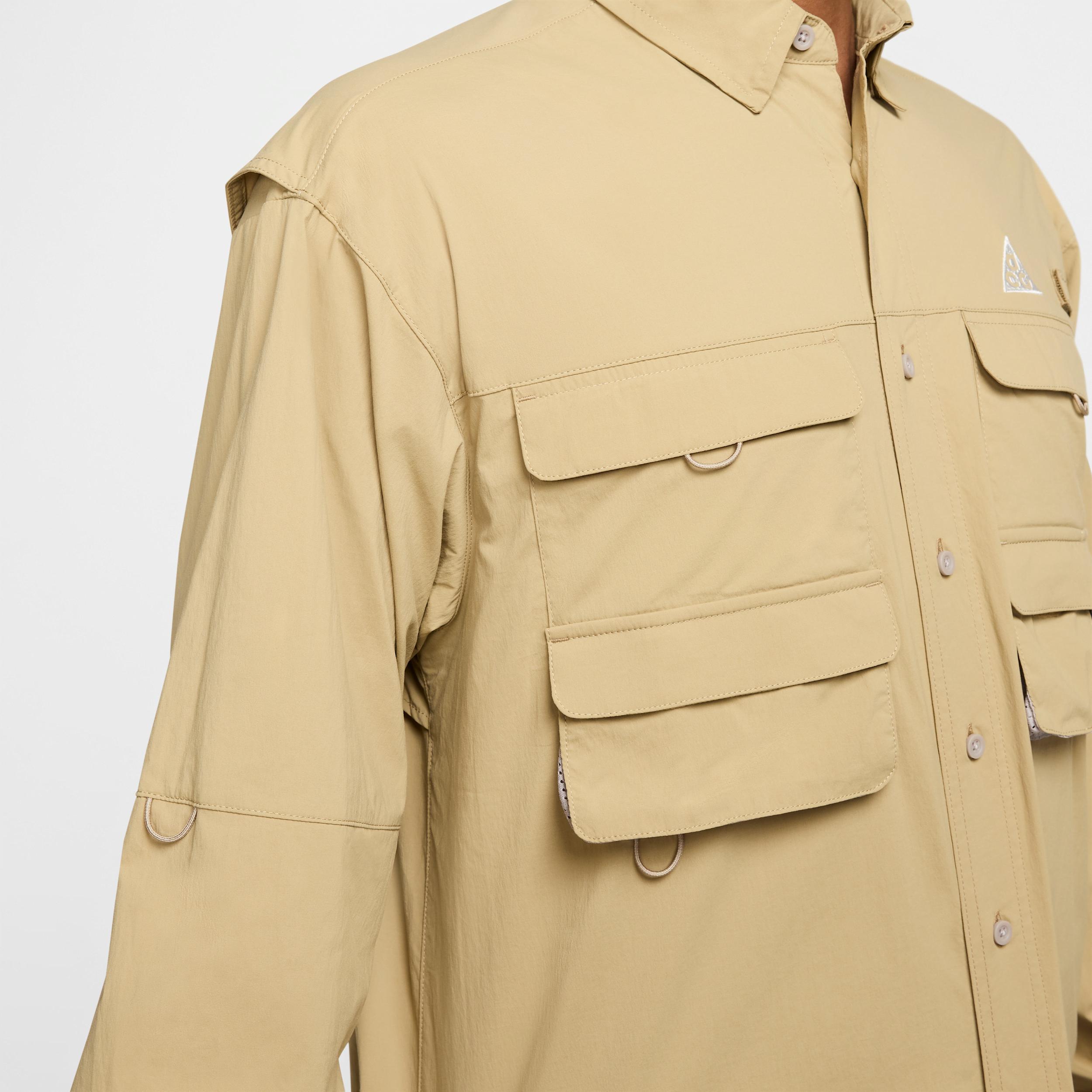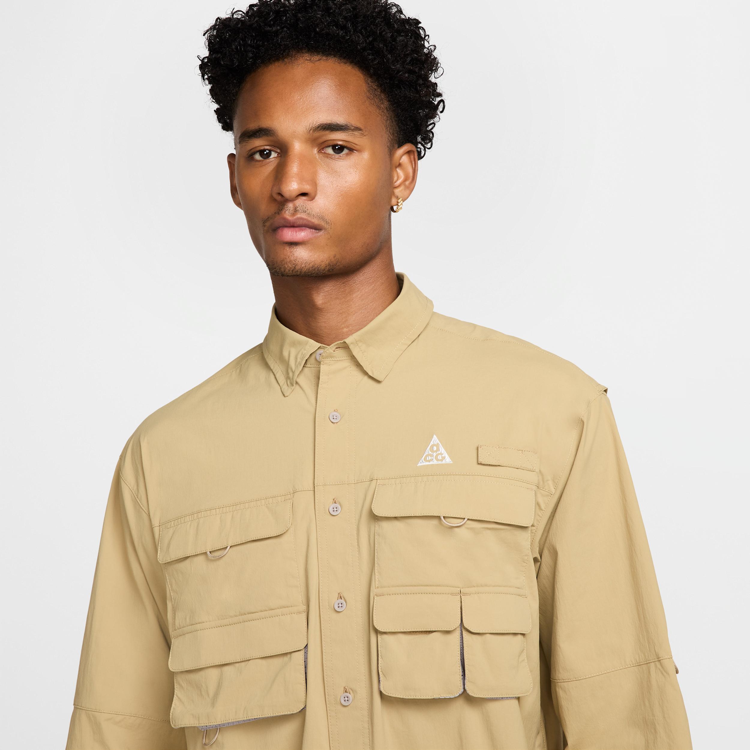 Inspired by the climate of Costa Rica, we designed this long-sleeve shirt to cover you from tough conditions. The breathable, woven fabric is also quick-drying and lightweight to help keep you dry and comfortable on hot and humid adventures. Rainforest Inspiration:To create this collection, the ACG team took a 46-mile expedition deep into the rainforest and along the coastline of Corcovado National Park in Costa Rica. The trip offered inspiration to create gear that stands up to hot and humid adventures. Stay Dry:Nike Dri-FIT ADV technology combines moisture-wicking fabric with advanced engineering and features to help you stay dry and comfortable. Equipped for Adventure:A mesh-lined vent at the back allows for quicker drying and temperature control. The vented chest pockets are perfect for smaller items like lures and include a rod strap for added functionality. More Benefits:The loose fit feels roomy through the body for easy movement and layering. This product provides UVA and UVB protection from the sun only in the areas covered by the garment. To protect exposed areas, the use of good quality sunscreen is recommended. Product Details:Embroidered ACG and Nike Dri-FIT logos. Woven ACG patch at center back. Internal "Orb Weaver" storytelling label. Body: 93% nylon/7% spandex. Mesh: 100% polyester. Machine wash. Imported. Style: HJ2465; Color: Parachute Beige/College Grey/Summit White; Size: L; Gender: Male; Age Group: Adult | Nike ACG "Orb Weaver" Dri-FIT ADV UV Long-Sleeve Shirt in Brown, Size: Large | HJ2465-297