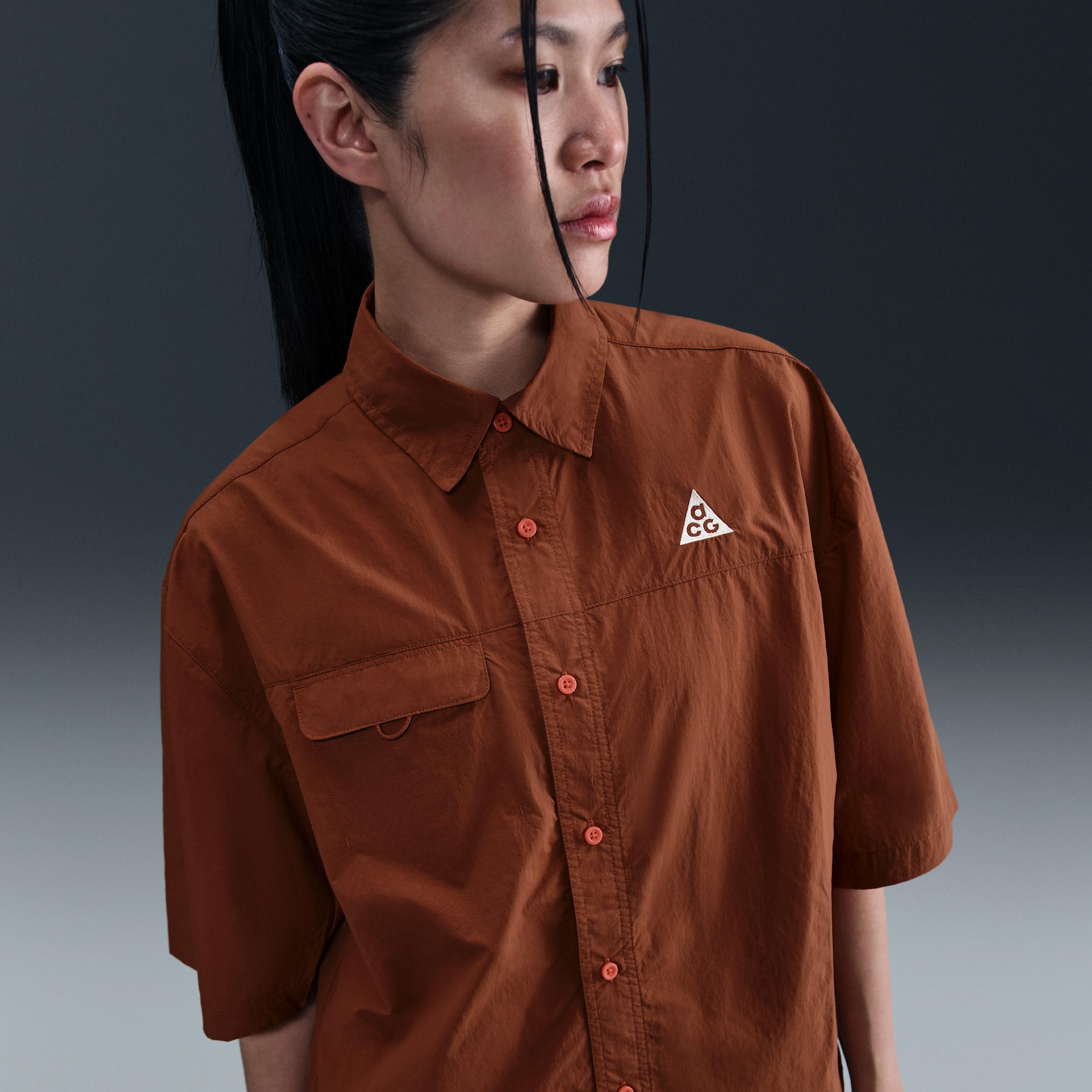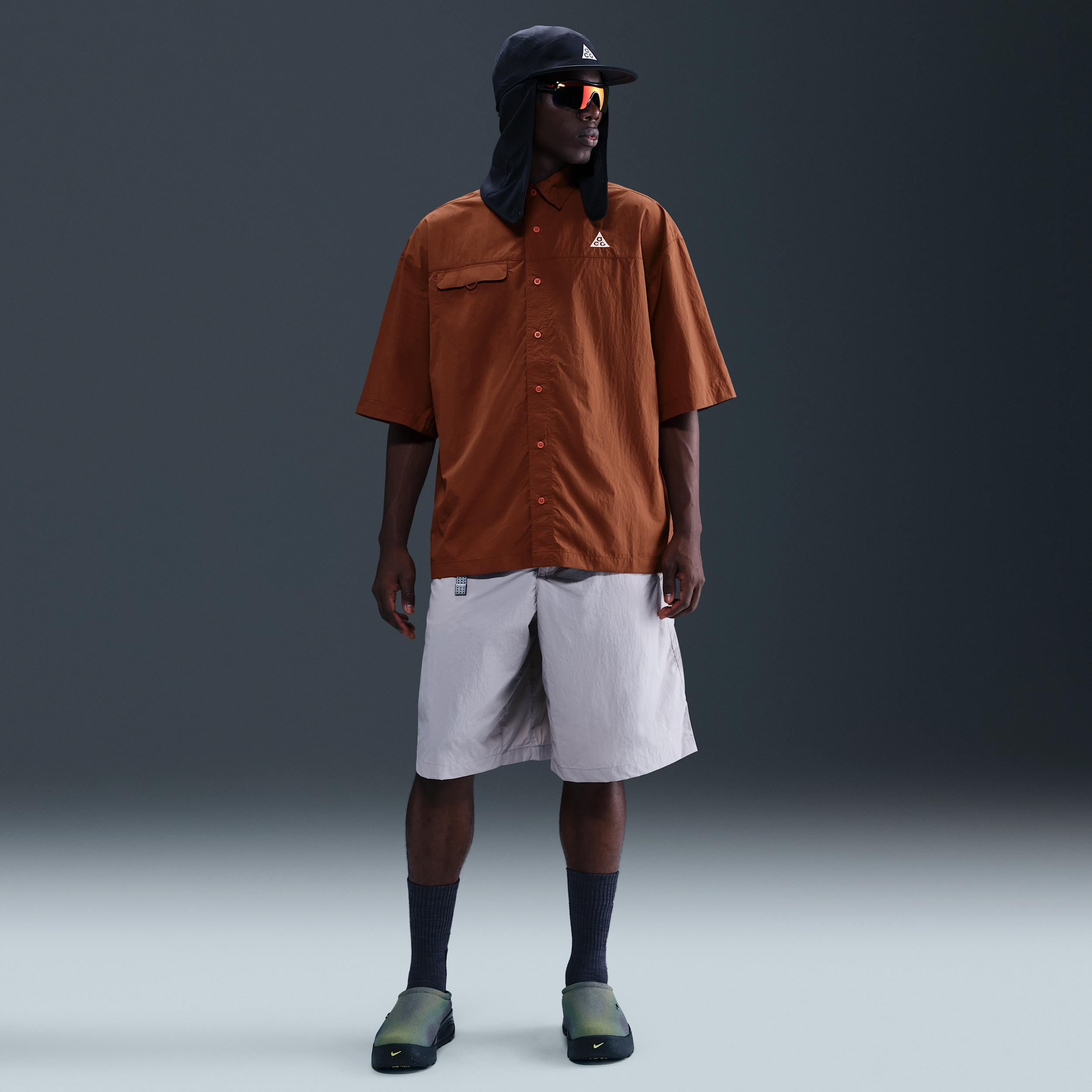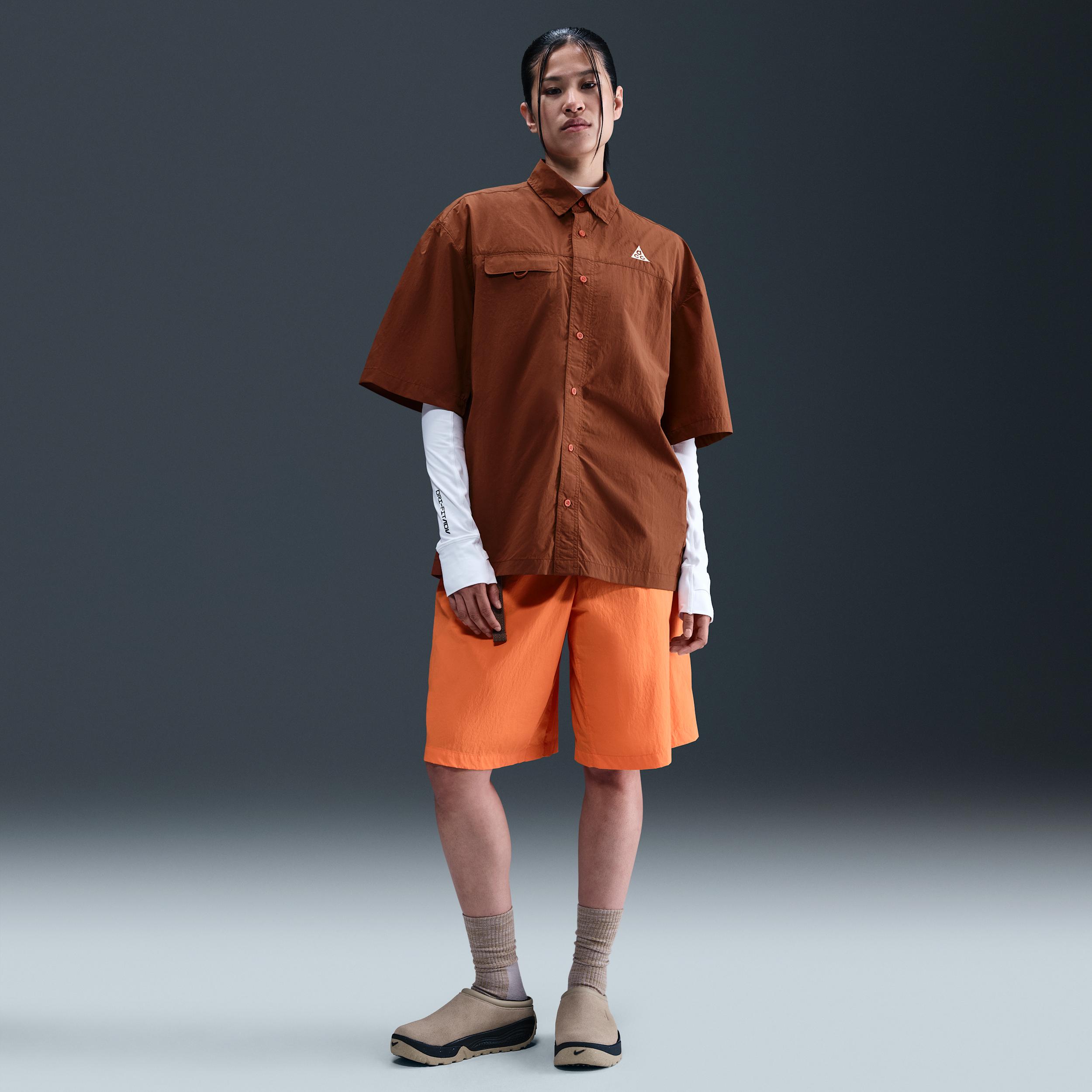 Inspired by the climate of Costa Rica, we designed this button-down shirt to help you stay comfortable in harsh conditions. The lightweight and breathable fabric blocks rain and UV rays to help keep you dry and comfortable on hot and humid adventures. Rainforest Inspiration:To create this collection, the ACG team took a 46-mile expedition deep into the rainforest and along the coastline of Corcovado National Park in Costa Rica. The trip offered inspiration to create gear that stands up to hot and humid adventures. Ready for the Weather:Water-repellent, quick-drying and breathable, the fabric is perfect for humid conditions and unexpected showers. The mesh-lined chest pocket doesn't hold water, helping the shirt dry more quickly after it gets wet. More Benefits: The oversized fit is designed to with extra roomy through the body and sleeves that hit at or just below the elbows. This product provides UVA and UVB protection from the sun only in the areas covered by the garment. To protect exposed areas, the use of good quality sunscreen is recommended. Product Details:Embroidered ACG and Swoosh logos. Internal Orb Weaver story label. 100% nylon. Machine wash. Imported. Style: HJ2883; Color: Cinnamon/Picante Red/Summit White; Size: 2XL; Gender: Male; Age Group: Adult | Nike ACG "Orb Weaver" UV Repel Short-Sleeve Shirt in Brown, Size: 2XL | HJ2883-245
