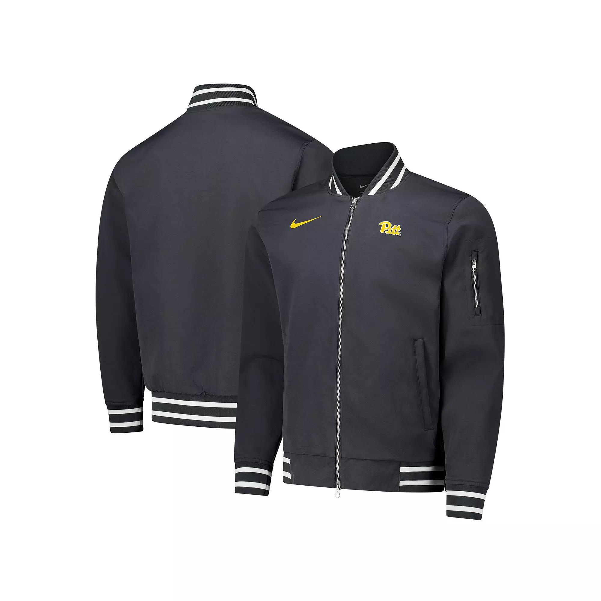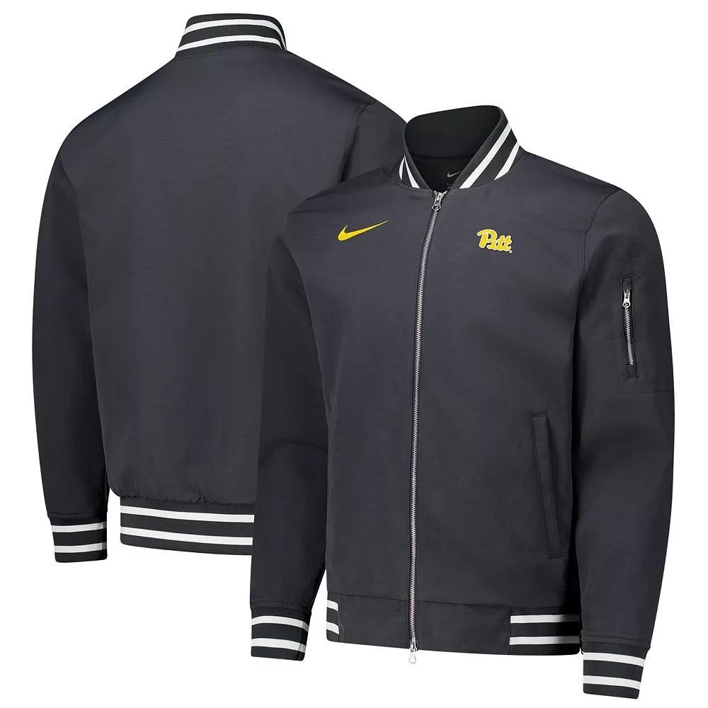 Stay warm while representing the Pitt Panthers with this Nike Full-Zip Bomber Jacket. This sleek bomber jacket features a microfleece lining and striped rib-knit accents for warmth and comfort during those chilly game days. With multiple pockets and a zippered sleeve pocket, youll have plenty of space to stash your essentials while representing your favorite team in style.Stay warm while representing the Pitt Panthers with this Nike Full-Zip Bomber Jacket. This sleek bomber jacket features a microfleece lining and striped rib-knit accents for warmth and comfort during those chilly game days. With multiple pockets and a zippered sleeve pocket, youll have plenty of space to stash your essentials while representing your favorite team in style.PRODUCT FEATURESBrand: NikeMachine wash with garment inside out, tumble dry lowMove To Zero apparel labeled sustainable materials is made with at least 50% recycled content as part of Nikes journey toward a zero carbon and zero waste futureTwo front pockets with zip closureOfficially licensedStriped rib-knit cuffs, stand-up collar and hem for a secure fitImportedLong sleeveMaterial: 100% Polyester - Shell and Lining; 95% Polyester/5% Elastane - RibHem with side zippersMidweight jacket suitable for moderate temperaturesZippered pocket on left arm for storing small itemsOne interior pocketMicrofleece liningFull ZipEmbroidered team logo graphics on left chest Color: Grey. Gender: male. Age Group: adult. Material: COTTON.
