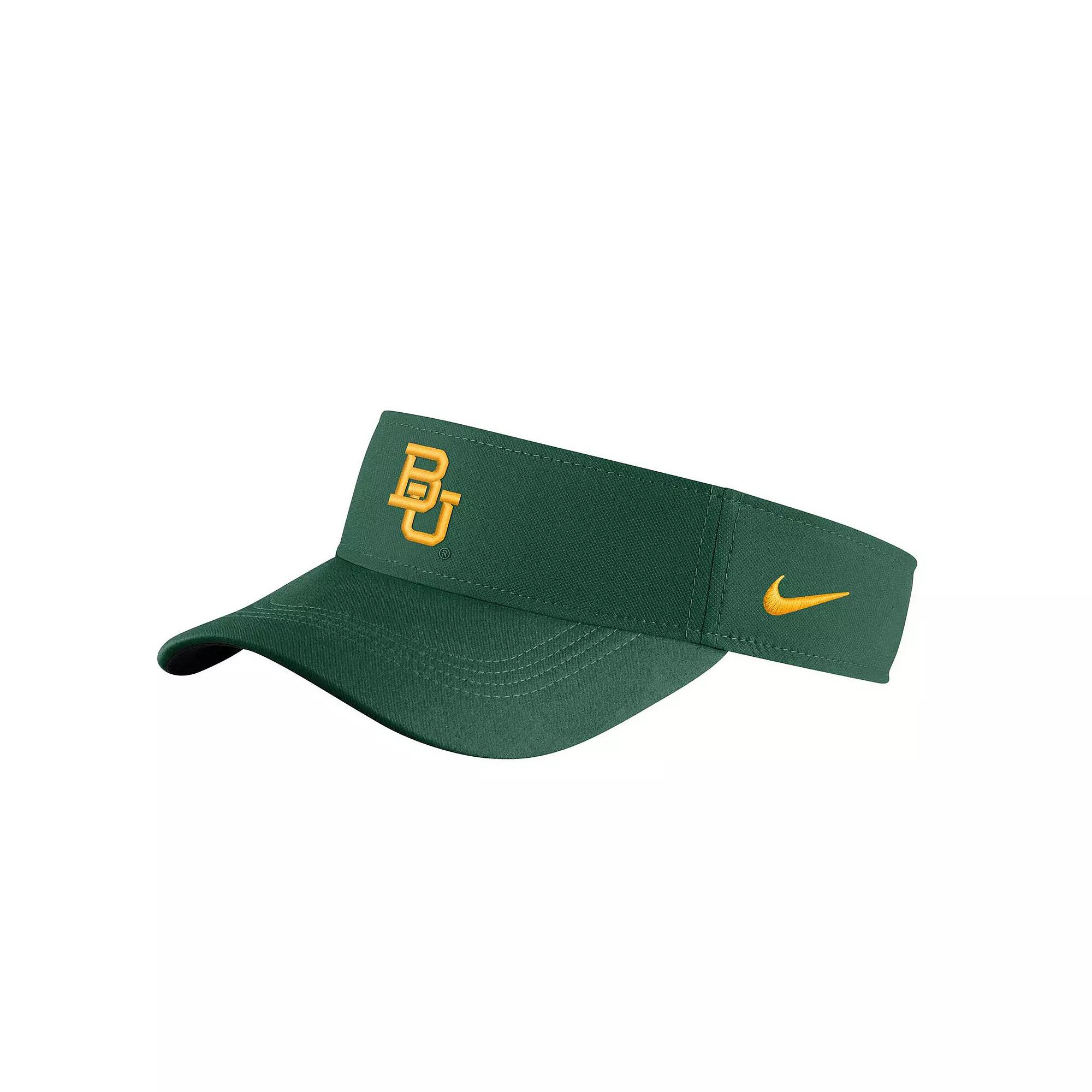 Block out unnecessary brightness while keeping your head fresh and clean with this Baylor Bears Sideline visor from Nike. Built with moisture-wicking Dri-FIT and AeroBill technology, this striking hat is just what you need to protect yourself from the sun while maintaining breathability. Plus, the striking team graphics add an authentic touch of Baylor Bears flair to your growing collection.Block out unnecessary brightness while keeping your head fresh and clean with this Baylor Bears Sideline visor from Nike. Built with moisture-wicking Dri-FIT and AeroBill technology, this striking hat is just what you need to protect yourself from the sun while maintaining breathability. Plus, the striking team graphics add an authentic touch of Baylor Bears flair to your growing collection.PRODUCT FEATURESAdjustable hook and loop fastener strapOfficially licensedCurved billDri-FIT technology wicks away moistureMaterial: 100% PolyesterWipe clean with a damp clothImportedEmbroidered graphics with raised detailsBrand: NikeAeroBill technology wicks sweat away and provides lightweight breathabilityOne size fits most Size: One Size. Color: Green. Gender: male. Age Group: adult.