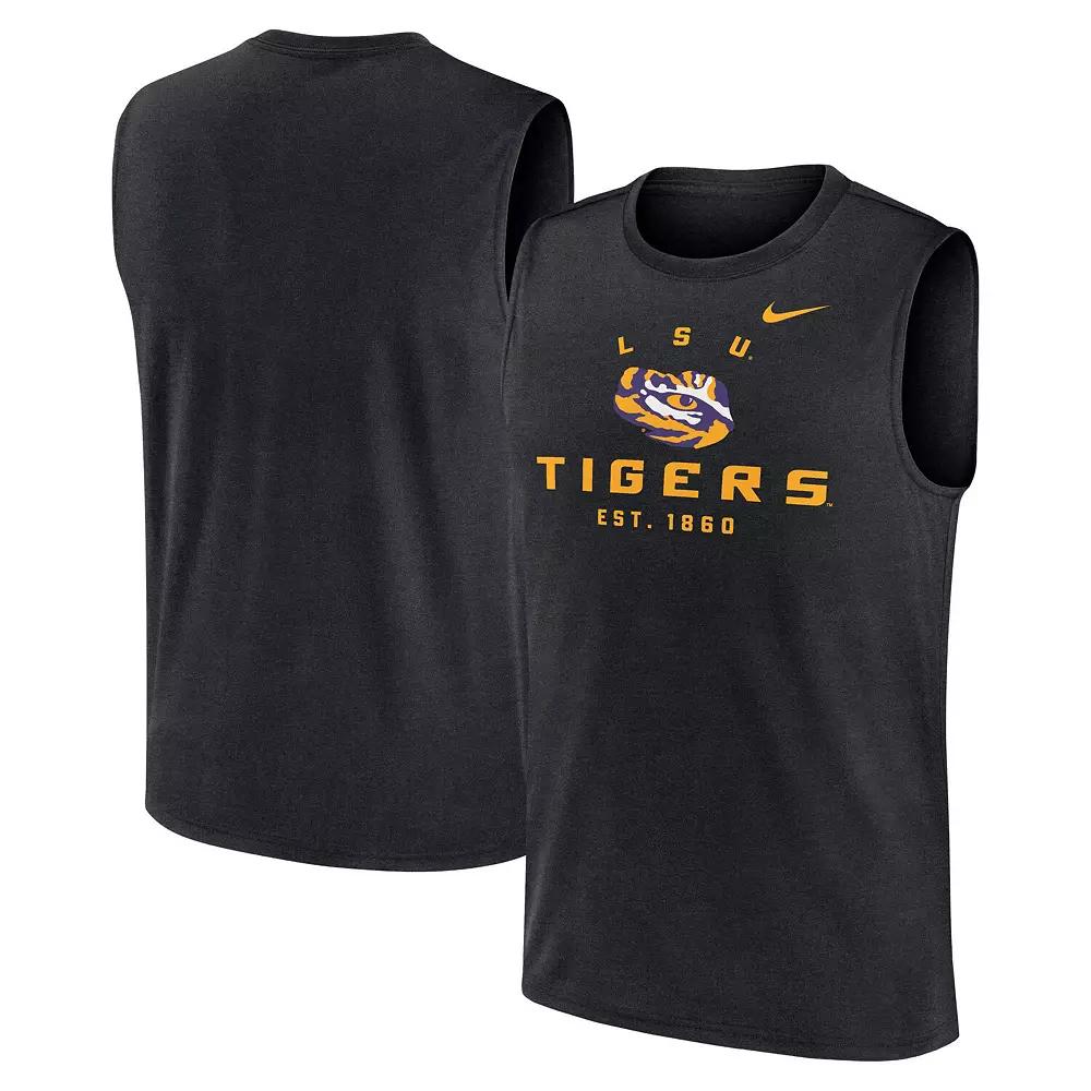 Channel the electric energy of LSU Tigers game days with the Nike Primetime Legend Lock Up Performance Muscle Tank Top. The comfortable jersey fabric offers a soft and lightweight feel, while the schools established year screen printed below the team name and logo across the chest adds a touch of vintage charm. Whether youre sweating it out on the court or cheering on the Tigers from the stands, this tank top is the perfect way to show your team spirit in comfort and style.Channel the electric energy of LSU Tigers game days with the Nike Primetime Legend Lock Up Performance Muscle Tank Top. The comfortable jersey fabric offers a soft and lightweight feel, while the schools established year screen printed below the team name and logo across the chest adds a touch of vintage charm. Whether youre sweating it out on the court or cheering on the Tigers from the stands, this tank top is the perfect way to show your team spirit in comfort and style.PRODUCT FEATURESMachine wash, tumble dry lowSchools established year screen printed below team name and logo across the chestSleevelessMaterial: 100% Recycled PolyesterImportedDri-FIT technology wicks away moistureScreen print graphicsCrew neckJersey fabric has a soft, lightweight feelOfficially licensedBrand: Nike Size: 2XL. Color: Black. Gender: male. Age Group: adult. Material: COTTON.