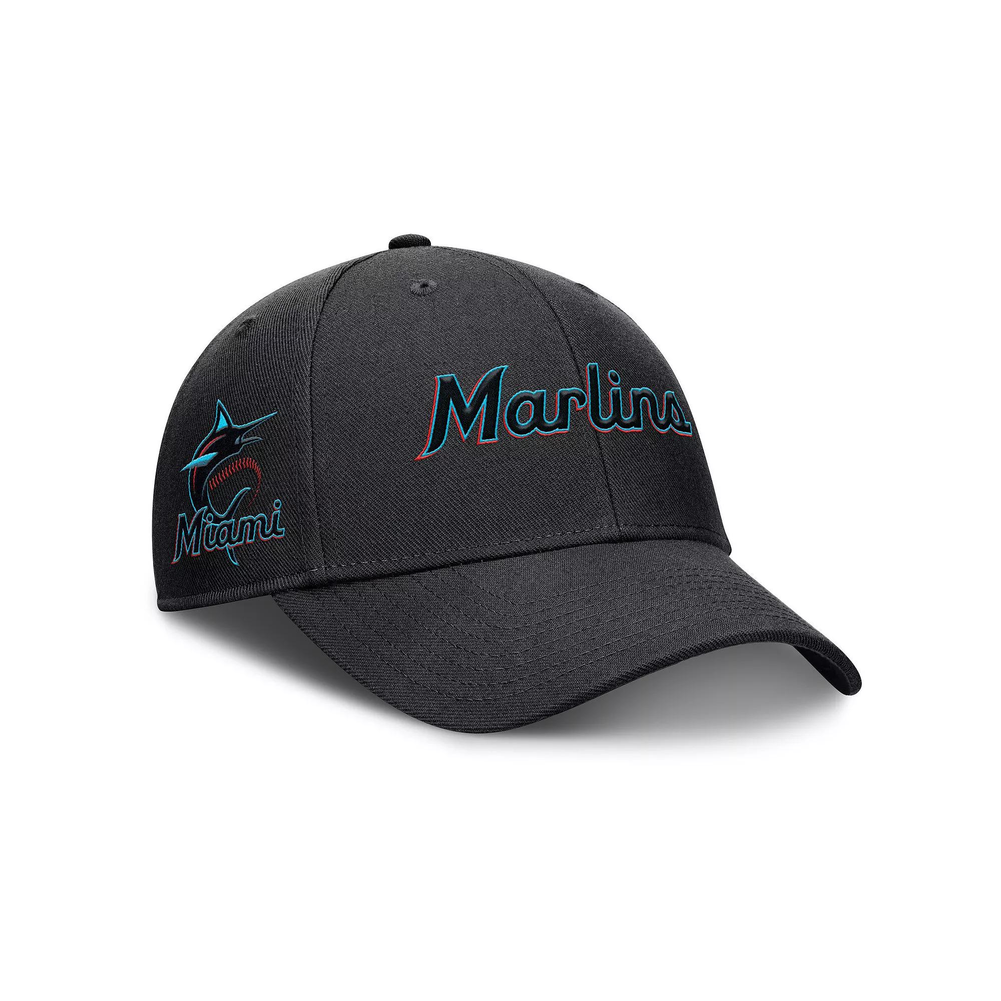 Represent the Miami Marlins from multiple angles with this Rise Gaberdine Adjustable Hat by Nike. It features team details embroidered on the front, back and side panel to make your fandom undeniable. A snap closure lets you quickly and easily adjust the fit of this Miami Marlins hat for comfortable wearing all day.Represent the Miami Marlins from multiple angles with this Rise Gaberdine Adjustable Hat by Nike. It features team details embroidered on the front, back and side panel to make your fandom undeniable. A snap closure lets you quickly and easily adjust the fit of this Miami Marlins hat for comfortable wearing all day.PRODUCT FEATURESStructured fitMaterial: 100% PolyesterSnap ClosureWipe clean with a damp clothBrand: NikeCurved billTeam patch embroidered on right-side panelOfficially licensedMid CrownImportedSix panels with eyeletsEmbroidered team logo with raised details on the front and back Size: M/L. Color: Black. Gender: male. Age Group: adult. Material: COTTON.
