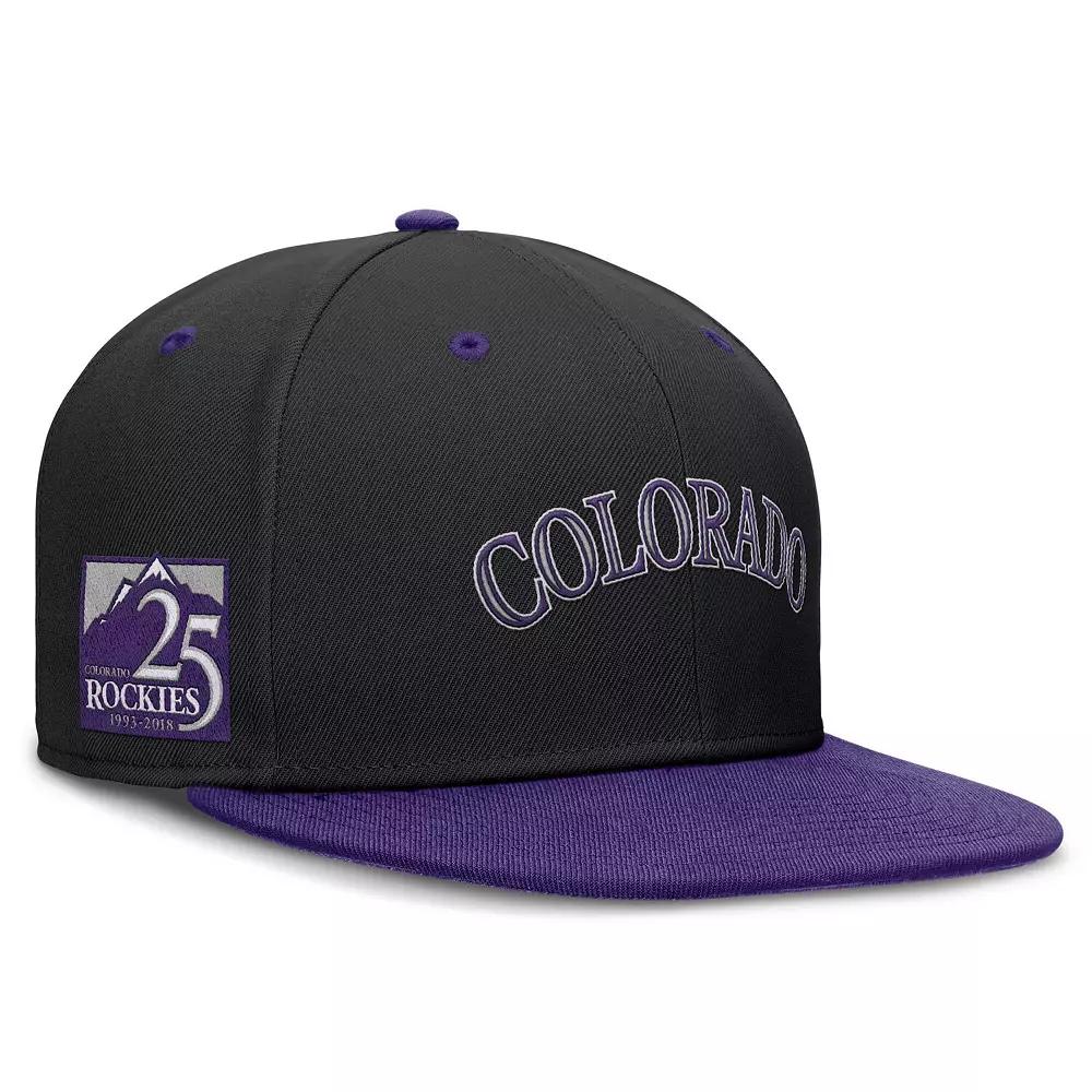 Commemorate the Colorado Rockies 25th anniversary with this True Primetime Two-Tone Performance Fitted Hat from Nike. This commemorative hat celebrates the Colorado Rockies 25th anniversary with a unique graphic on the right side, making it a must-have for any diehard fan. The high crown and structured fit provide a modern and comfortable feel, while the embroidered team logo on the front and wordmark on the back proudly display your Rockies pride.Commemorate the Colorado Rockies 25th anniversary with this True Primetime Two-Tone Performance Fitted Hat from Nike. This commemorative hat celebrates the Colorado Rockies 25th anniversary with a unique graphic on the right side, making it a must-have for any diehard fan. The high crown and structured fit provide a modern and comfortable feel, while the embroidered team logo on the front and wordmark on the back proudly display your Rockies pride.PRODUCT FEATURESFlat billFittedHigh CrownOfficially licensedSix panels with eyeletsMaterial: 100% PolyesterImportedGraphic on right side commemorates the franchises 25th anniversaryContrast-color underbillWipe clean with a damp clothDri-FIT technology wicks away moistureStructured fitEmbroidered team logo on front and wordmark on backBrand: Nike Size: 7. Color: Black. Gender: male. Age Group: adult.
