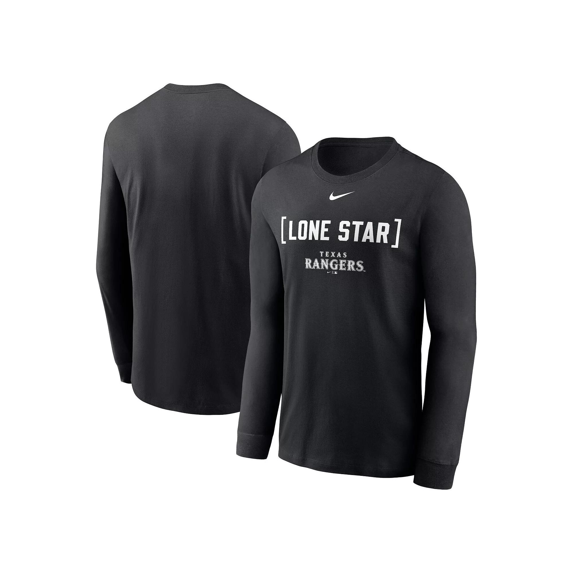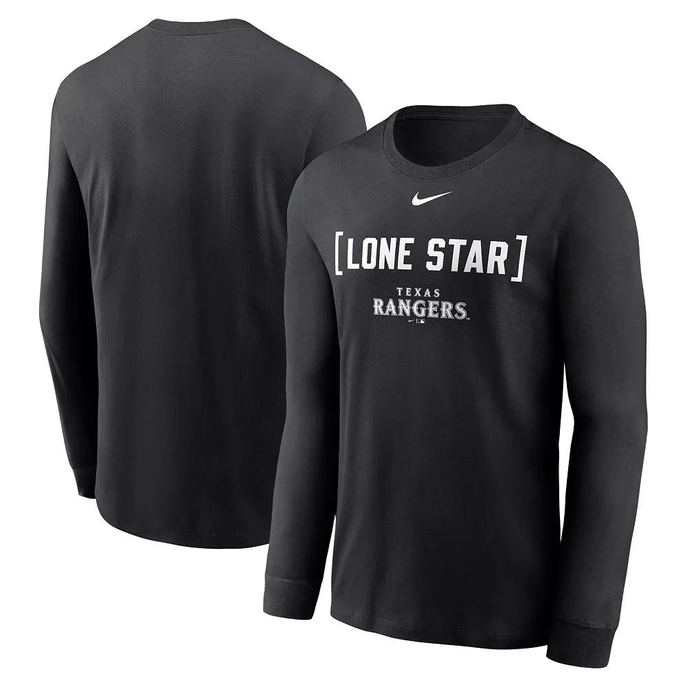 Rep your Texas Rangers fandom with local pride in this Nike Local Nickname Long Sleeve T-Shirt. With a classic crew neck and rib-knit cuffs, this long sleeve tee provides a comfortable and stylish fit thats perfect for everyday wear. The moniker boldly displayed across the torso lets everyone know youre a true fan of the Texas Rangers.Rep your Texas Rangers fandom with local pride in this Nike Local Nickname Long Sleeve T-Shirt. With a classic crew neck and rib-knit cuffs, this long sleeve tee provides a comfortable and stylish fit thats perfect for everyday wear. The moniker boldly displayed across the torso lets everyone know youre a true fan of the Texas Rangers.PRODUCT FEATURESNike Swoosh printed below collarLocal moniker printed across the torsoMaterial: 100% CottonOfficially licensedBrand: NikeMachine wash, tumble dry lowLong sleeveRib-knit cuffsCrew neckImported Size: XL. Color: Black. Gender: male. Age Group: adult.