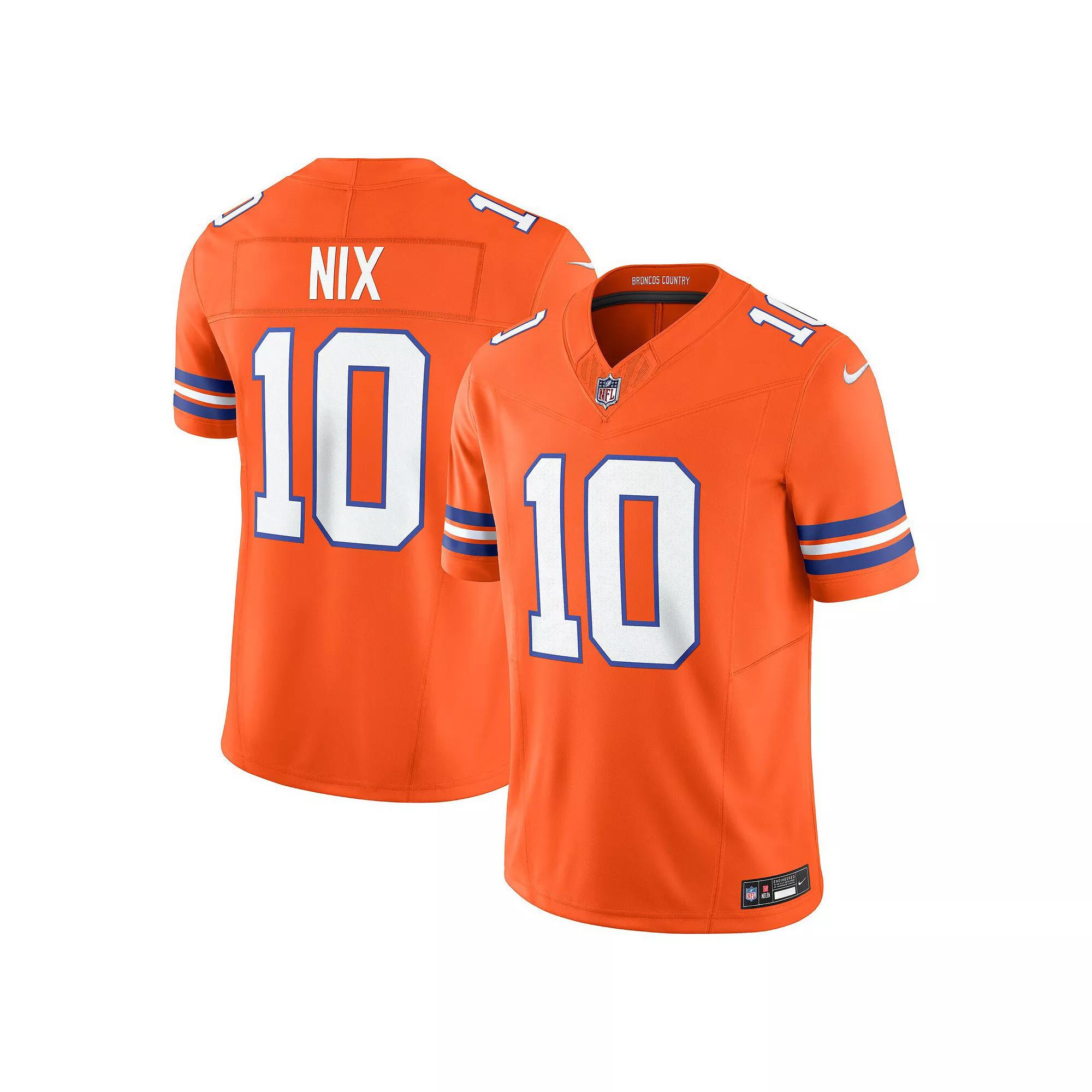 Walking into the stadium, you feel a rush of energy pass over you. You adjust your Denver Broncos Nike Limited jersey and know you're ready to get swept up in the electricity of the game. Made for authenticity-seeking fans, this state-of-the-art Vapor F.U.S.E. jersey draws inspiration from your team's on-field look with reimagined seamlines and a chainmaille mesh grill at the front neck. Its updated embellishments include sublimated twill name and numbers, which are heat-transferred onto the front and back panels to show support for your favorite player. Lightweight, breathable fabric with built-in Dri-FIT technology keeps you cool and comfortable as you celebrate every big play by Bo Nix this season.Walking into the stadium, you feel a rush of energy pass over you. You adjust your Denver Broncos Nike Limited jersey and know you're ready to get swept up in the electricity of the game. Made for authenticity-seeking fans, this state-of-the-art Vapor F.U.S.E. jersey draws inspiration from your team's on-field look with reimagined seamlines and a chainmaille mesh grill at the front neck. Its updated embellishments include sublimated twill name and numbers, which are heat-transferred onto the front and back panels to show support for your favorite player. Lightweight, breathable fabric with built-in Dri-FIT technology keeps you cool and comfortable as you celebrate every big play by Bo Nix this season.PRODUCT FEATURESMachine wash, tumble dry lowMaterial: 100% PolyesterJersey Color Style: AlternateStandard fitEmbroidered team detailsNike LimitedOfficially licensedDri-FIT technology wicks away moistureBrand: NikeSatin woven jock tagPRODUCT NOTE: Player numbers are designed to overlap the jersey seams on the front and back panels for some teamsMove To Zero apparel labeled sustainable materials is made with at least 50% recycled content as part of Nike's journey toward a zero carbon and zero waste futureImportedVapor F.U.S.E. chassis delivers an authentic look and feel on game dayHeat-sealed name and number appliquesChainmaille mesh grill and metallic-effect NFL Shield at collar Color: Orange. Gender: male. Age Group: adult. Material: COTTON.