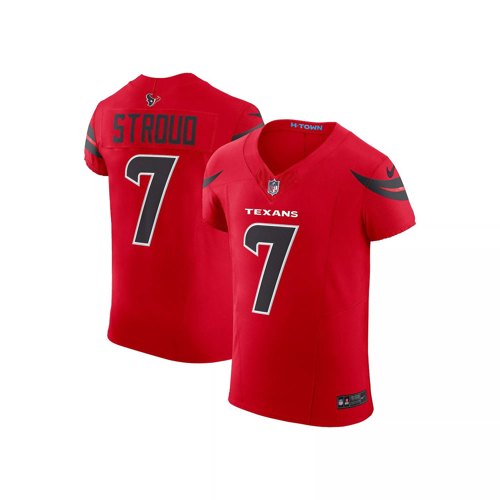 This C.J. Stroud Jersey brings your team's on-field look to you. An authentic design with 4-way stretch fabric helps give you the ideal look and feel. Its sweat-wicking technology and athletic cut help provide a comfortable experience on Houston Texans game day. Benefits:Nike Dri-FIT technology helps you stay dry, comfortable and focused. Laser perforations help maximize breathability. Vapor F.U.S.E. chassis delivers an authentic look and feel on game day. Product Details:Standard fit for a relaxed, easy feel. Metallic-effect NFL shield at V-neck. Premium twill name and numbers. Woven jock tag. 88% nylon/12% spandex. Machine wash. Imported. Style: 58NM0B9G9HF; Color: Red; Size: 44; Gender: Male; Age Group: Adult | C.J. Stroud Houston Texans Men's Nike Dri-FIT NFL Elite Football Jersey in Red, Size: 44 | 58NM0B9G9HF-CDK
