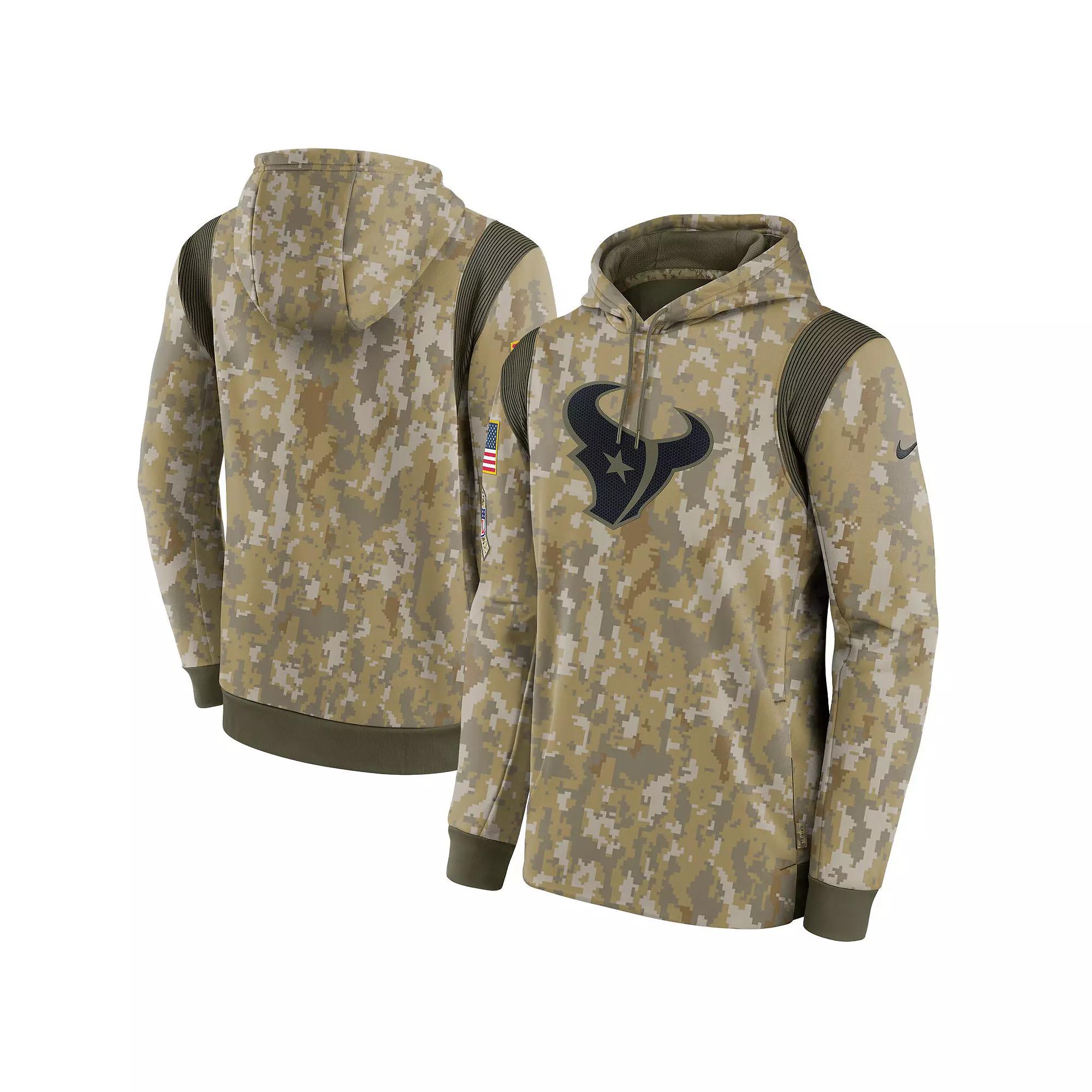 Honor our service members while supporting the Houston Texans with this Salute To Service Therma Performance Pullover Hoodie. This Nike top features a military-inspired color scheme, complete with the American flag and Salute To Service ribbon appliques. The fleece-lined body combines with Nike Therma fabric to help manage your body's natural heat while the Dri-FIT performance technology is designed to wick away moisture, leaving you warm and comfortable all game long. The NFL does not profit from the sale of Salute to Service products. Charitable contributions are awarded by the NFL Foundation to the NFL's military nonprofit partners. For more information, please visit www.NFL.com/causes/salute.Honor our service members while supporting the Houston Texans with this Salute To Service Therma Performance Pullover Hoodie. This Nike top features a military-inspired color scheme, complete with the American flag and Salute To Service ribbon appliques. The fleece-lined body combines with Nike Therma fabric to help manage your body's natural heat while the Dri-FIT performance technology is designed to wick away moisture, leaving you warm and comfortable all game long. The NFL does not profit from the sale of Salute to Service products. Charitable contributions are awarded by the NFL Foundation to the NFL's military nonprofit partners. For more information, please visit www.NFL.com/causes/salute.PRODUCT FEATURESFront pouch pocket with mesh liningOfficially licensedPrinted team logo on chestHoodedLong sleeveMachine wash, tumble dry lowDri-FIT technology wicks away moistureWoven team color clip tag at right pocketMaterial: 100% PolyesterFleece-lined body and sleevesRib-knit elastic panels at shoulder cuffsSewn-on woven flag and ribbon appliques on right sleevePulloverMidweight hoodie suitable for moderate temperaturesWoven On-Field Engineered clip tag at lower left sideBack neck taping with woven camo patternImportedHood with drawstring and mesh liningBrand: NikeEmbroidered Nike logo on left sleeveNike Therma fabric helps manage your body's natural heat to keep you warm Color: Green. Gender: male. Age Group: adult.
