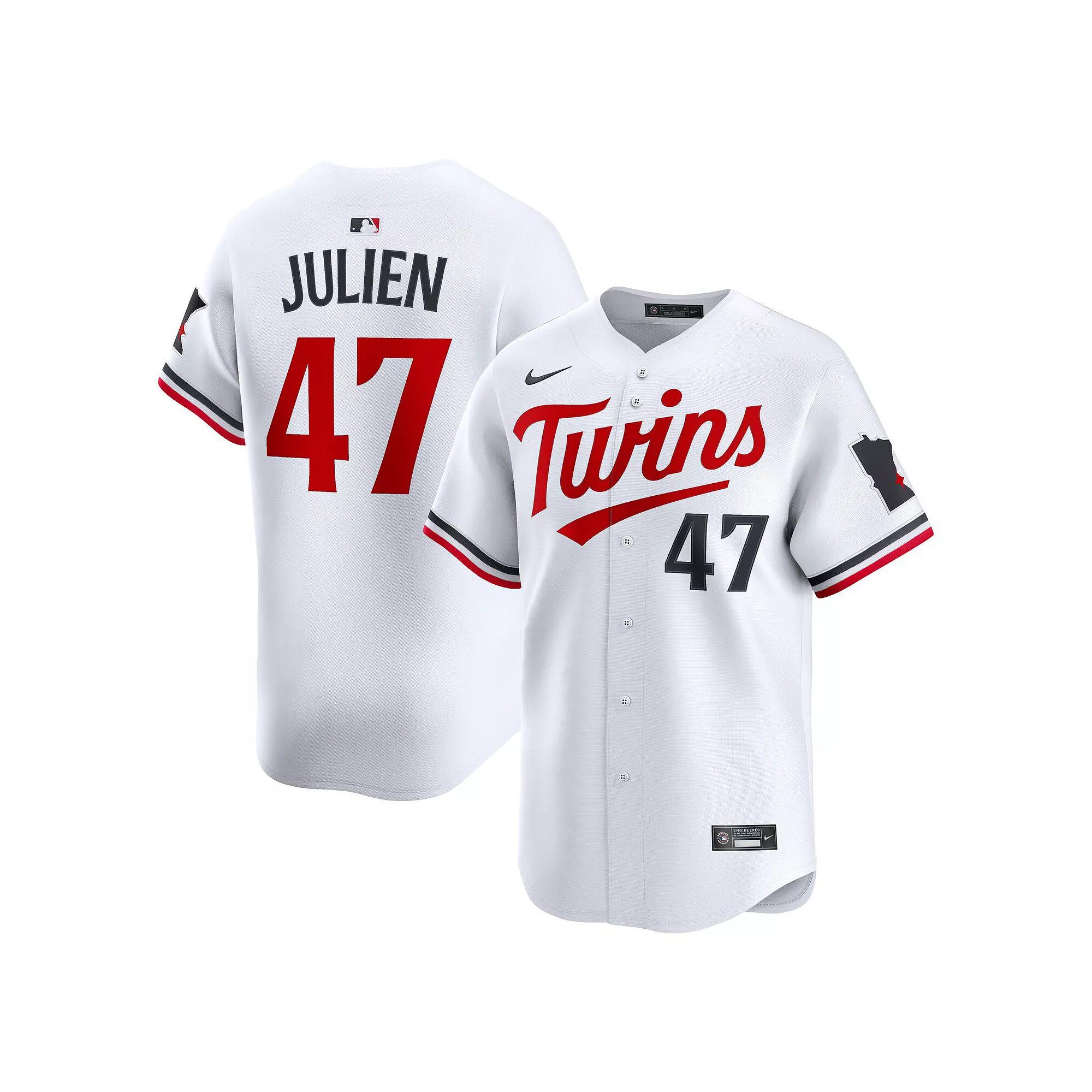 Give your Minnesota Twins look an upgrade with this Edouard Julien Home Limited Player Jersey by Nike. Designed to mirror the on-field jersey, its double-knit mesh fabric provides a breathable and comfortable feel. The Vapor Premier chassis allows for a full range of motion and teams up with Dri-FIT ADV technology to keep you cool and dry, whether you're in the stands or out on the town.Give your Minnesota Twins look an upgrade with this Edouard Julien Home Limited Player Jersey by Nike. Designed to mirror the on-field jersey, its double-knit mesh fabric provides a breathable and comfortable feel. The Vapor Premier chassis allows for a full range of motion and teams up with Dri-FIT ADV technology to keep you cool and dry, whether you're in the stands or out on the town.PRODUCT FEATURESVapor Premier chassis is made with breathable, high-performance fabric that improves mobility and moisture managementShort sleeveWoven jock tagNike LimitedEmbroidered Swoosh logoDri-FIT ADV technology combines moisture-wicking fabric with advanced engineering and features to help you stay dry and comfortableBrand: NikeFull-button frontMLB Batterman silhouette below back seam yokeOfficially licensedMaterial: 100% Recycled Polyester Double-Knit MeshStandard fitImportedRounded hemStitchless sleeve patchFaux stitch player name and numbersMove To Zero apparel labeled sustainable materials is made with at least 50% recycled content as part of Nike's journey toward a zero carbon and zero waste futureInspired by the on-field jersey using recycled trimsHeat-applied twill front logo or wordmark with faux stitchingPlayer name and number height is larger for 2025, ranging from 2.8-3.6 to match on-field jersey (previously 2)Machine wash, tumble dry lowJersey Color Style: Home Color: White. Gender: male. Age Group: adult. Material: COTTON.