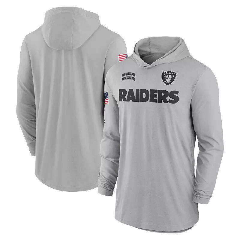 Featuring military-inspired details, the Las Vegas Raiders Salute to Service Edge Mascot Lockup Top combines soft, lightweight material with sweat-wicking technology to help keep you dry and comfortable. Benefits:Nike Dri-FIT technology moves sweat away from your skin for quicker evaporation, helping you stay dry and comfortable. Drop-tail hem helps provide proper coverage. Product Details:60% cotton/40% polyester. Machine wash. Imported. Style: 02G904RA2Q; Color: Flat Silver; Size: S; Gender: Male; Age Group: Adult | Las Vegas Raiders Salute to Service Edge Mascot Lockup Men’s Nike Dri-FIT NFL Long-Sleeve Hooded Top in Grey, Size: Small | 02G904RA2Q-6QC