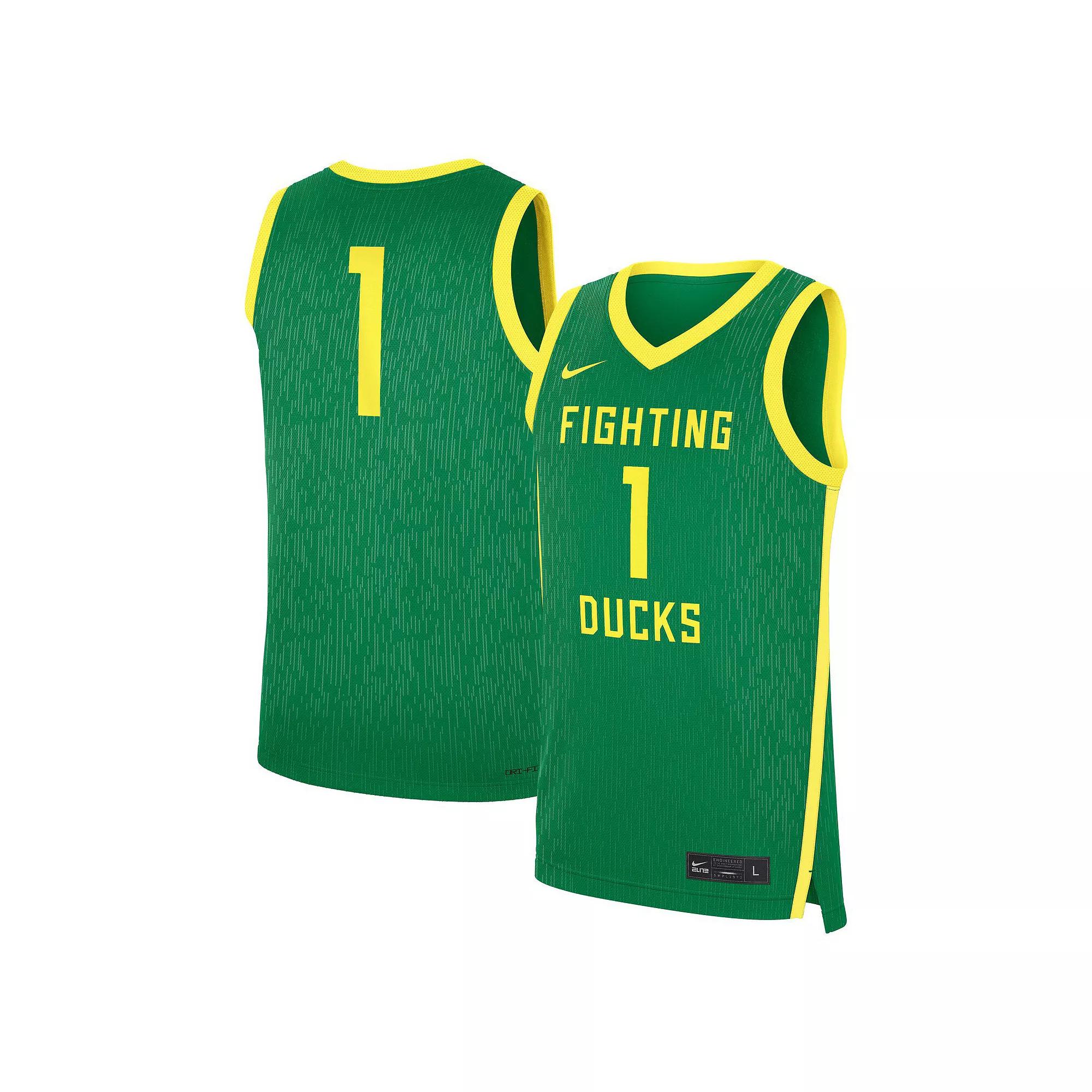 Hit the court like your favorite collegiate team in this Oregon Ducks Road Replica Basketball Jersey from Nike. Its built with lightweight, breathable mesh side panels and double-knit fabric for added structure and stability. Dri-FIT technology wicks away moisture to keep you dry and comfortable, whether youre cheering for the Oregon Ducks or dominating a pickup game.Hit the court like your favorite collegiate team in this Oregon Ducks Road Replica Basketball Jersey from Nike. Its built with lightweight, breathable mesh side panels and double-knit fabric for added structure and stability. Dri-FIT technology wicks away moisture to keep you dry and comfortable, whether youre cheering for the Oregon Ducks or dominating a pickup game.PRODUCT FEATURESOfficially licensedReplicaJersey Color Style: RoadDri-FIT technology wicks away moistureMaterial: 100% PolyesterMachine wash, line dryMove To Zero is Nikes journey toward zero carbon and zero waste to help protect the future of sport. Apparel labeled sustainable materials is made with at least 55% recycled content.Heat-sealed team name and numberWoven jock tagDroptail hem with side splitsBrand: NikeSleevelessMesh side paneling creates a lightweight, breathable feelDouble-knit fabric adds structure and stabilityImported Color: Green. Gender: male. Age Group: adult.