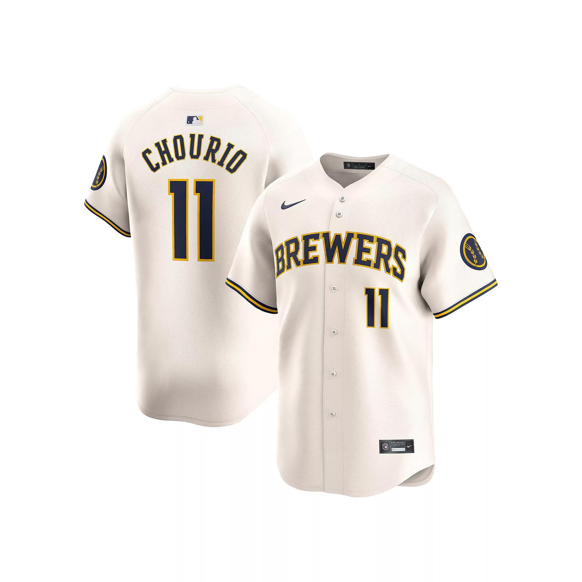 Inspired by the on-field uniforms of the Milwaukee Brewers, this Jackson Chourio Jersey delivers an authentic look with twill details. The sweat-wicking, double-knit mesh fabric helps provide a breathable, comfortable feel on game day. Benefits:Nike Dri-FIT ADV technology combines moisture-wicking fabric with advanced engineering and features to help you stay dry and comfortable. Vapor Premier chassis is a breathable, high-performance fabric that helps improve mobility and moisture management. Recycled twill details help provide a more authentic look and feel. Product Details:Heat-applied MLB Batterman logo. Tagless neck label. Woven jock tag. 100% recycled polyester. Machine wash. Imported. Style: T7LMMZHOMZ9; Color: Cream; Size: S; Gender: Male; Age Group: Adult | Jackson Chourio Milwaukee Brewers Men's Nike Dri-FIT ADV MLB Limited Jersey in Brown, Size: Small | T7LMMZHOMZ9-XB7