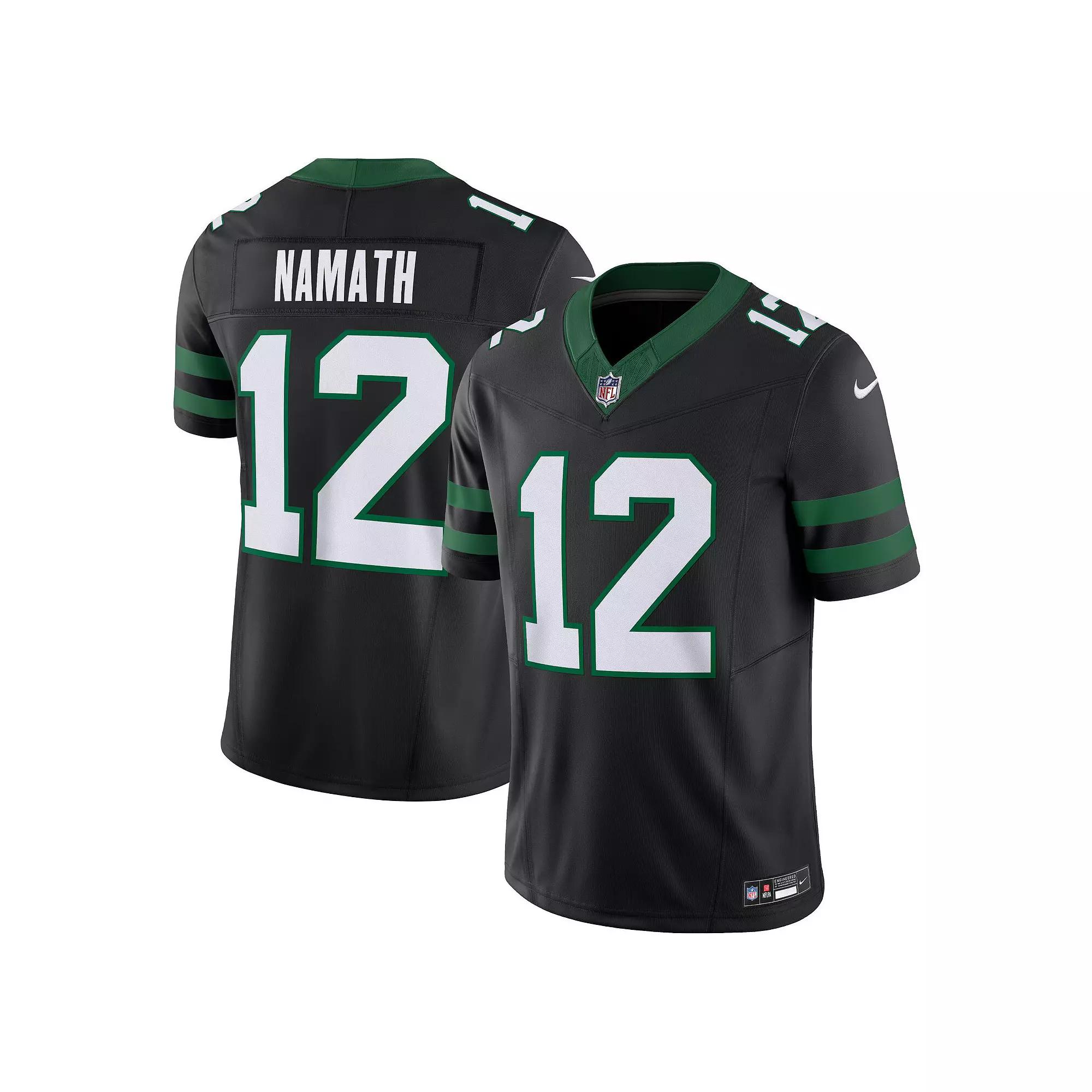 Ensure youre outfitted in the most authentic New York Jets gear by grabbing this Joe Namath Elite jersey. Made to match the on-field uniform, this Nike piece features premium tackle twill team and player graphics that highlight your passion. The Dri-FIT technology and Vapor F.U.S.E. chassis help keep you feeling your best while you support your team this season.Ensure youre outfitted in the most authentic New York Jets gear by grabbing this Joe Namath Elite jersey. Made to match the on-field uniform, this Nike piece features premium tackle twill team and player graphics that highlight your passion. The Dri-FIT technology and Vapor F.U.S.E. chassis help keep you feeling your best while you support your team this season.PRODUCT FEATURESShort sleeveMachine wash, line dryMove To Zero is Nikes journey toward zero carbon and zero waste to help protect the future of sport. Apparel labeled sustainable materials is made with at least 55% recycled content.Laser-perforated panels for lightweight zoned breathabilityImportedNike LimitedElastic sleeve bandsBrand: NikeMaterial: 88% Polyester 12% SpandexAthletic cut fits snug in the chest and shouldersFour-way stretch fabricDri-FIT technology wicks away moistureStitched team patches and embroidered detailsPremium tackle twill player name and numbersSatin woven jock tagJersey Color Style: AlternateVapor F.U.S.E. chassis delivers an authentic look and feel on game dayChainmaille mesh grill and stitched metallic effect NFL Shield at collarOfficially licensed Size: XL. Color: Black. Gender: male. Age Group: adult.