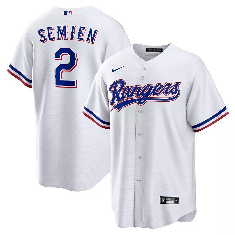 Whether you're watching from the couch or within the stadium, you'll be the biggest Texas Rangers fan around when you sport this Marcus Semien Home Replica Player Jersey! This Nike jersey features bold Texas Rangers graphics that will showcase your team pride no matter where you watch the game. This jersey would make a great addition to any Texas Rangers fan's closet.Whether you're watching from the couch or within the stadium, you'll be the biggest Texas Rangers fan around when you sport this Marcus Semien Home Replica Player Jersey! This Nike jersey features bold Texas Rangers graphics that will showcase your team pride no matter where you watch the game. This jersey would make a great addition to any Texas Rangers fan's closet.PRODUCT FEATURESMachine wash gentle or dry clean. Tumble dry low, hang dry preferred.Brand: NikeTagless CollarMLB Batterman applique on center back neckFull-button frontShort sleeveHeat-sealed transfer appliqueOfficially licensedMaterial: 100% PolyesterRounded hemHeat-sealed jock tagImported Color: White. Gender: male. Age Group: adult.